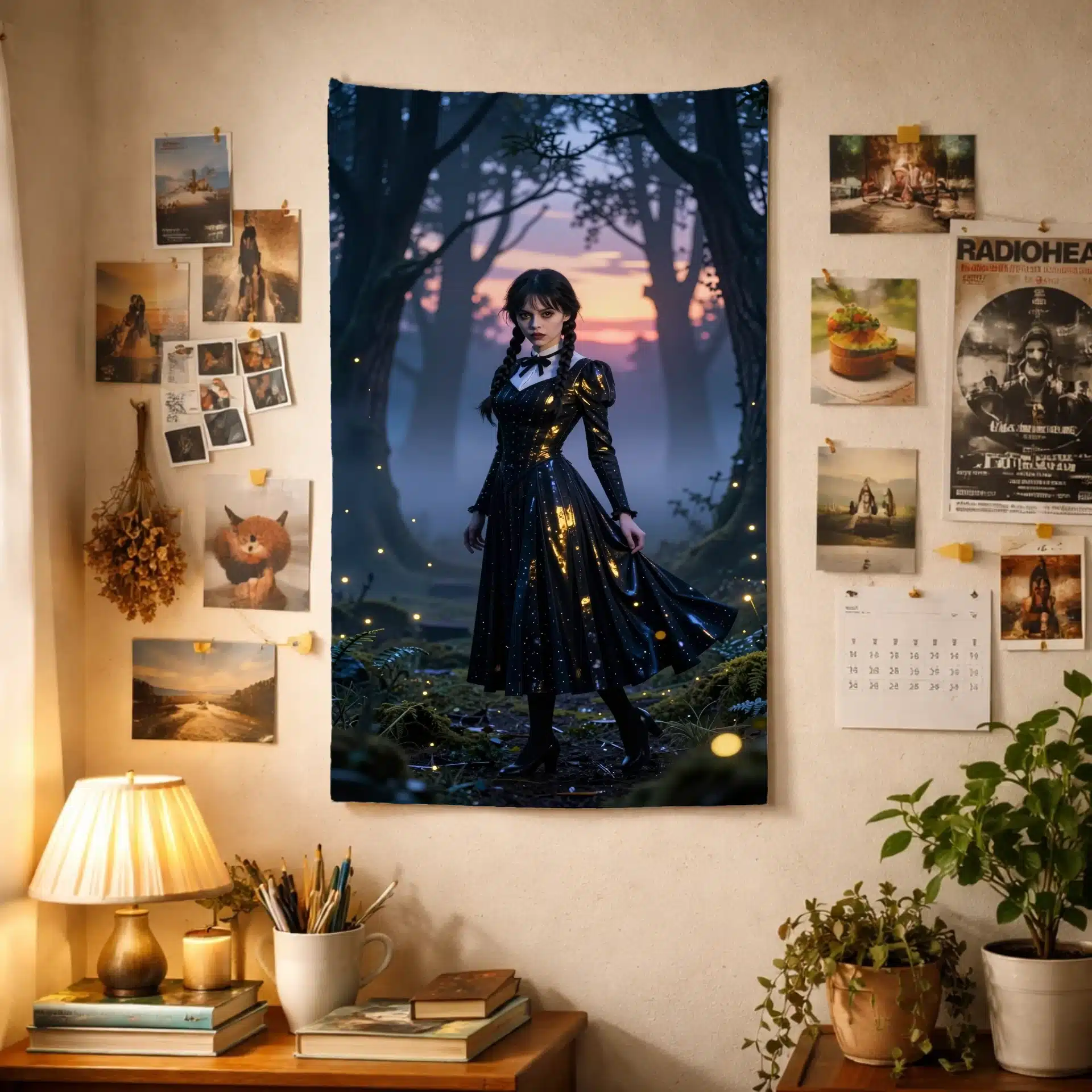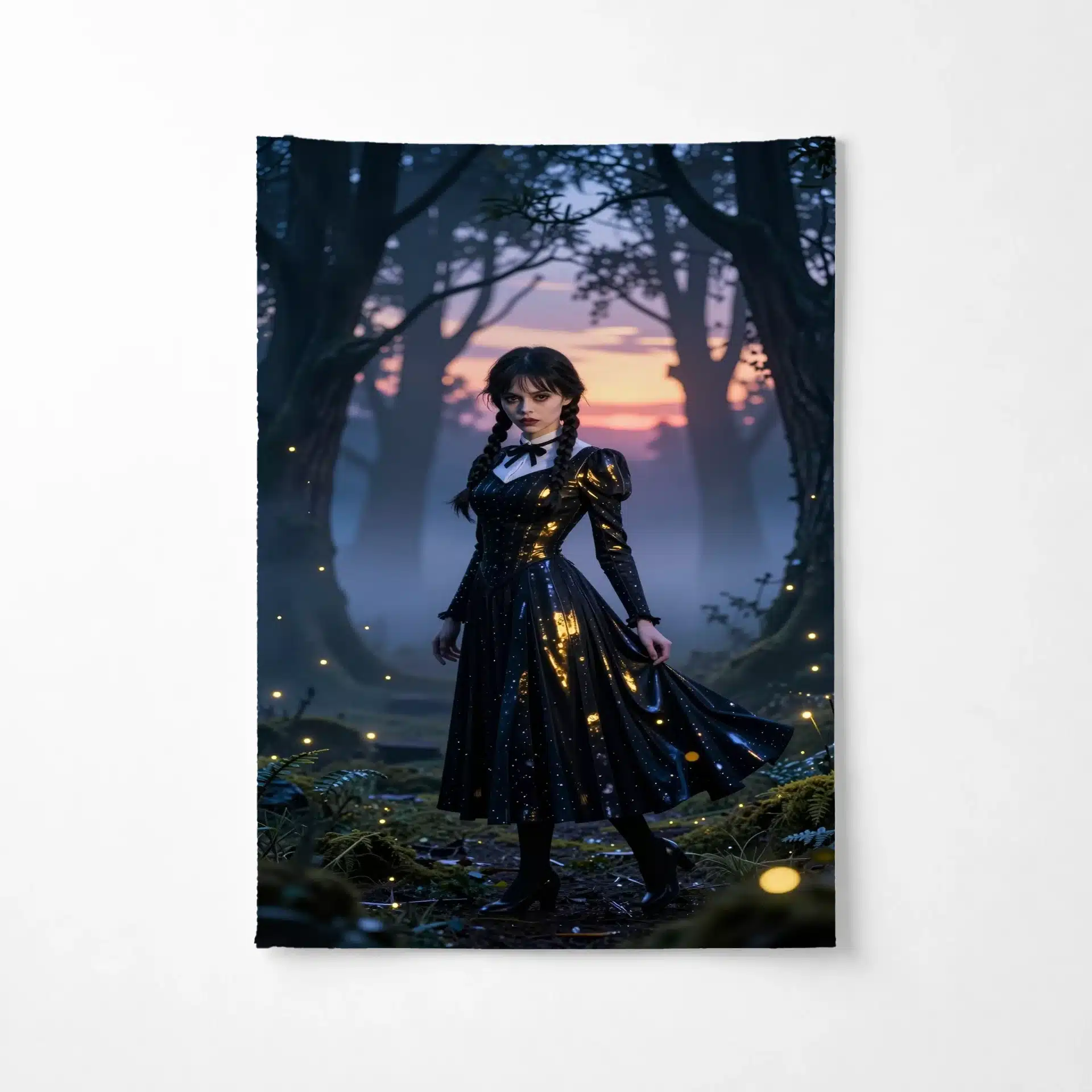 ونزدی آدامز در یک جنگل افسونشده و مهآلود در گرگومیش غروب، زیر نور سورئال غروب خورشید با هایلایتهای فلورسنت خنک ایستاده است. لباس سیاه نمادین او با ظرافت در حال حرکت است و انعکاس طلایی نور خورشید را به نمایش میگذارد، در حالی که نگاه نافذش با سایههای آبی عمیق درختان بلند تضاد زیبایی ایجاد میکند.