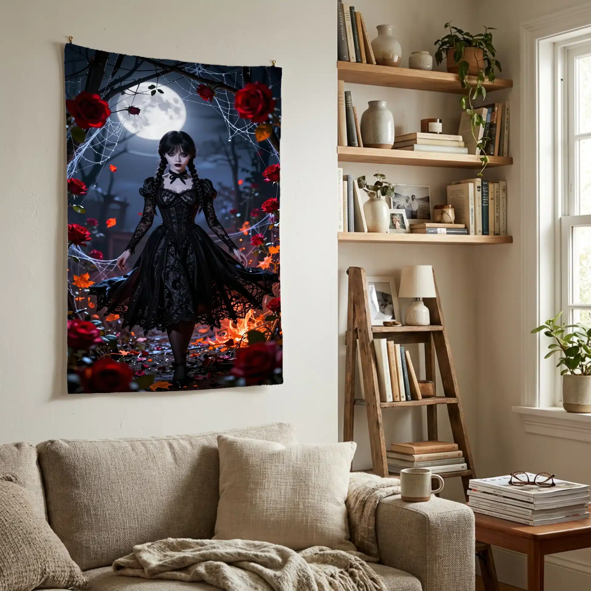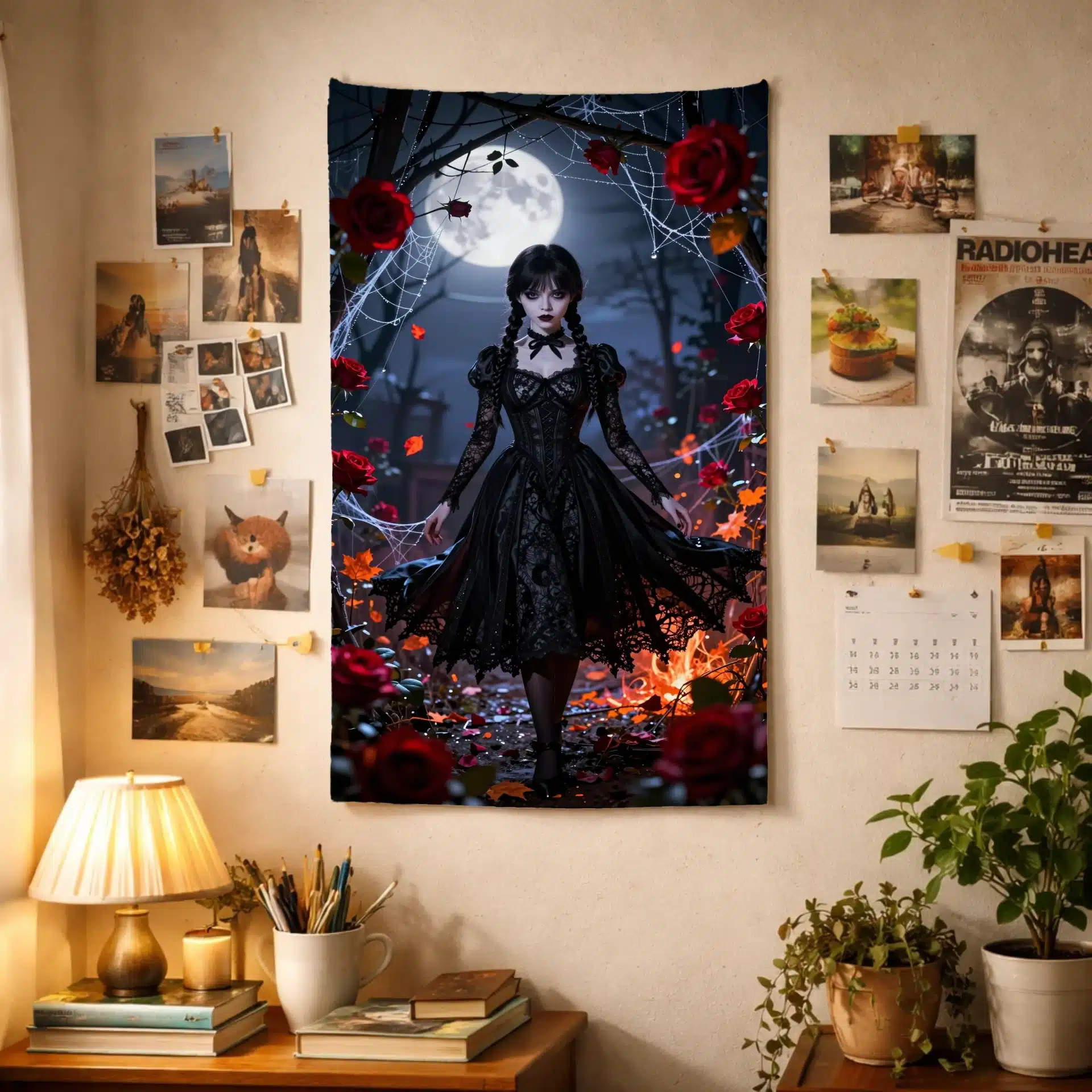 این بکدراپ خیرهکننده از ونزدی آدامز، شخصیت محبوب سریال ‘ونزدی’، صحنهای رویایی را در یک باغ اسرارآمیز به تصویر میکشد. او با لباس سیاه تزئینشده با تورهای ظریف، زیر نور مهتاب فلوئورسنت ایستاده و نگاهی نافذ و مرموز به بیننده دارد.