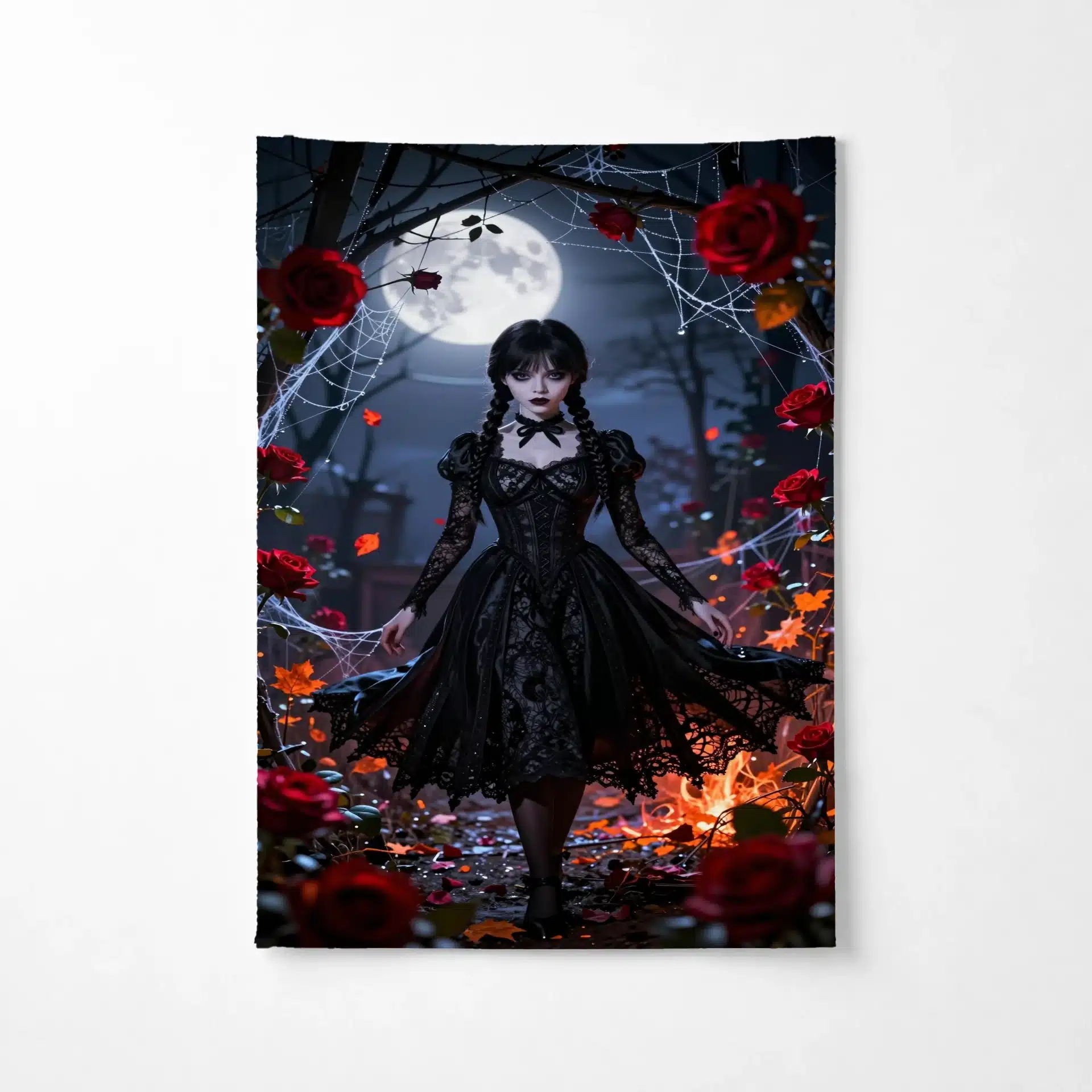 طرح با جزئیات فوقالعاده و بافتهای واقعگرایانه، شامل گلهای رز قرمز و برگهای پاییزی است که بهحالت گردابی از رنگهای سیاه و نارنجی درآمدهاند. تارهای عنکبوت با شبنم درخشان و نورپردازی سینمایی، فضایی تاریک و جذاب خلق کردهاند.