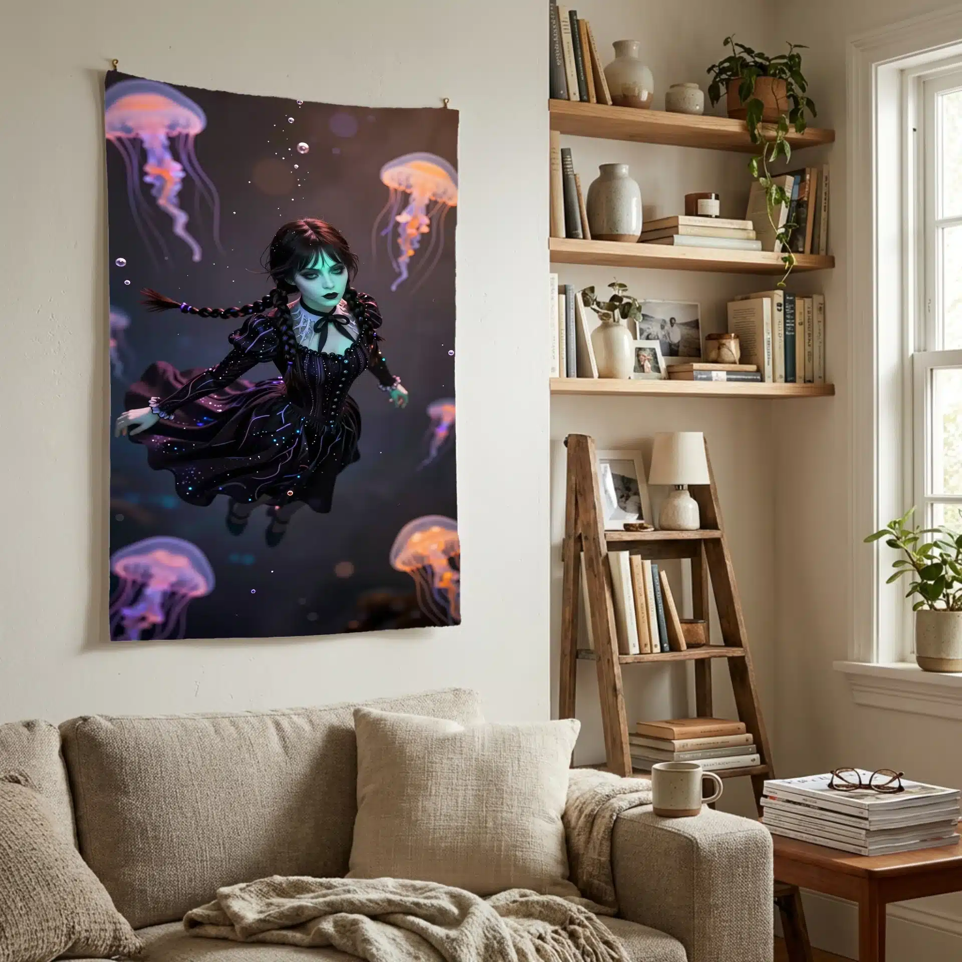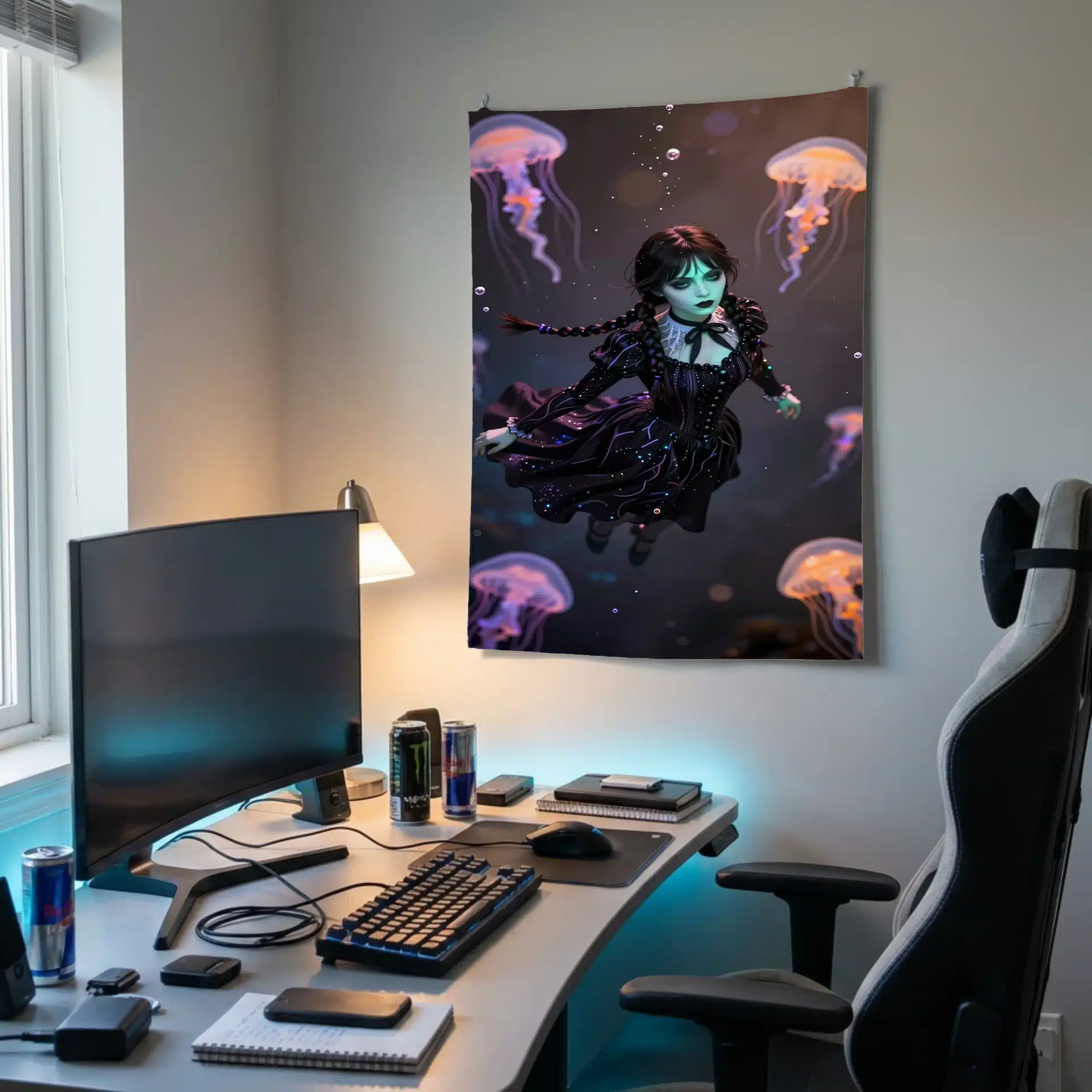 این بکدراپ خیرهکننده از ونزدی آدامز در یک صحنه زیرآبی رویایی طراحی شده است. با الهام از سبک انیمه، این تصویر ترکیبی جذاب از زیبایی گوتیک و عناصر سورئال را ارائه میدهد که برای والپیپر موبایل ایدهآل است.