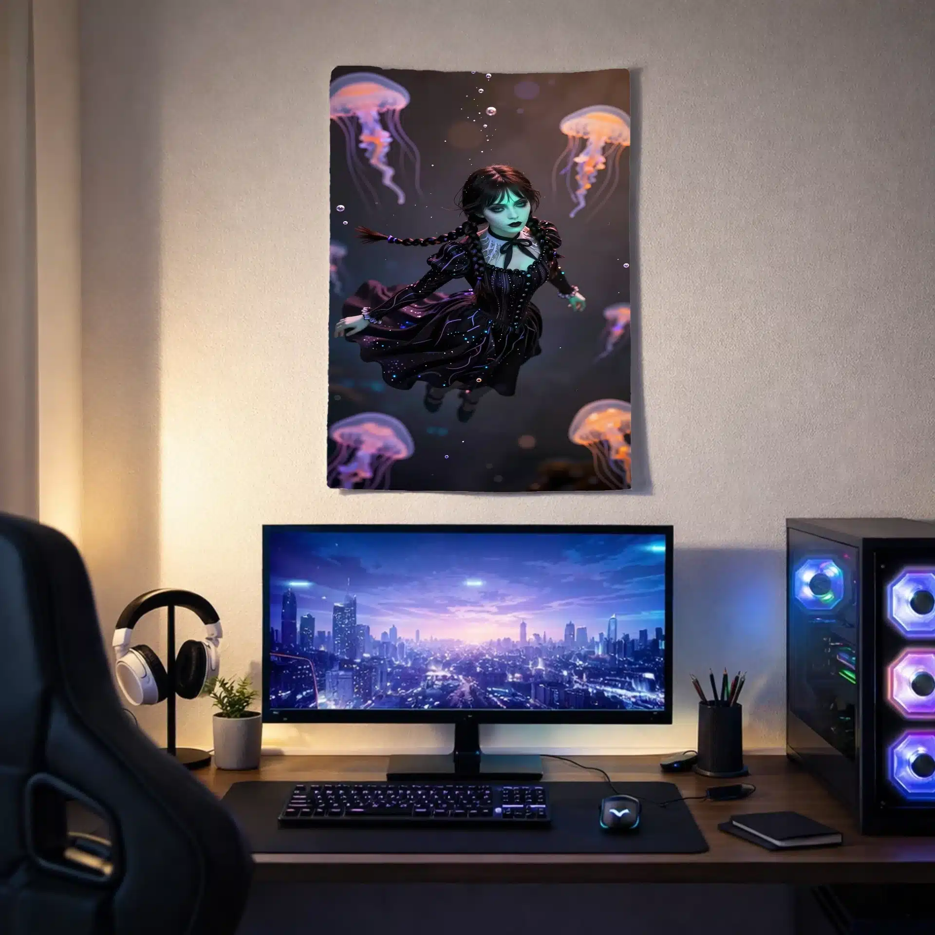 طراحی فوقالعاده دقیق با نورپردازی بیولومینسانس آبی-سبز روی صورت ونزدی و ژلهماهیهای بنفش و نارنجی که با جلوههای نور بوکه احاطه شدهاند. بافتهای فوق واقعی آب و حبابهای ظریف، فضایی جادویی و رویایی خلق کردهاند.