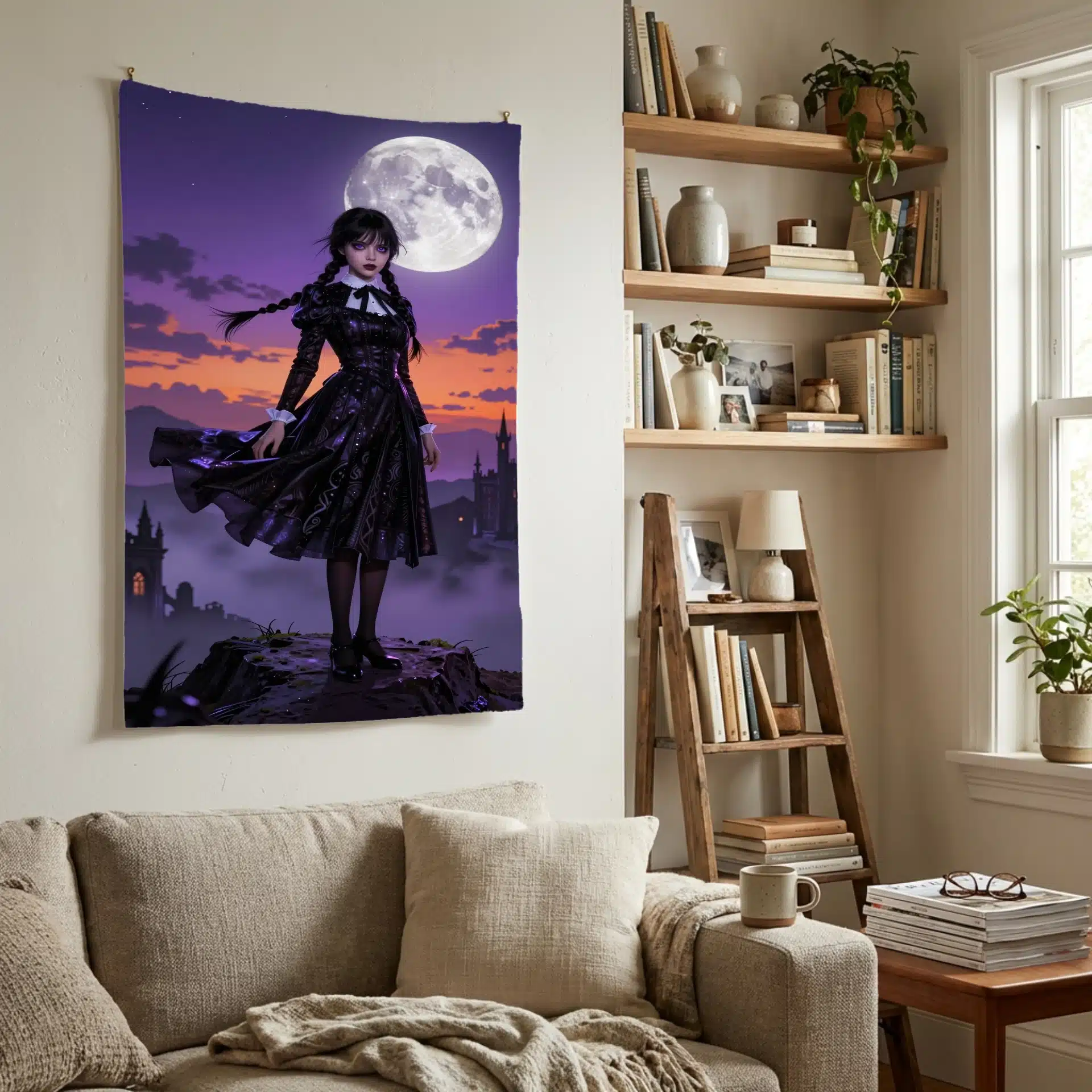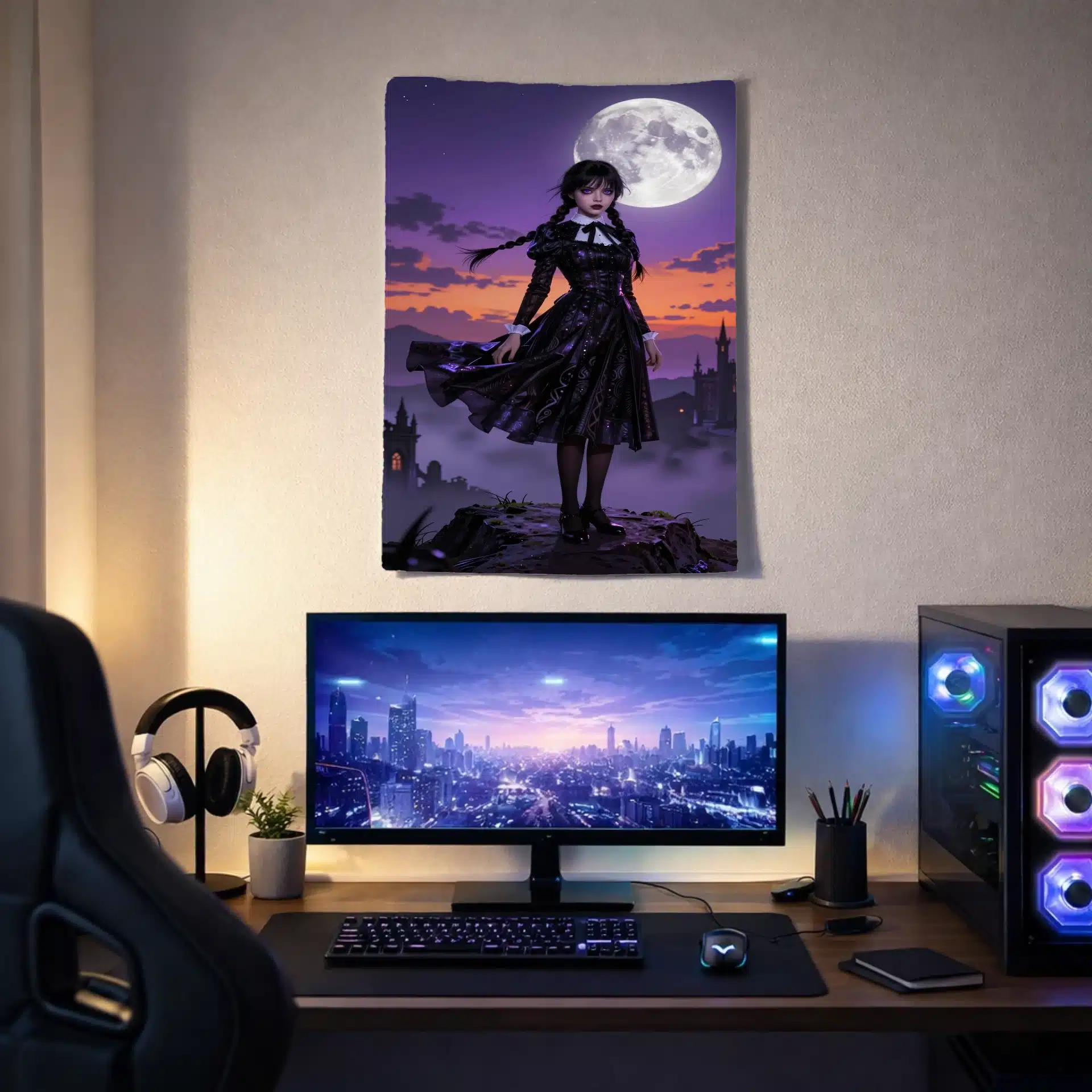 این بکدراپ خیرهکننده از ونزدی آدامز، شخصیت محبوب سریال معروف، در یک صحنه حماسی و پررمزوراز به تصویر کشیده شده است. او بر فراز قلهای ماهتابان ایستاده، با لباس سیاه نمادینش که در باد به نمایش درآمده و نور نئونی مرموزی او را احاطه کرده است.