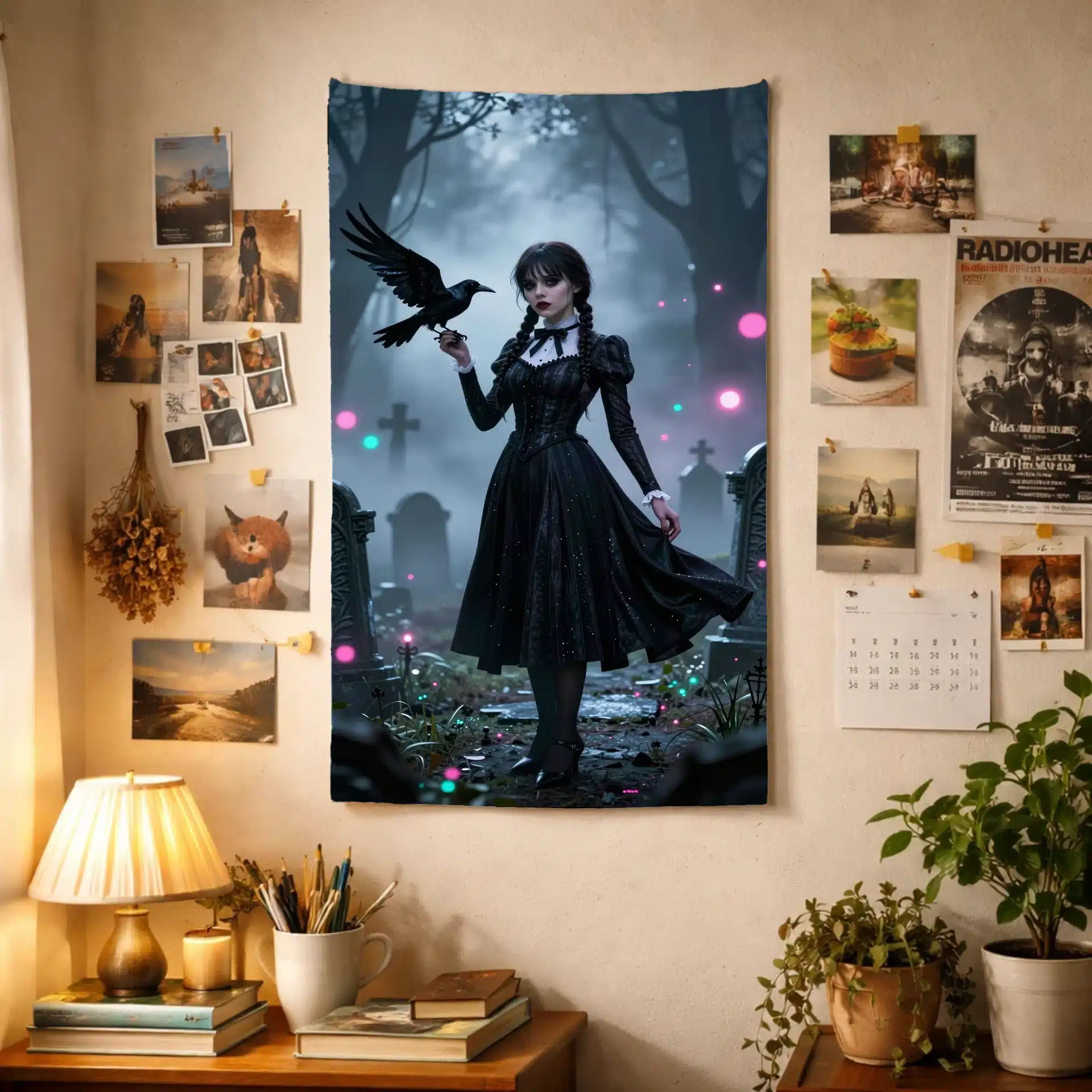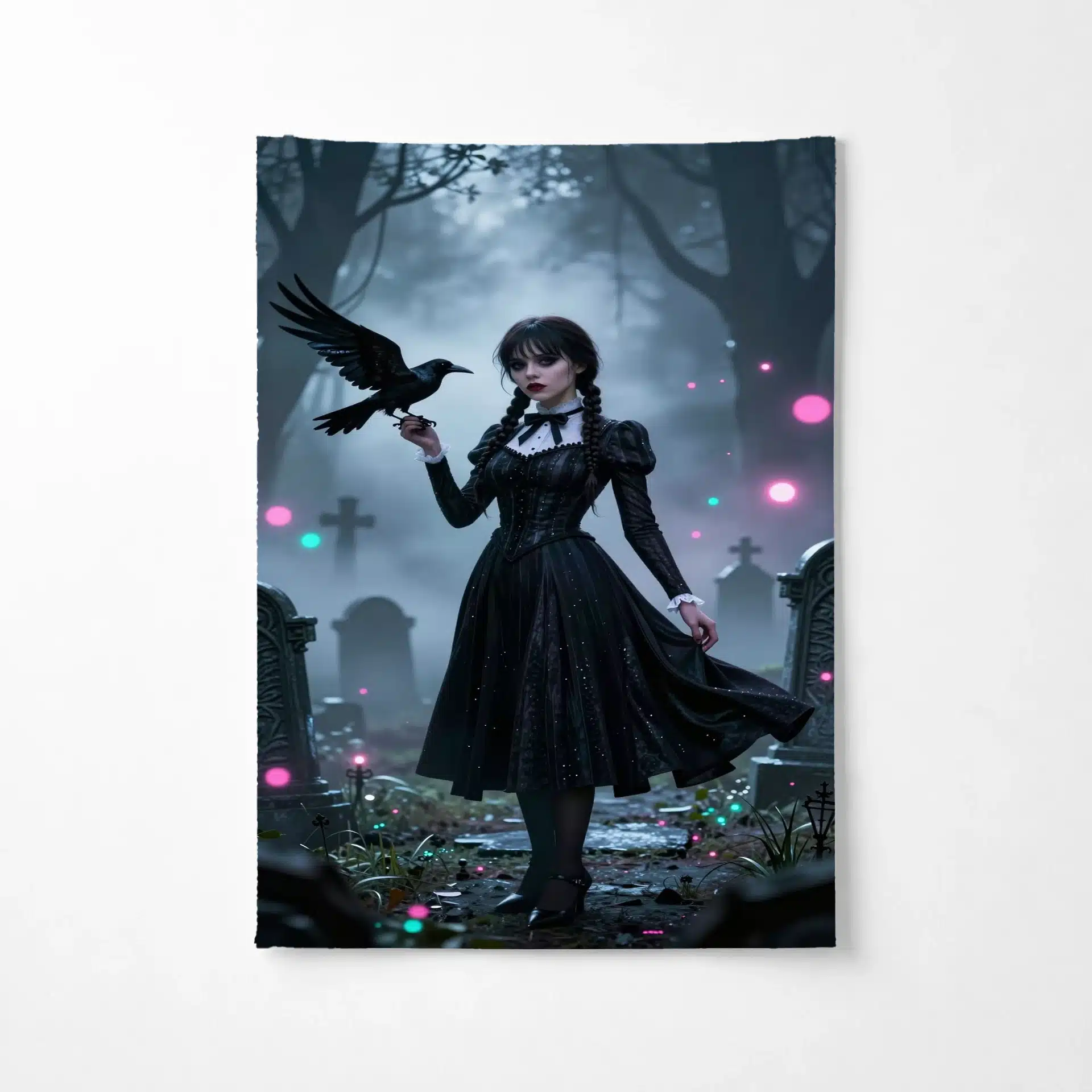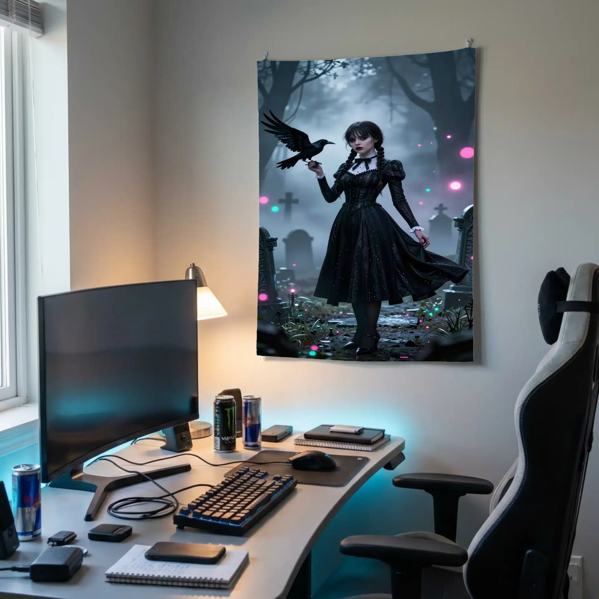 ونزدی با لباس سیاه نمادین خود در حالی که یک کلاغ در دست دارد، در میان مه و نورهای قبرستان گوتیک ایستاده است. حلقههای بوکه درخشان و عمق سینمایی ناشی از فشردهسازی تلهفوتو، این تصویر را به یک والپیپر بینظیر تبدیل کردهاند.