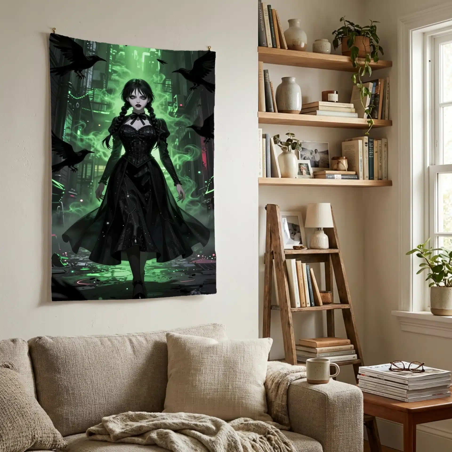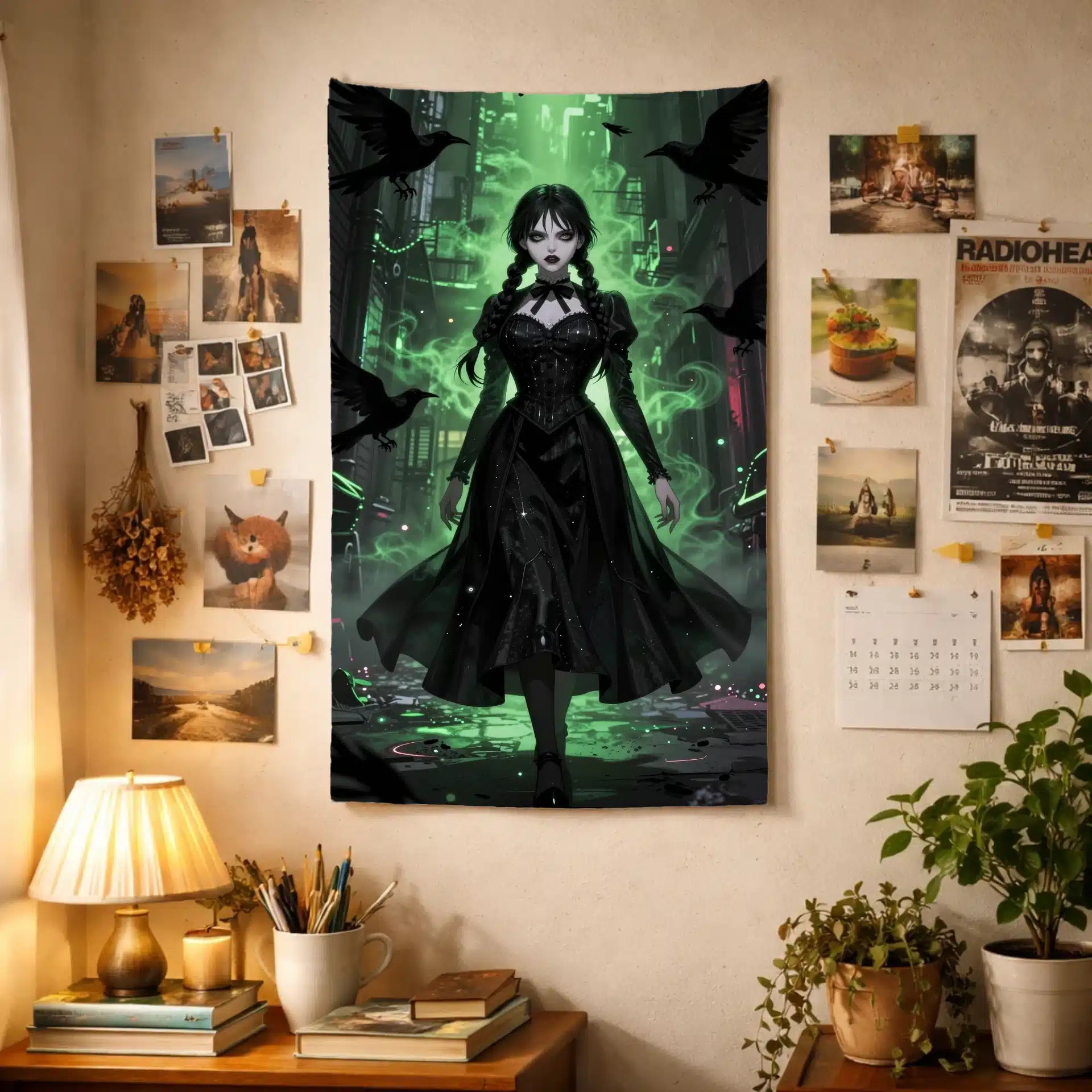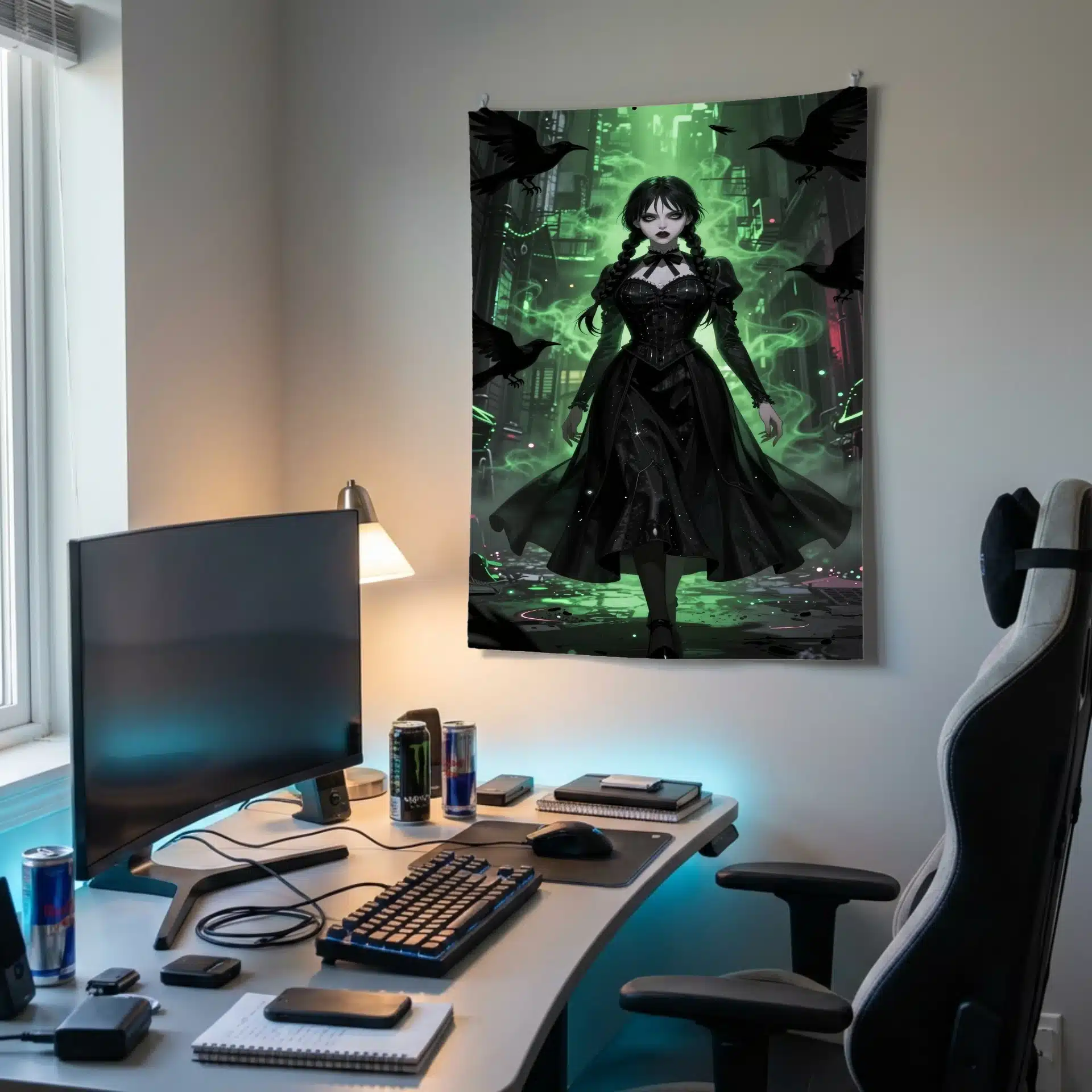 ونزدی با لباس سیاه نمادین خود در میان مه سبز درخشان و سایههای قرمز رنگ قرار گرفته، در حالی که کلاغهای سیاه و اثرات ذرهای mystical به تصویر عمق و رمزآلودگی میبخشند. جزئیات فوقالعاده واقعگرایانه و نورپردازی دراماتیک، این اثر را به یک والپیپر بینظیر تبدیل کرده است.