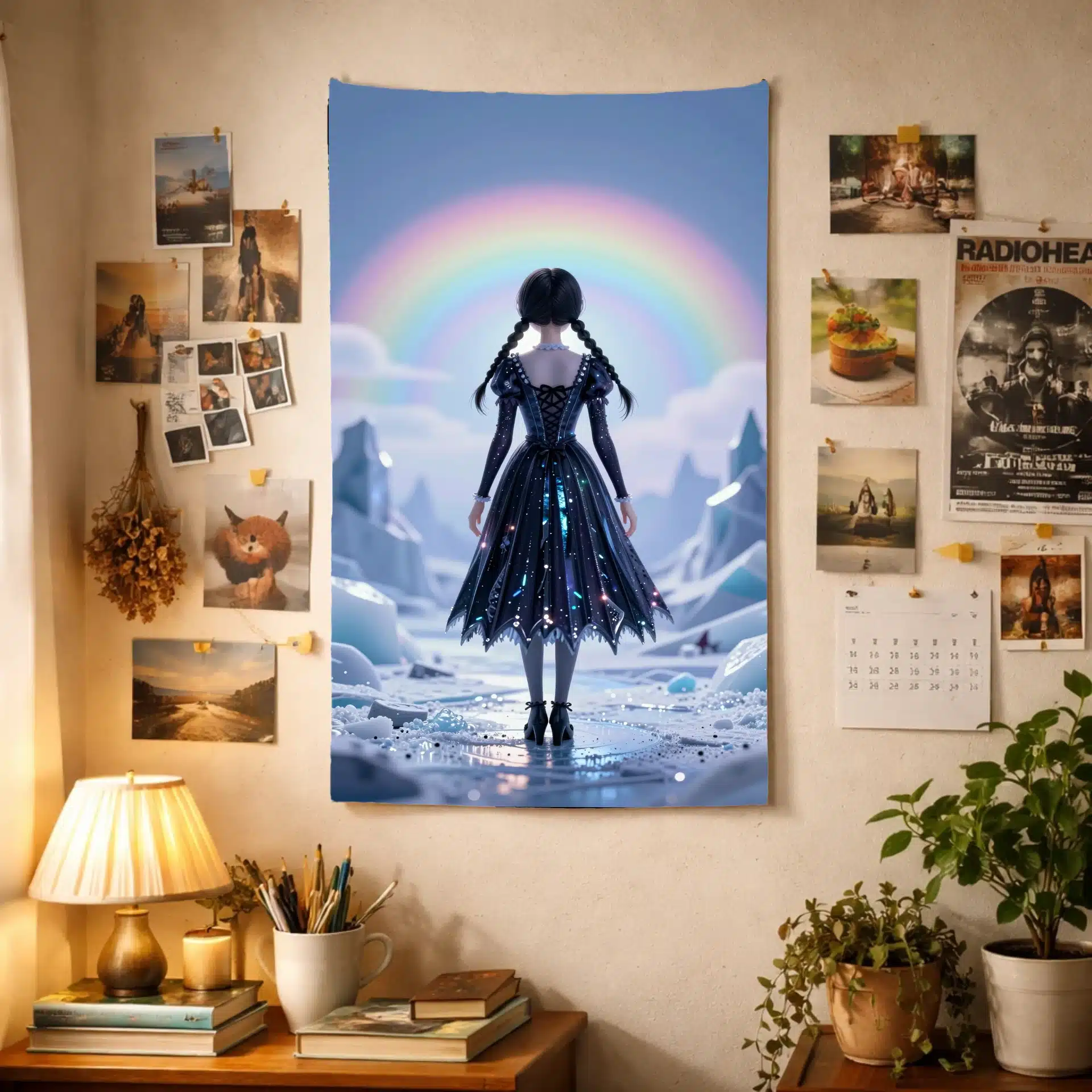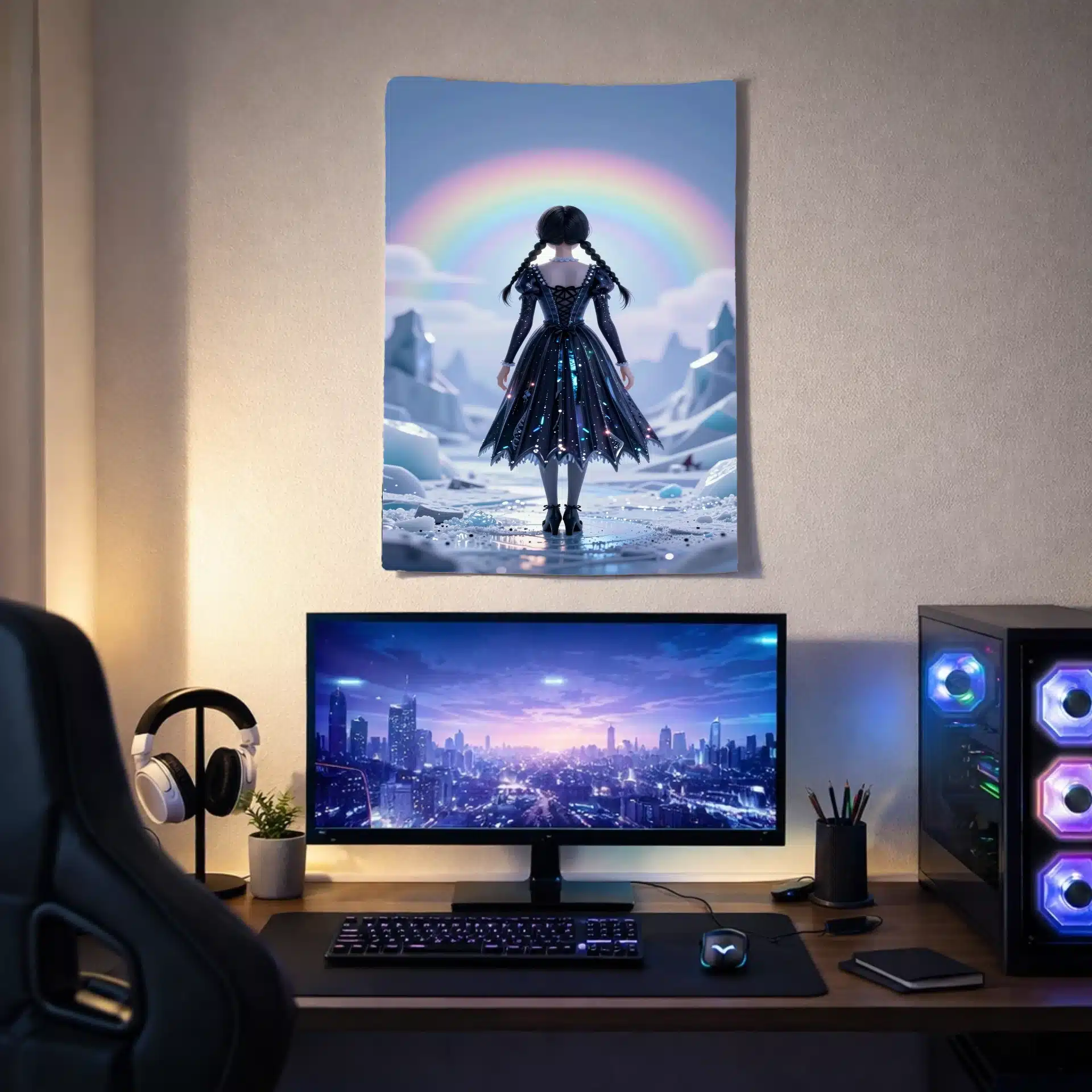 طرح شامل جزئیات دقیق از موهای بافتهی نمادین و لباس گوتیک ونزدی است که با هایلایتهای آبی-یخی و نقرهای مشخص شدهاند. این اثر هنری دیجیتال 8K، ترکیبی از ظرافت مرموز و سوررئالیسم رویایی است.