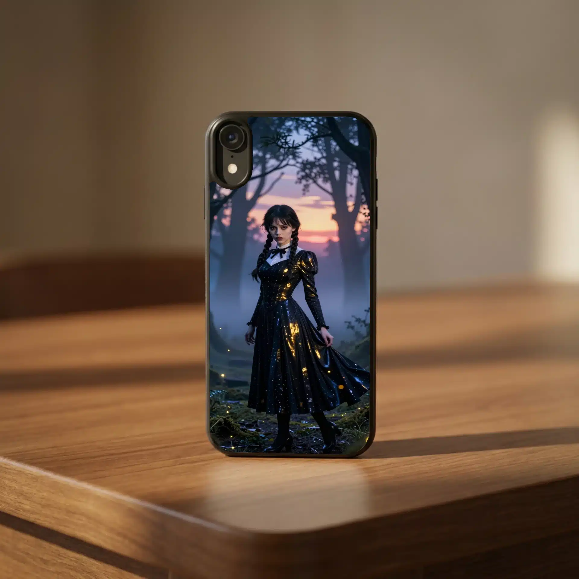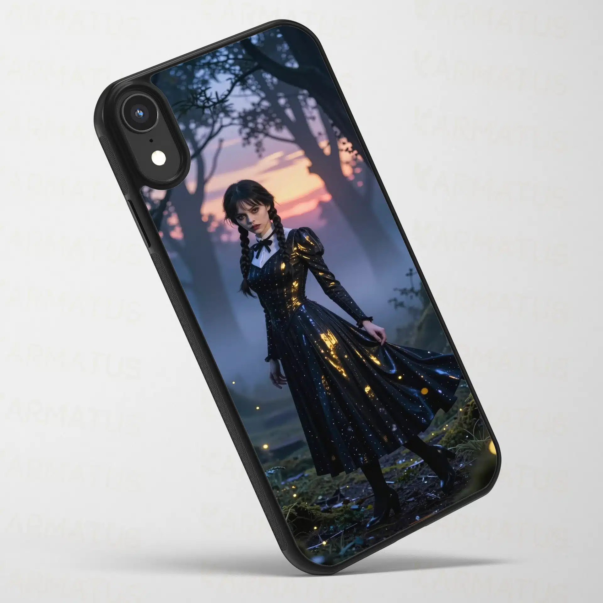 ونزدی آدامز در یک جنگل افسونشده و مهآلود در گرگومیش غروب، زیر نور سورئال غروب خورشید با هایلایتهای فلورسنت خنک ایستاده است. لباس سیاه نمادین او با ظرافت در حال حرکت است و انعکاس طلایی نور خورشید را به نمایش میگذارد، در حالی که نگاه نافذش با سایههای آبی عمیق درختان بلند تضاد زیبایی ایجاد میکند.