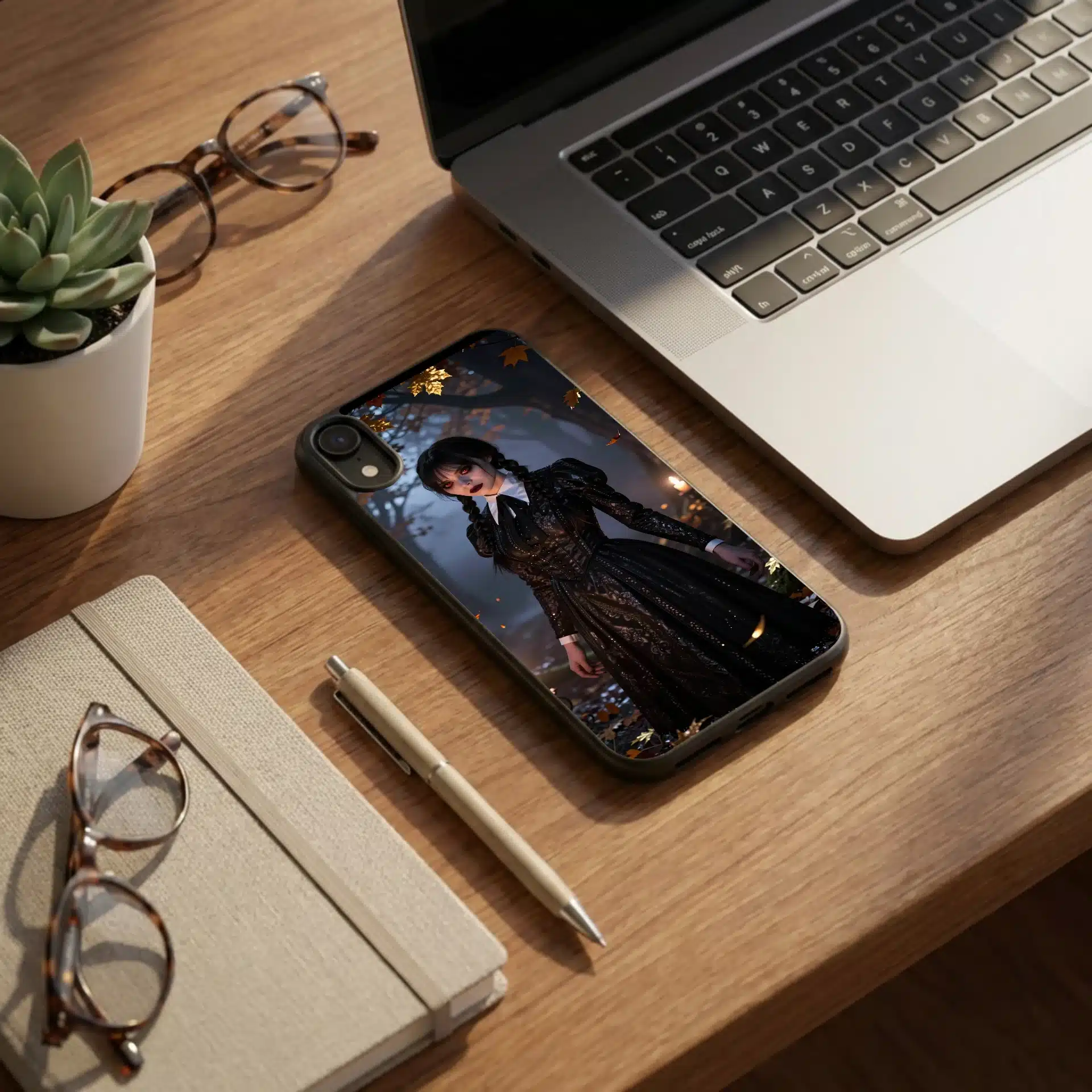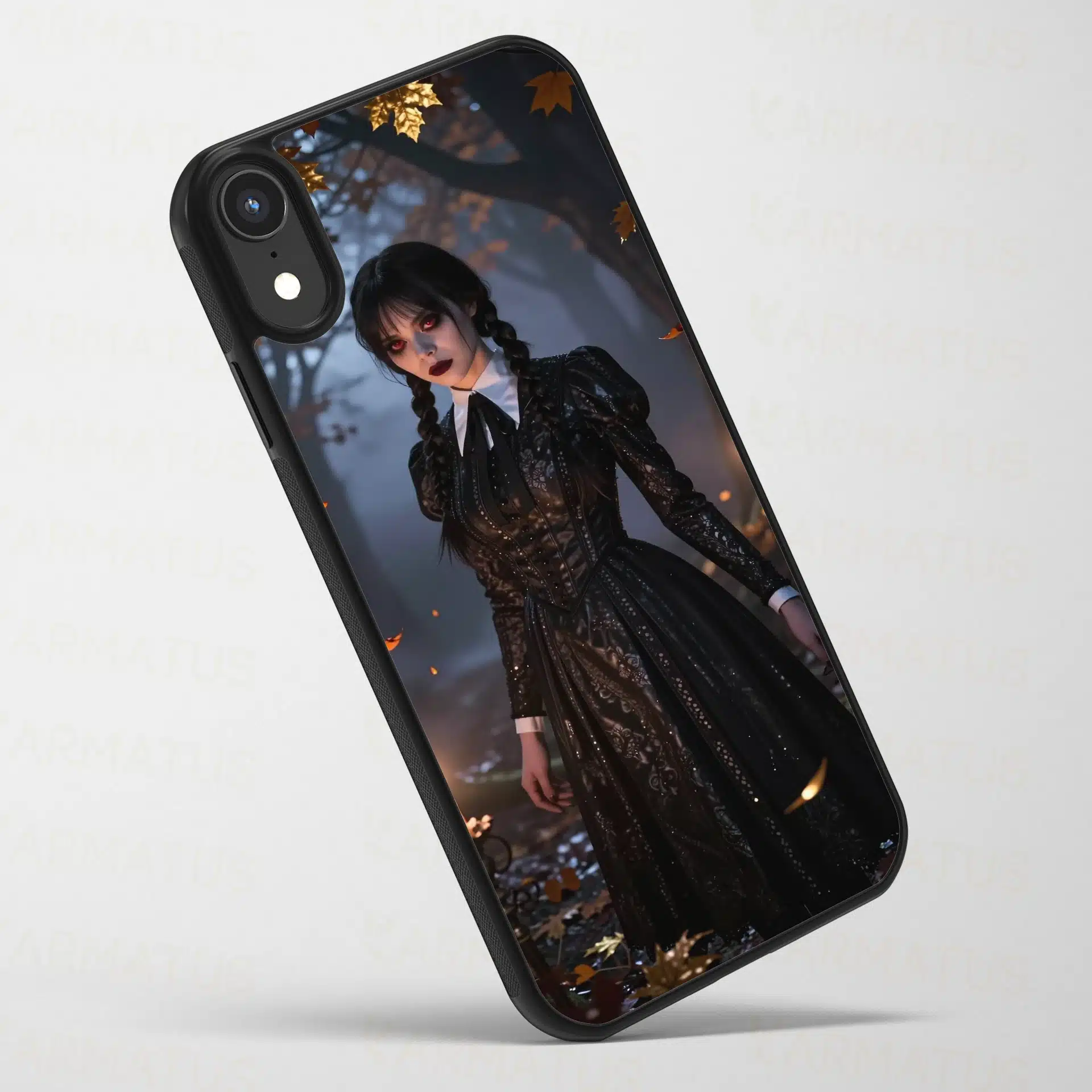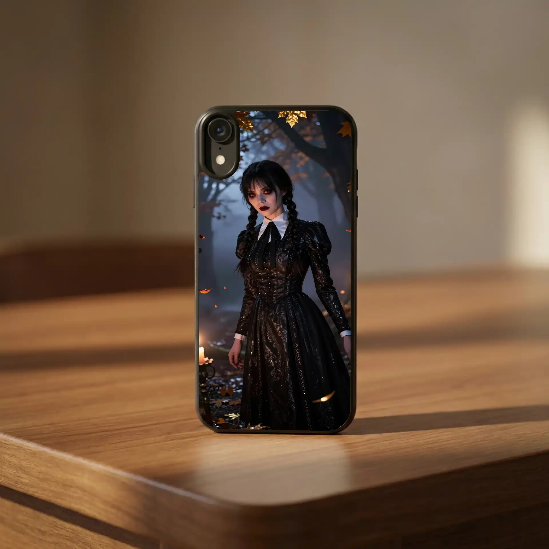 طراحی با جزئیات فوقالعاده شامل لباس سیاه نمادین با یقه سفید تیز، برگهای پاییزی با جلوه فلزی طلایی و بافتهای فوق واقعگرایانه. ترکیببندی سینمایی با زاویه داچ، رنگهای زمینی غنی و مشکیهای عمیق، همراه با جزئیات گوتیک ظریف در هوا شناور.