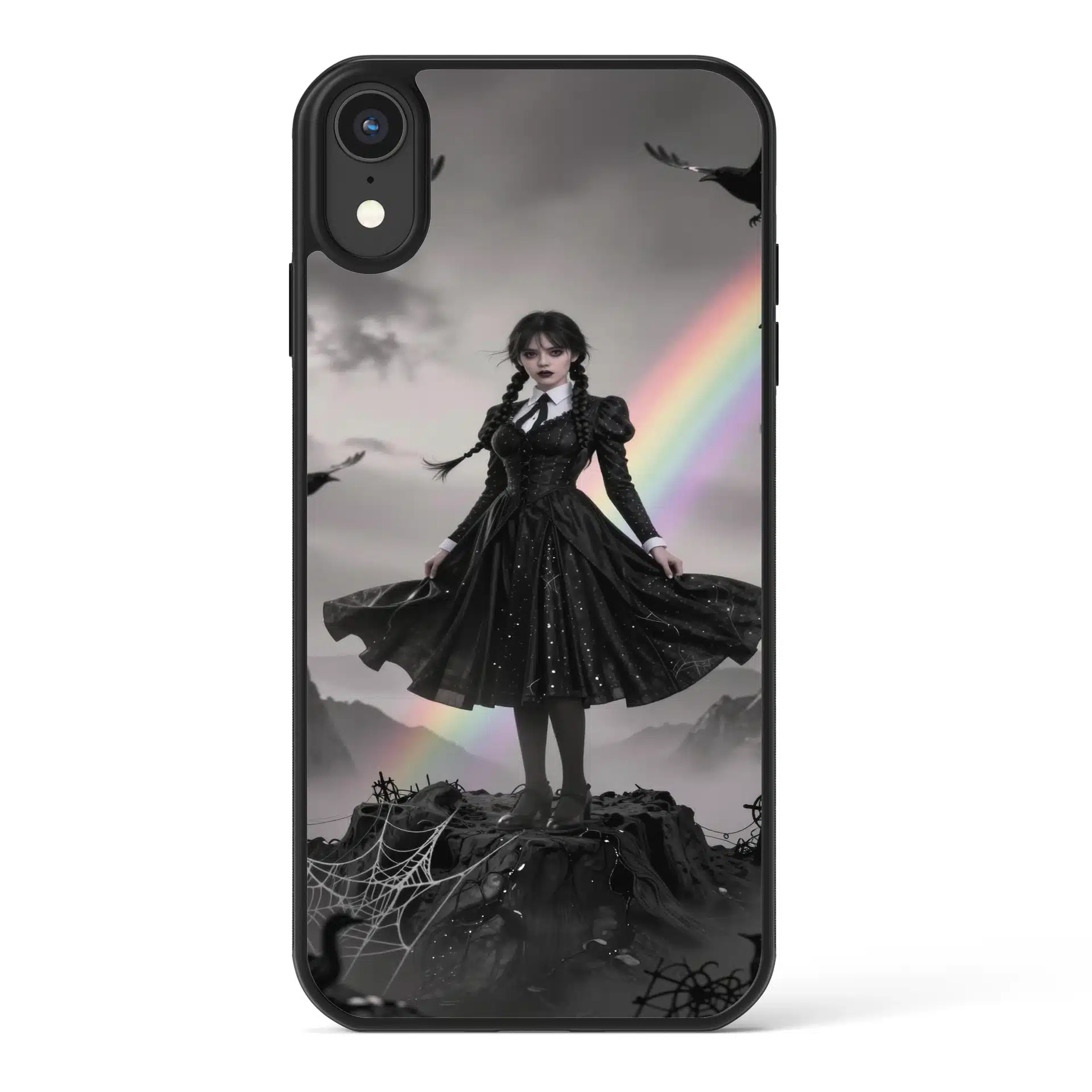 ونزدی آدامز در اوج یک قله کوه مهآلود در گرگومیش ایستاده است، با لباس سیاه نمادینش که در باد به نمایشی در حرکت است. این صحنه با نوری رنگی از طیفهای پاستلی که از میان مناظر تک میدرخشد، روشن شده و حالوهوایی مرموز و جذاب ایجاد میکند.