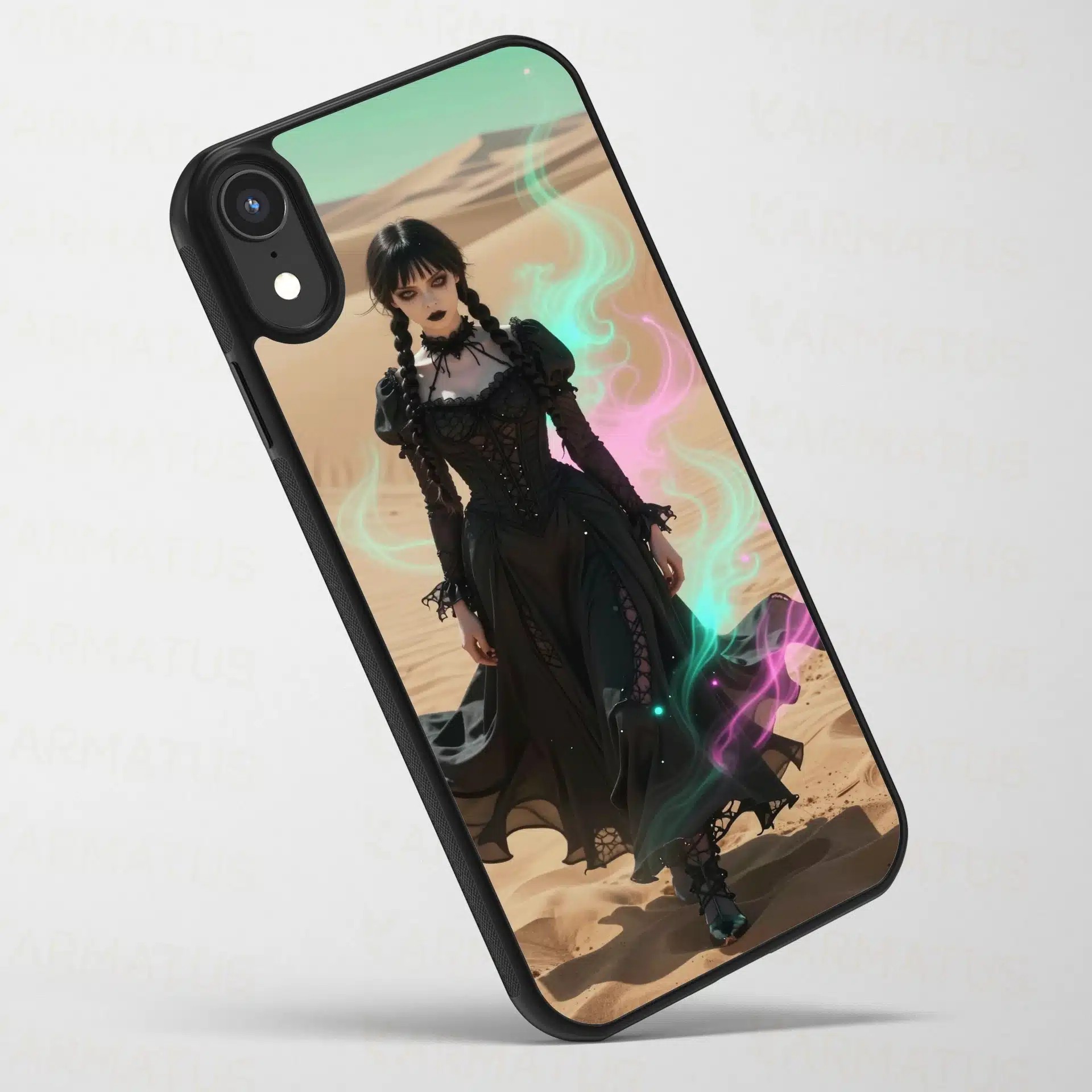ونزدی آدامز در این تصویر خیرهکننده، با لباس سیاه نمادین خود در میان بیابانی بیپایان ایستاده است. نور شدید و جهتدار، چهرهی رنگپریده و نگاه نافذ او را برجسته میکند، در حالی که تافتههای بافتهاش در تضاد با تپههای شنی طلایی قرار گرفتهاند.