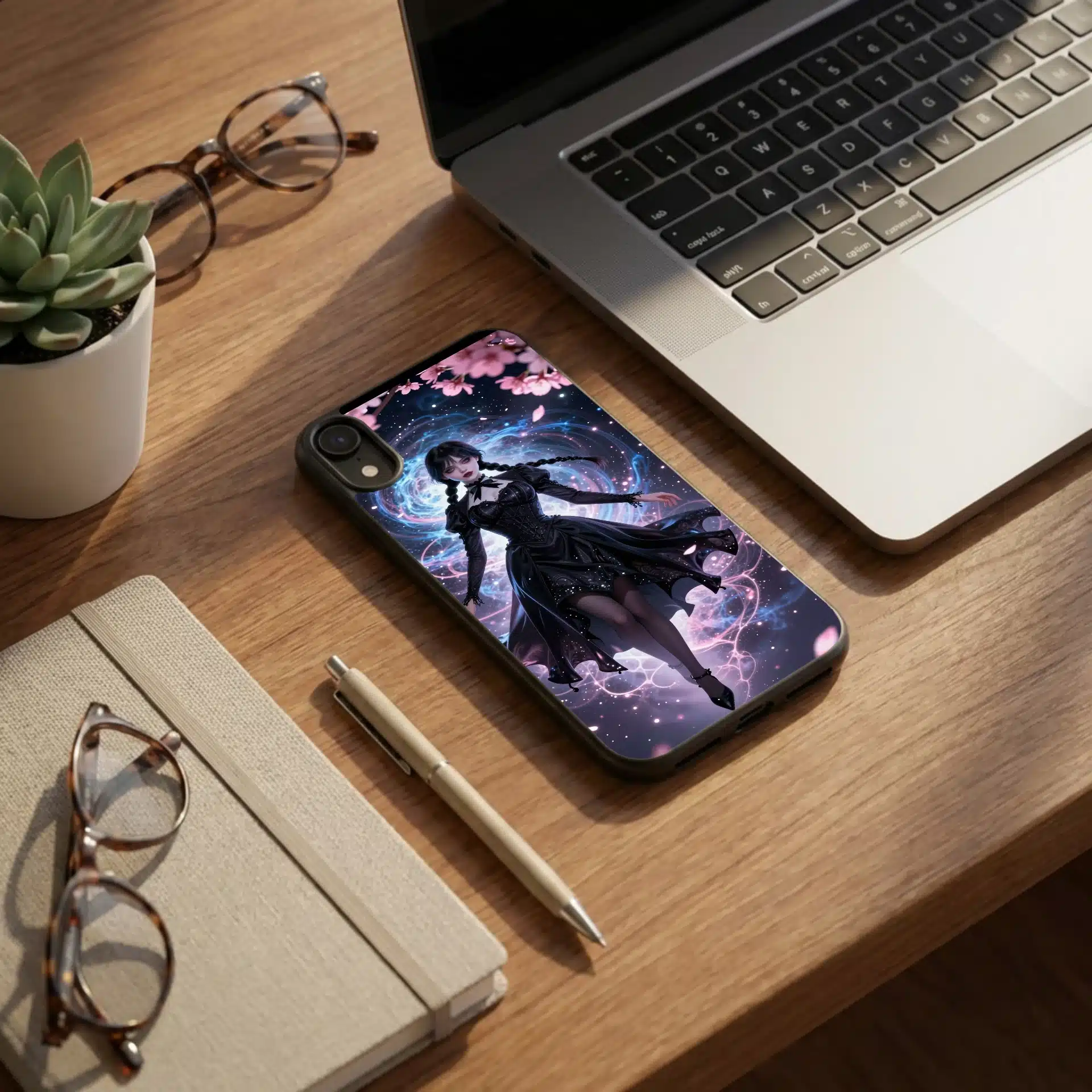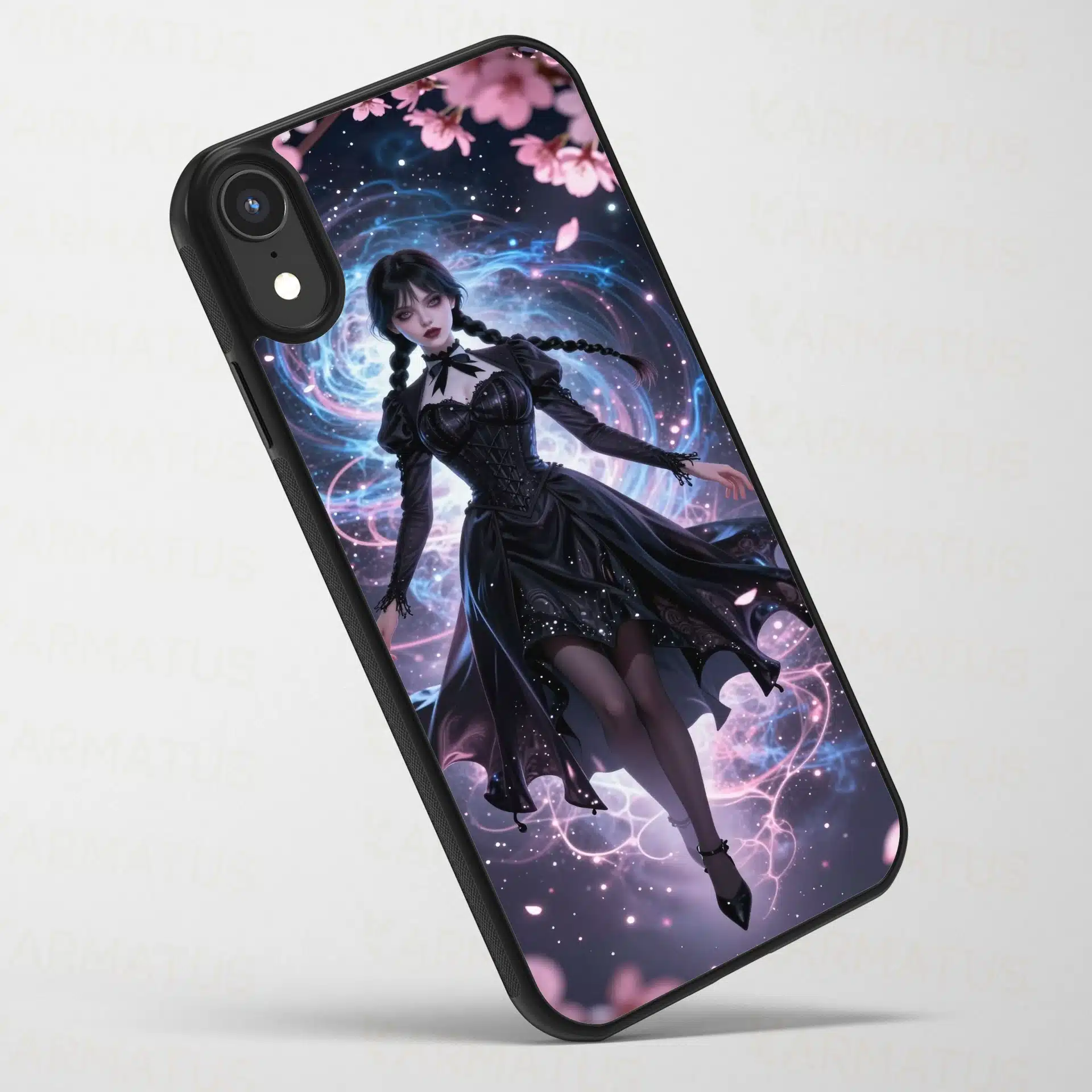 طرح قاب موبایل ‘ونزدي’ با الهام از شخصیت ونساندی آدامز در یک پرتره انیمهای خیرهکننده طراحی شده است. این تصویر او را در فضای بیوزنی میان گلبرگهای ساکورای نئونی و درخشان به نمایش میگذارد که هالهای صورتی ماورایی دارند.