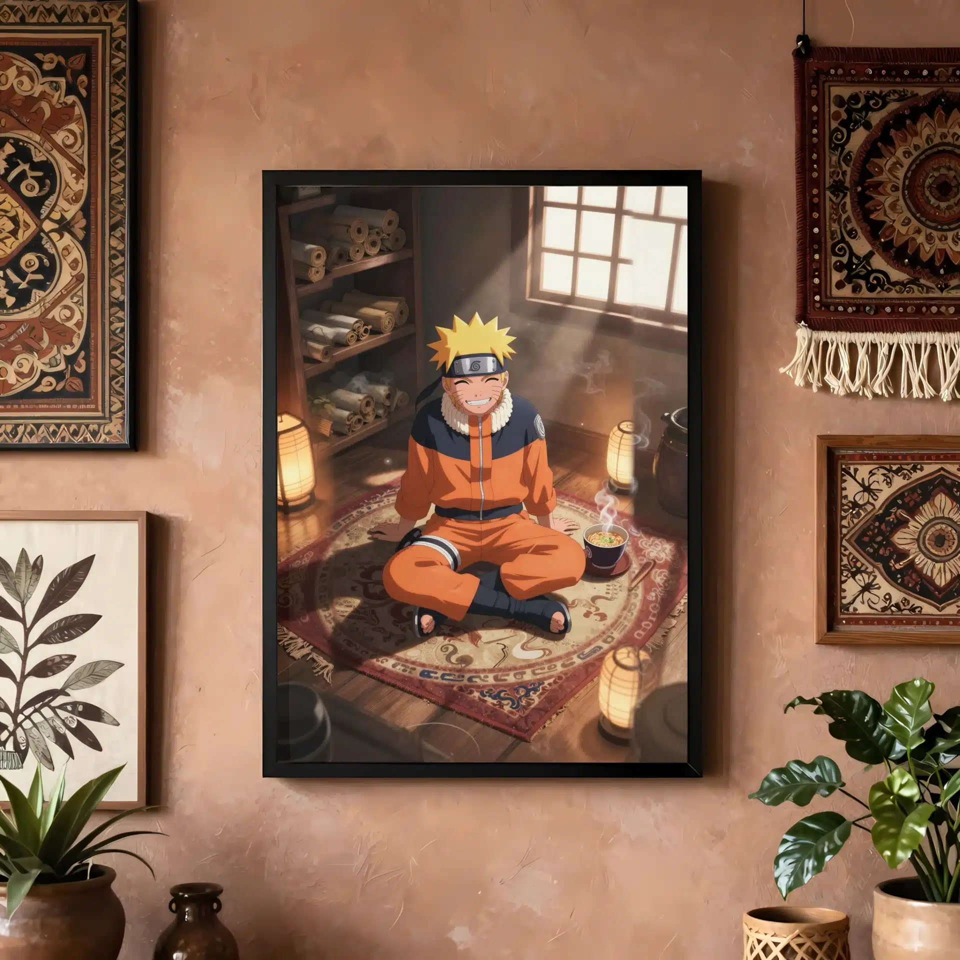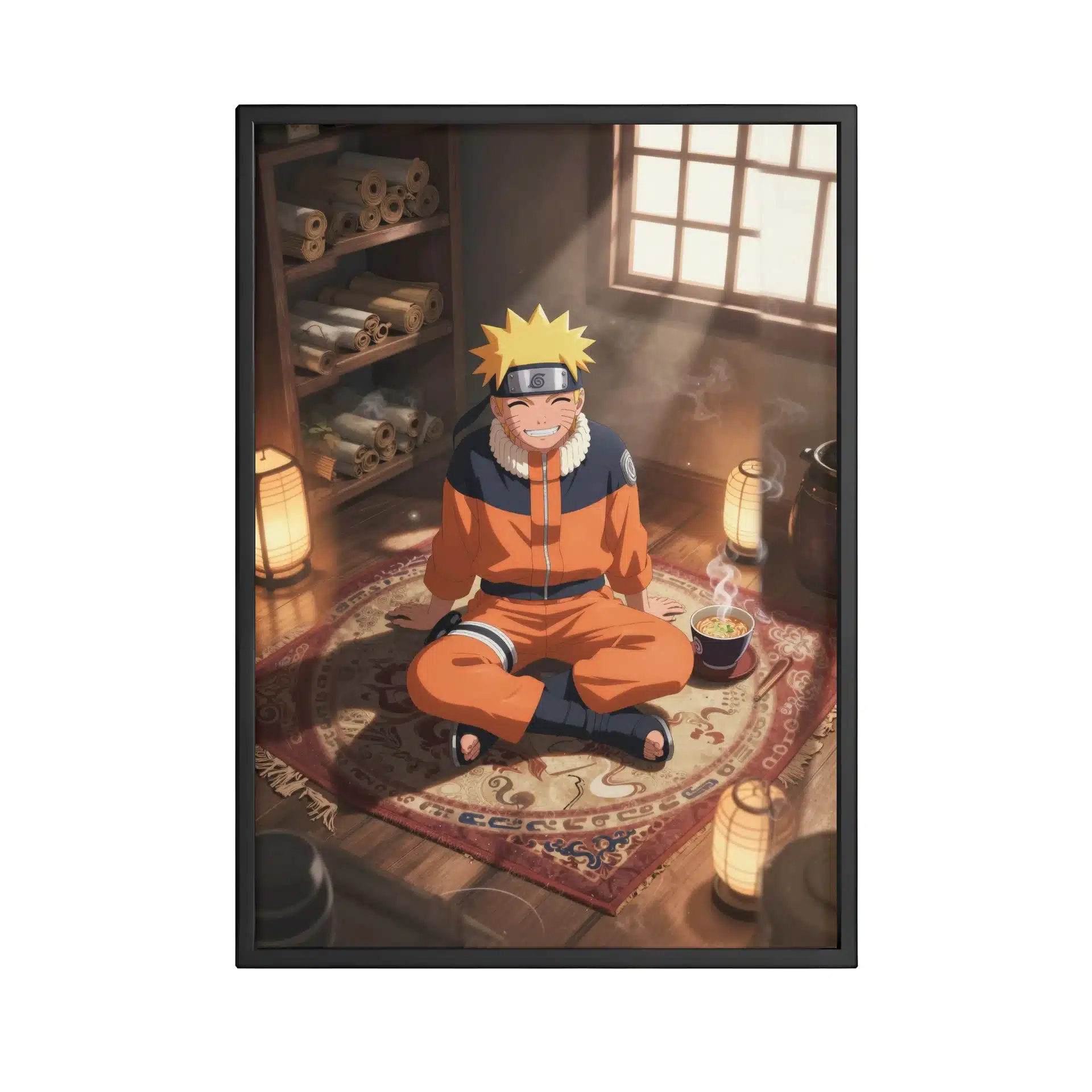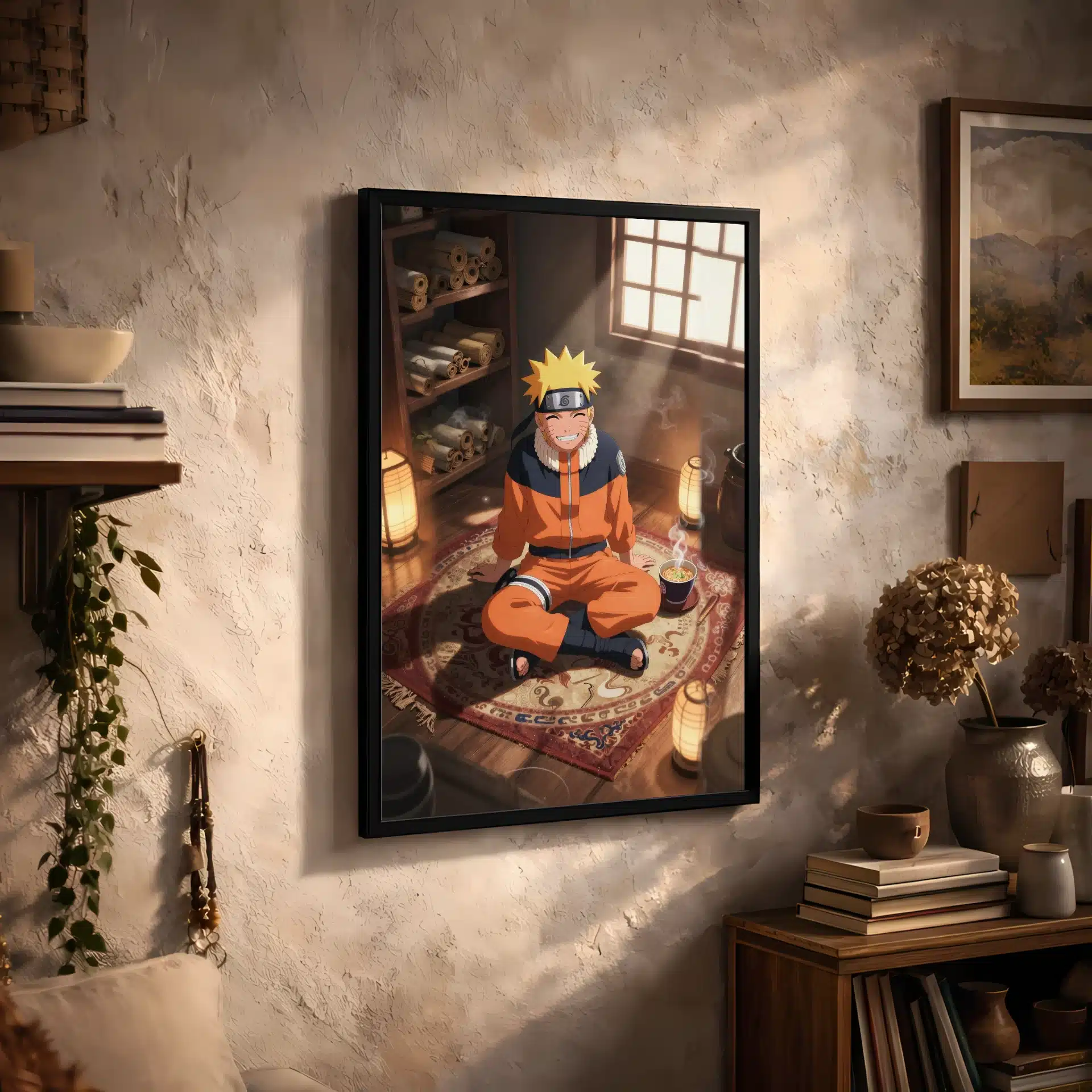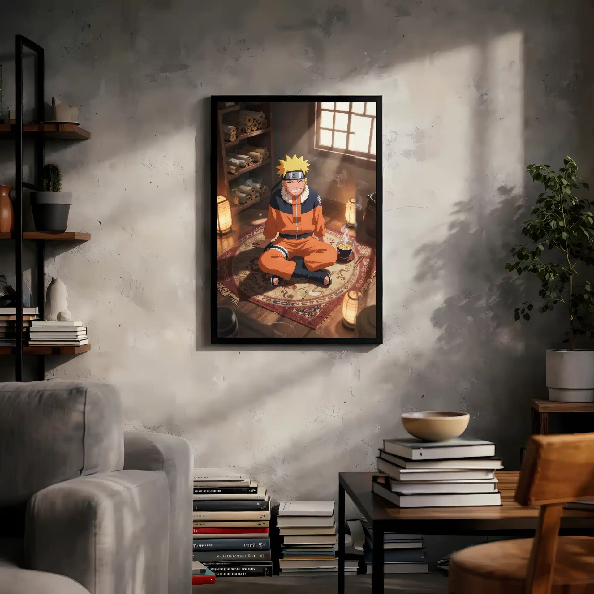طرح این قاب عکس با نورپردازی کنتراست بالا، رنگ نارنجی درخشان لباس ناروتو و موهای بلوند خاردار او را برجسته میکند. قفسههای پر از طومار، فانوسهای روشن و یک کاسه رامن داغ در کنار او، فضایی گرم و زنده را خلق کردهاند.