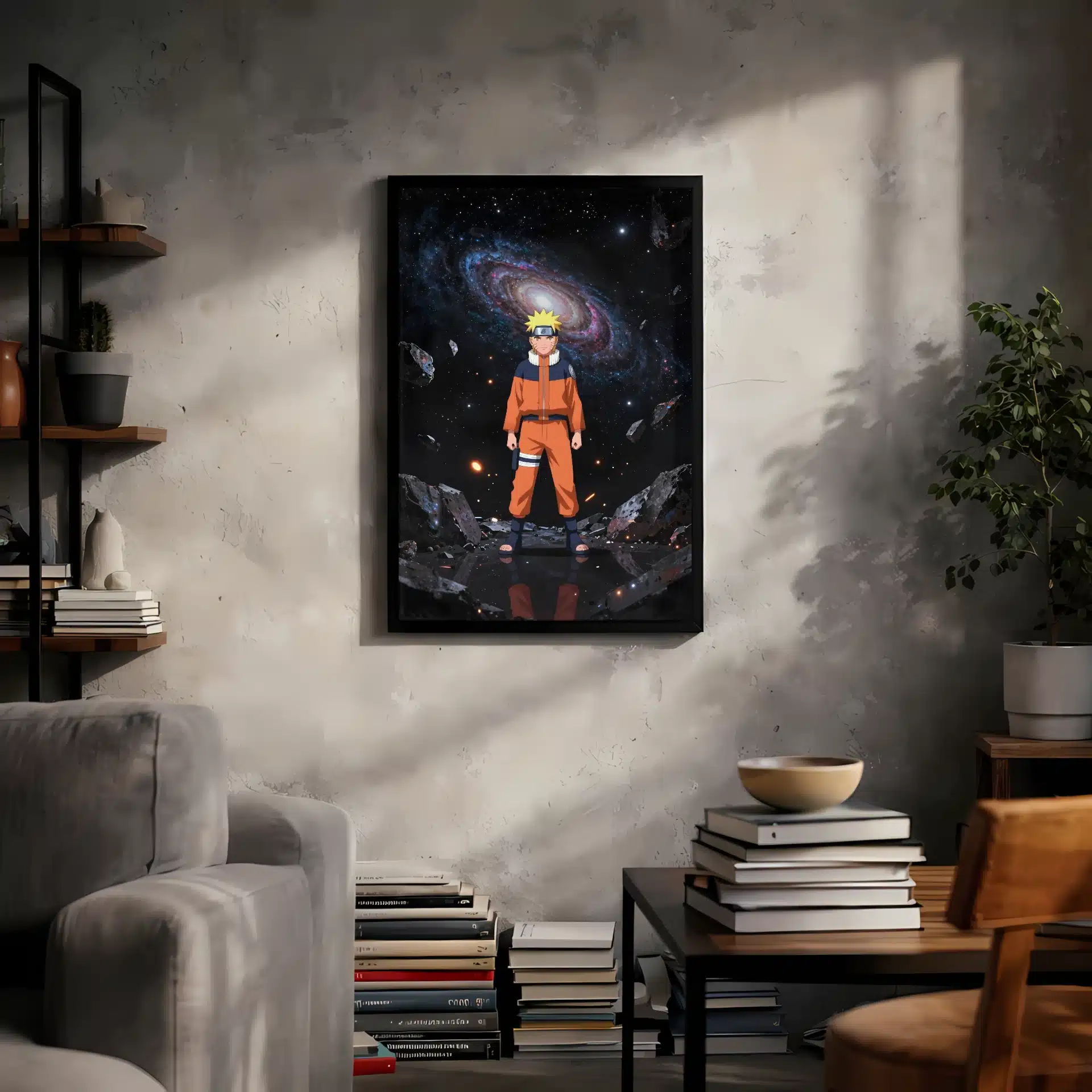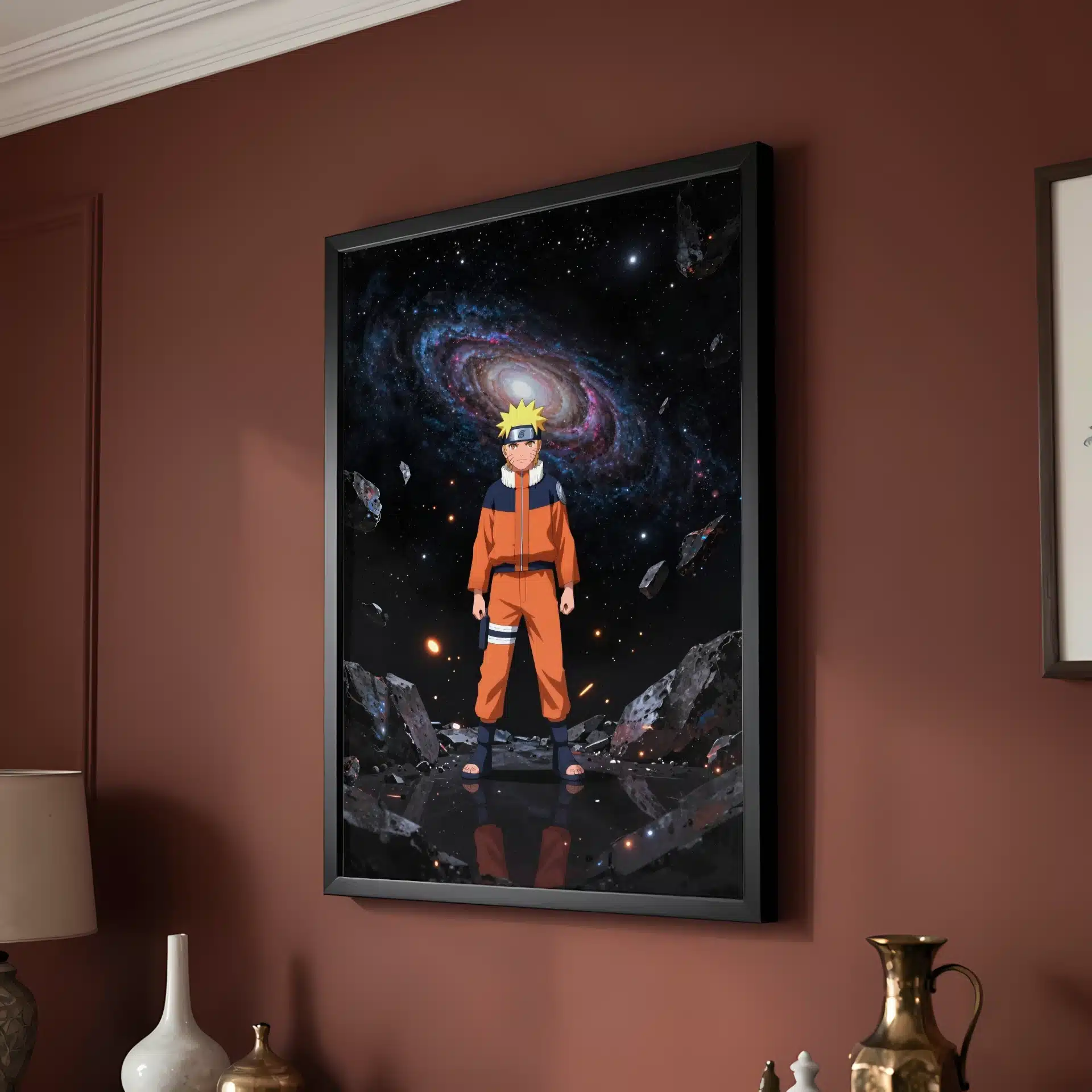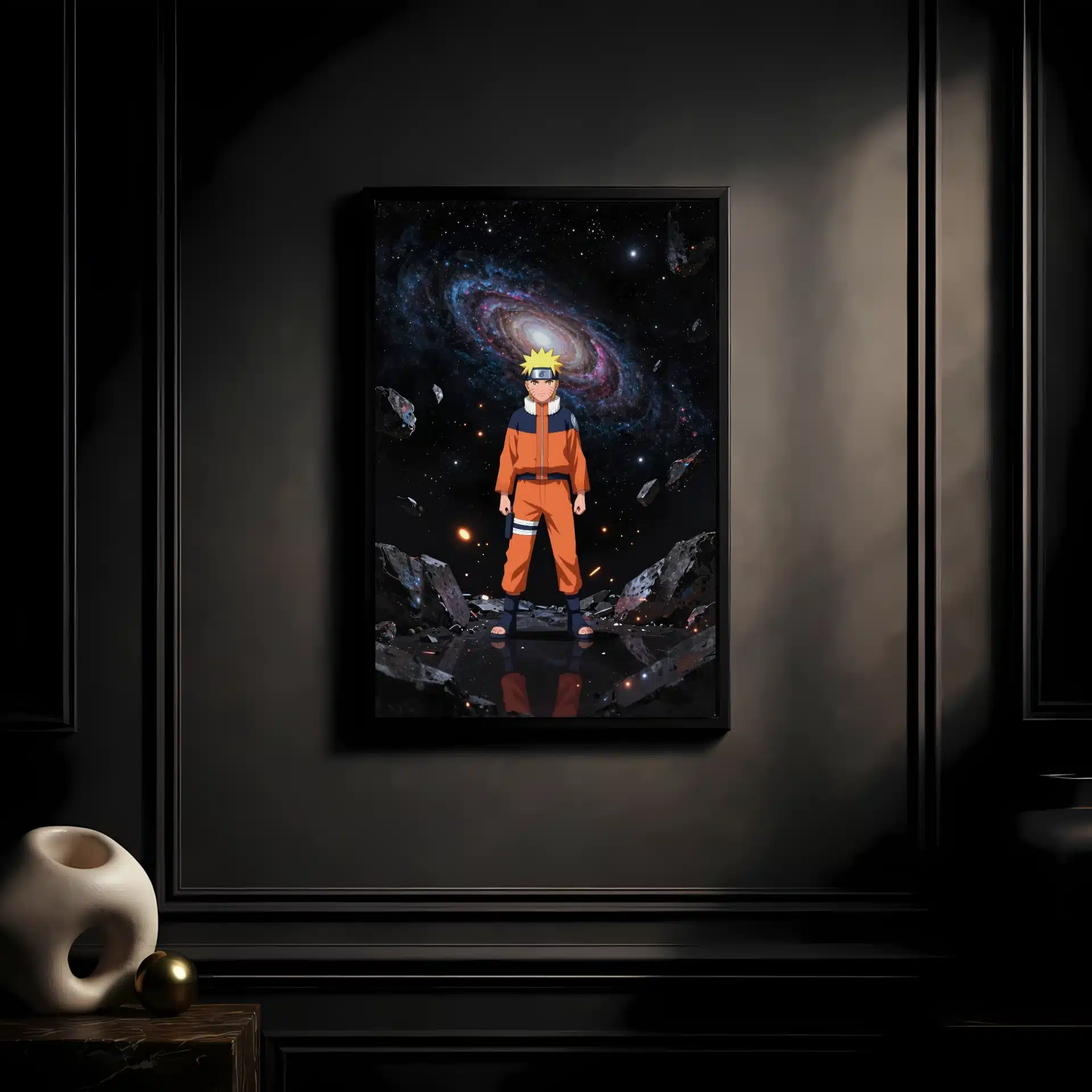 طرح این قاب عکس با زاویه دید گسترده، وسعت بینهایت فضا را به تصویر میکشد و حضور کوچک اما مصمم ناروتو را در برابر کهکشانهای چرخان و سحابیهای درخشان برجسته میسازد. رندرینگ انیمهای به حالت پویای او انرژی میبخشد و جرقههای چاکرا مانند کرمهای شبتاب کیهانی در اطرافش میدرخشند.