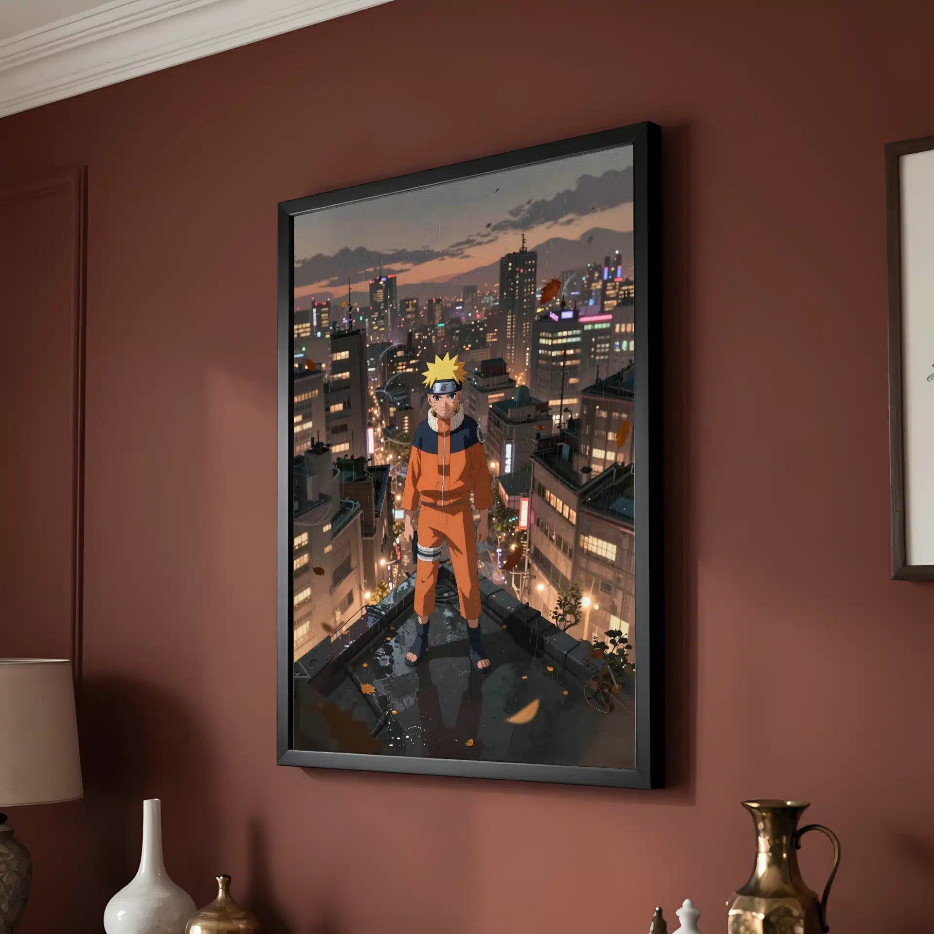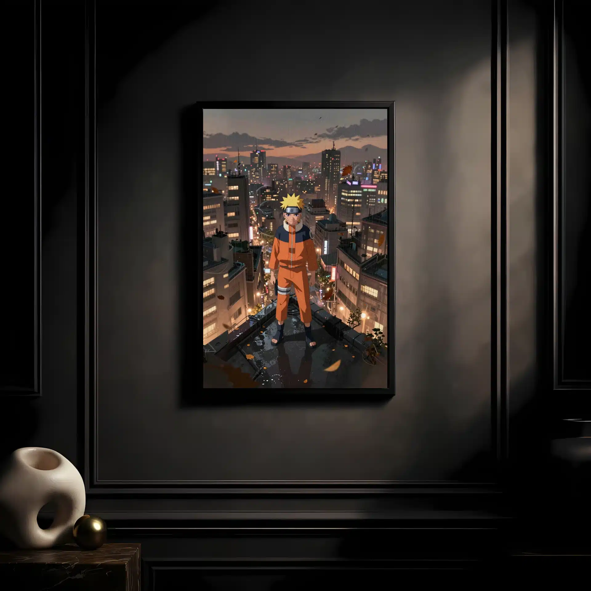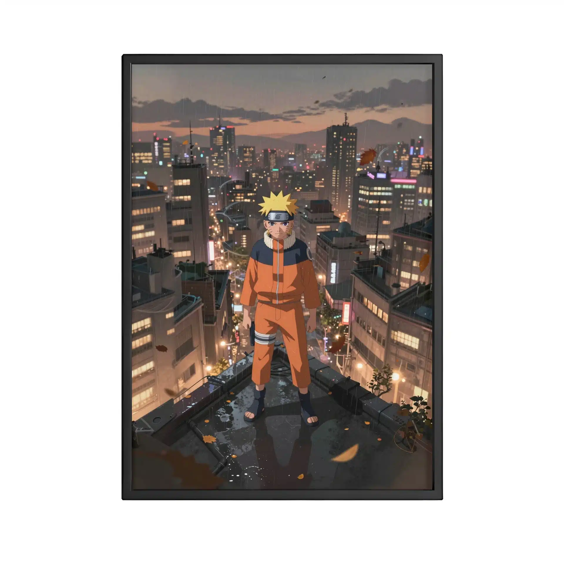 طرح این قاب عکس با جزئیات دقیق و سبک انیمهای، شهری گسترده با ساختمانهای بلند و نورهای نئون را در پسزمینه نشان میدهد. کت نارنجی ناروتو در تضاد با رنگهای ملایم صحنه، انرژی و احساسات این لحظه را به خوبی منتقل میکند.