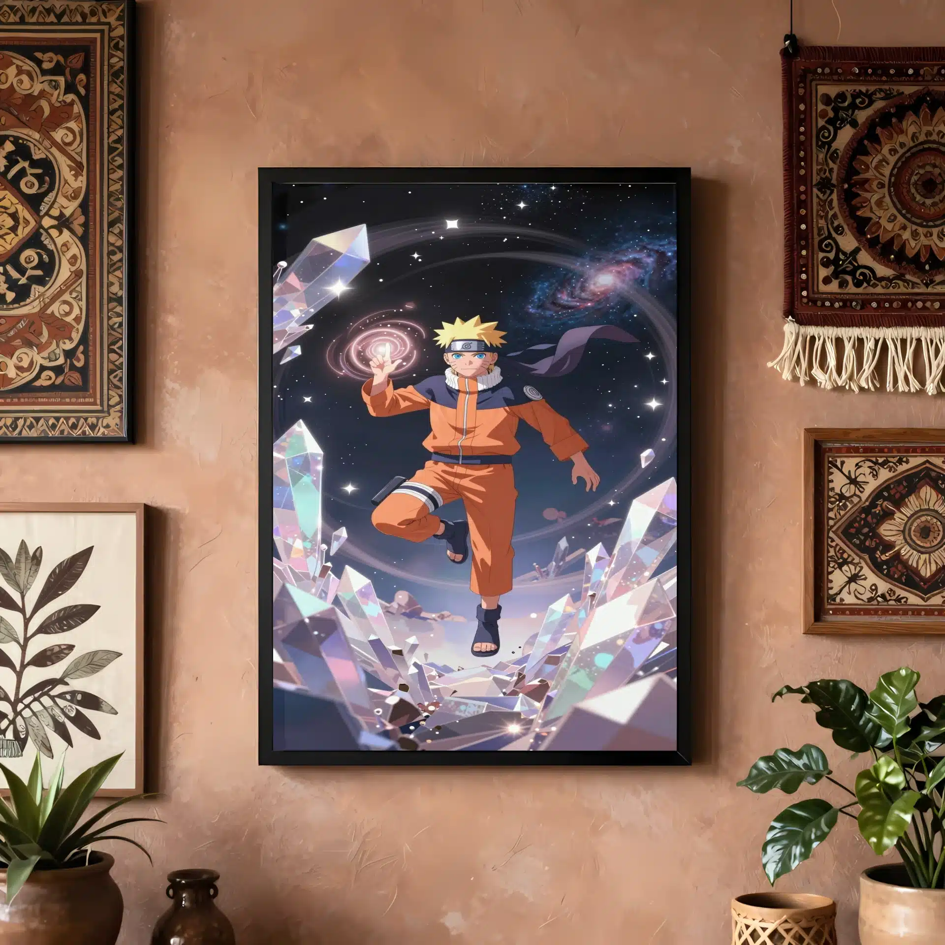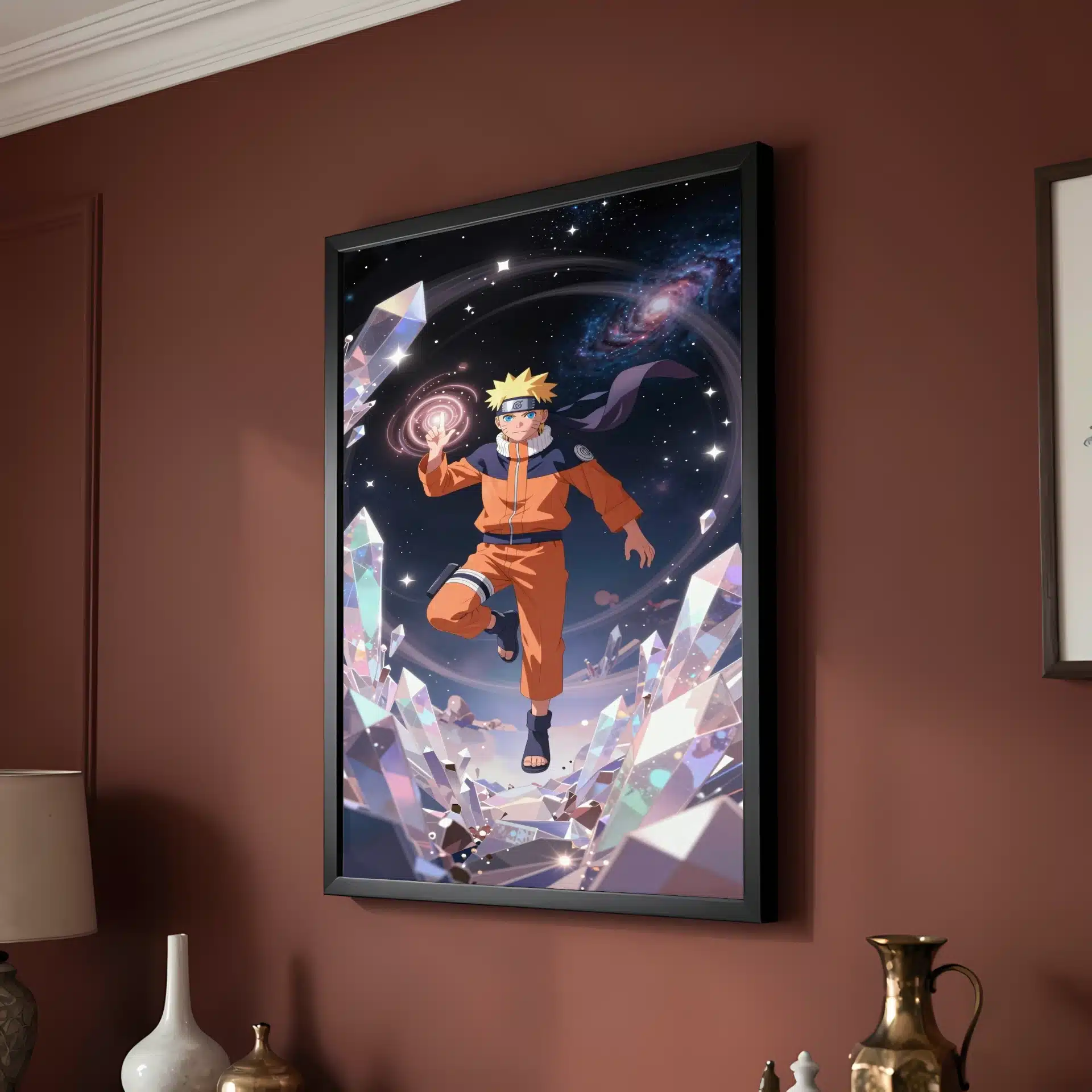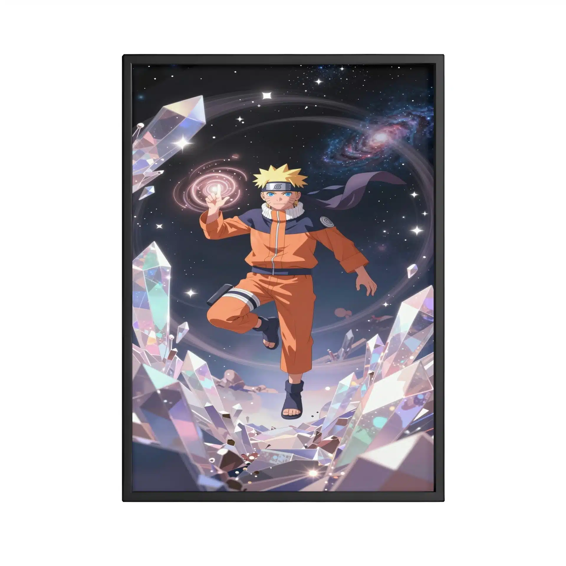 این قاب عکس منحصر به فرد ناروتو اوزوماکی را در فضای بیکران به تصویر میکشد، جایی که او با آرامش در میان کریستالهای درخشان شناور است. نورپردازی سینمایی و انرژی چاکرای درخشان او، فضایی رویایی و پر از قدرت خلق کردهاست.