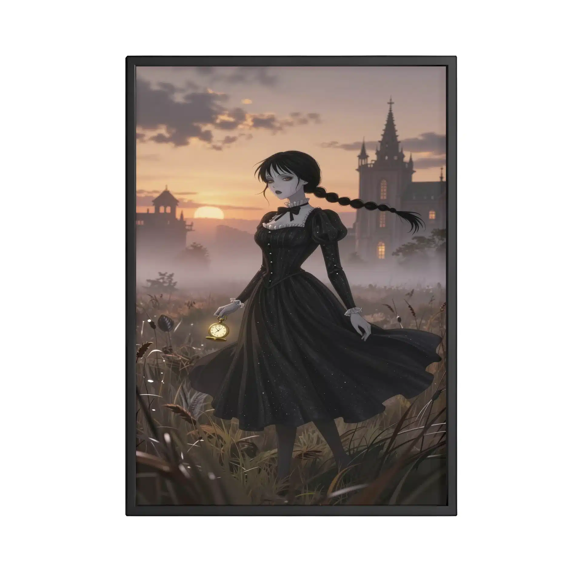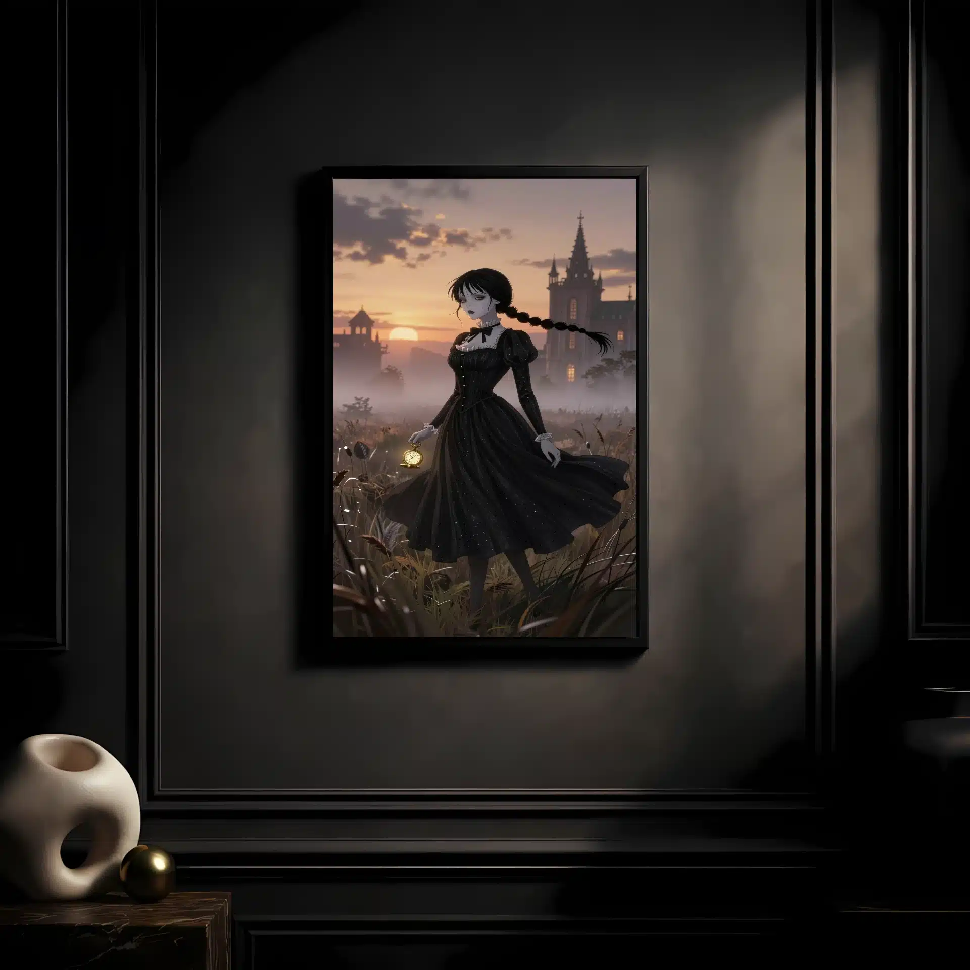 ونزدی آدامز در یک دشت مهآلود در گرگومیش ایستاده است، با لباس سیاه نمادینش که در باد بهتندی در حرکت است. در دست رنگپریدهاش، یک ساعت جیبی طلایی بهآرامی میدرخشد و فضایی مرموز و رویایی خلق میکند.
