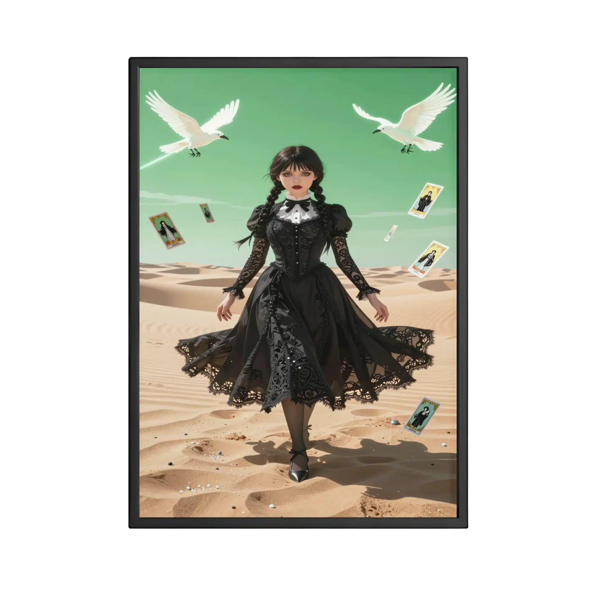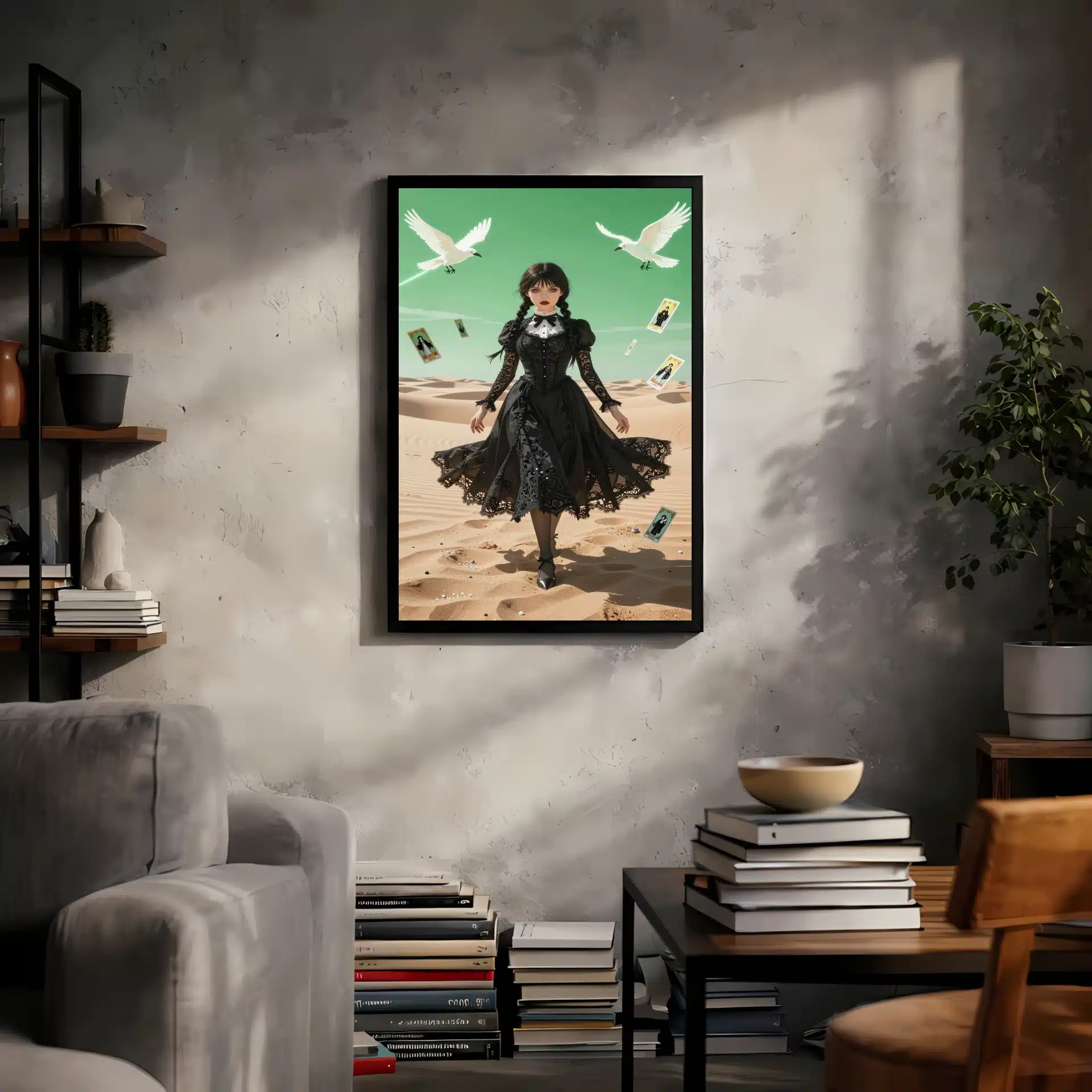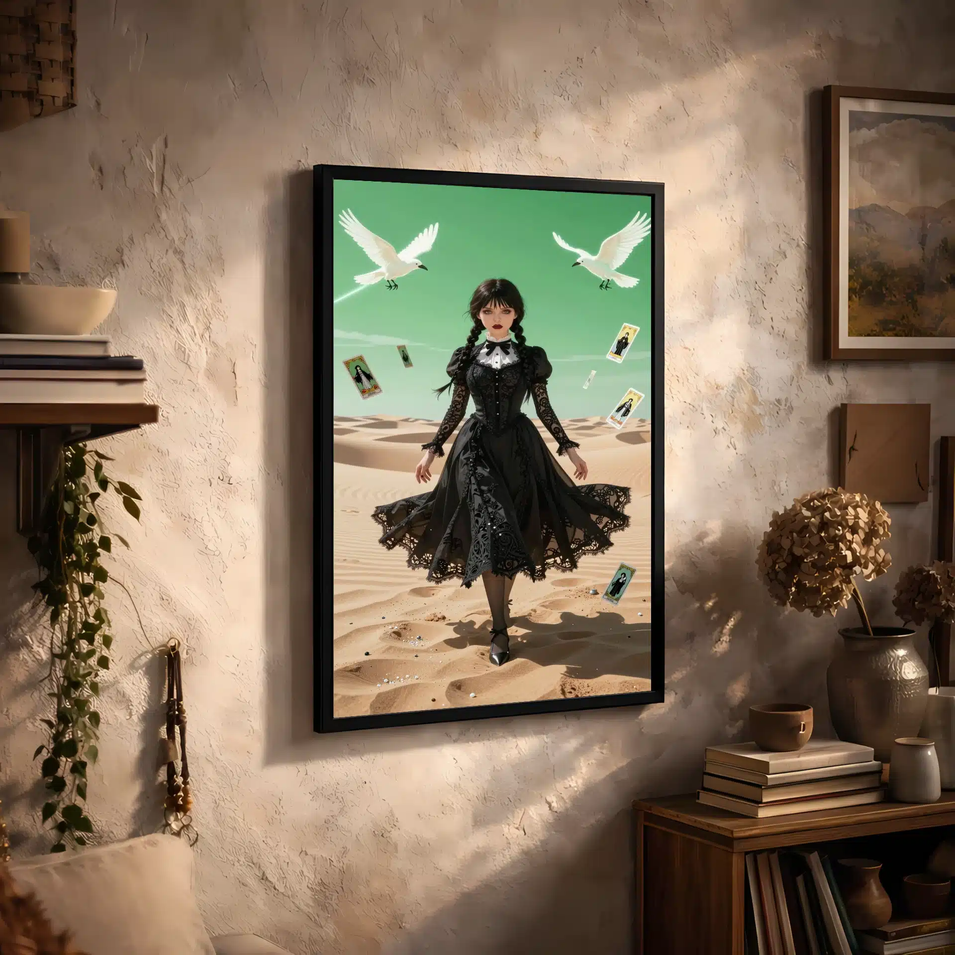 این قاب عکس با الهام از شخصیت ونزدی آدامز، یک اثر هنری خیرهنده در سبک انیمه ارائه میدهد. صحنهای سورئال از ونزدی را در یک بیابان وسیع با نورپردازی دراماتیک و رنگهای پاستلی ملایم به تصویر میکشد.