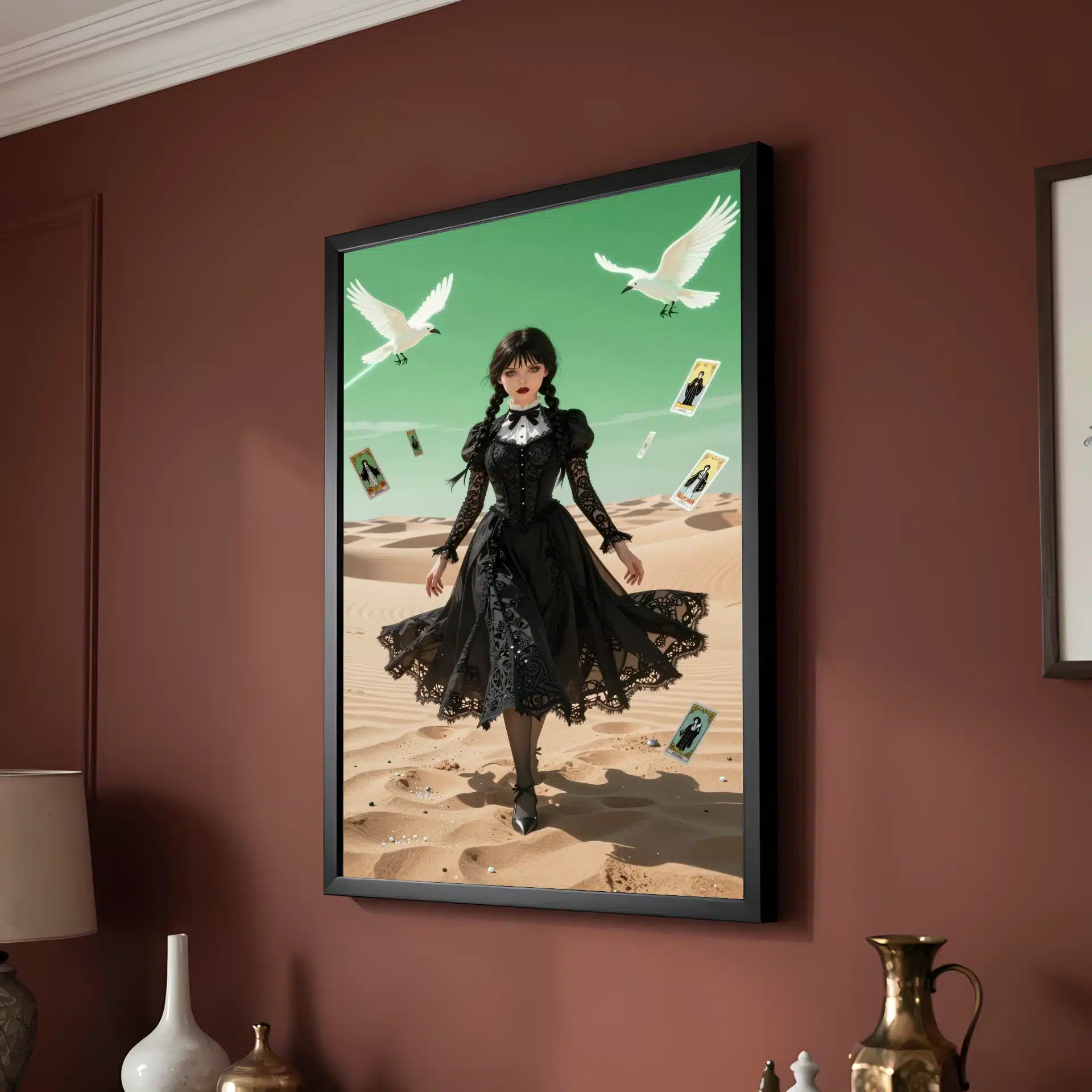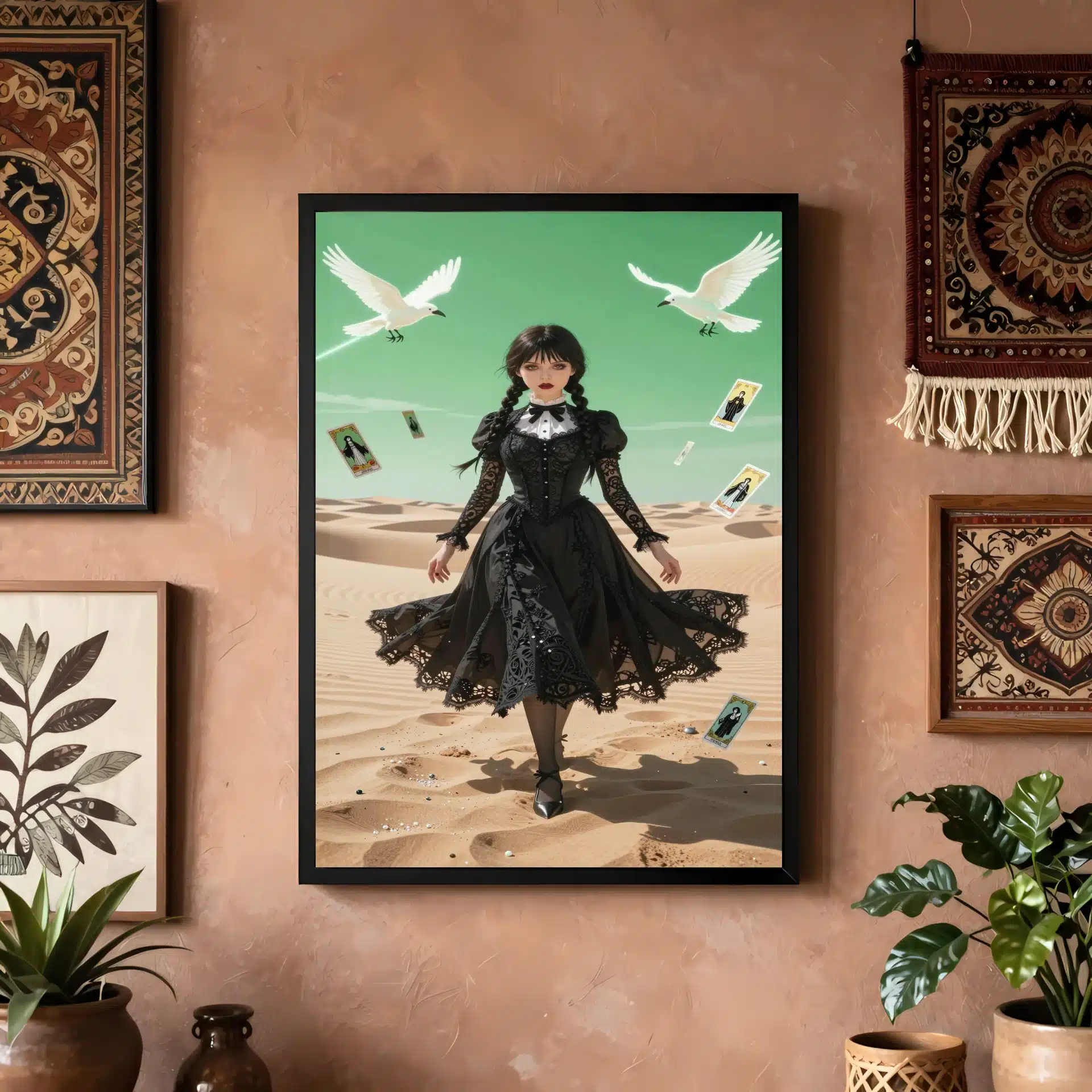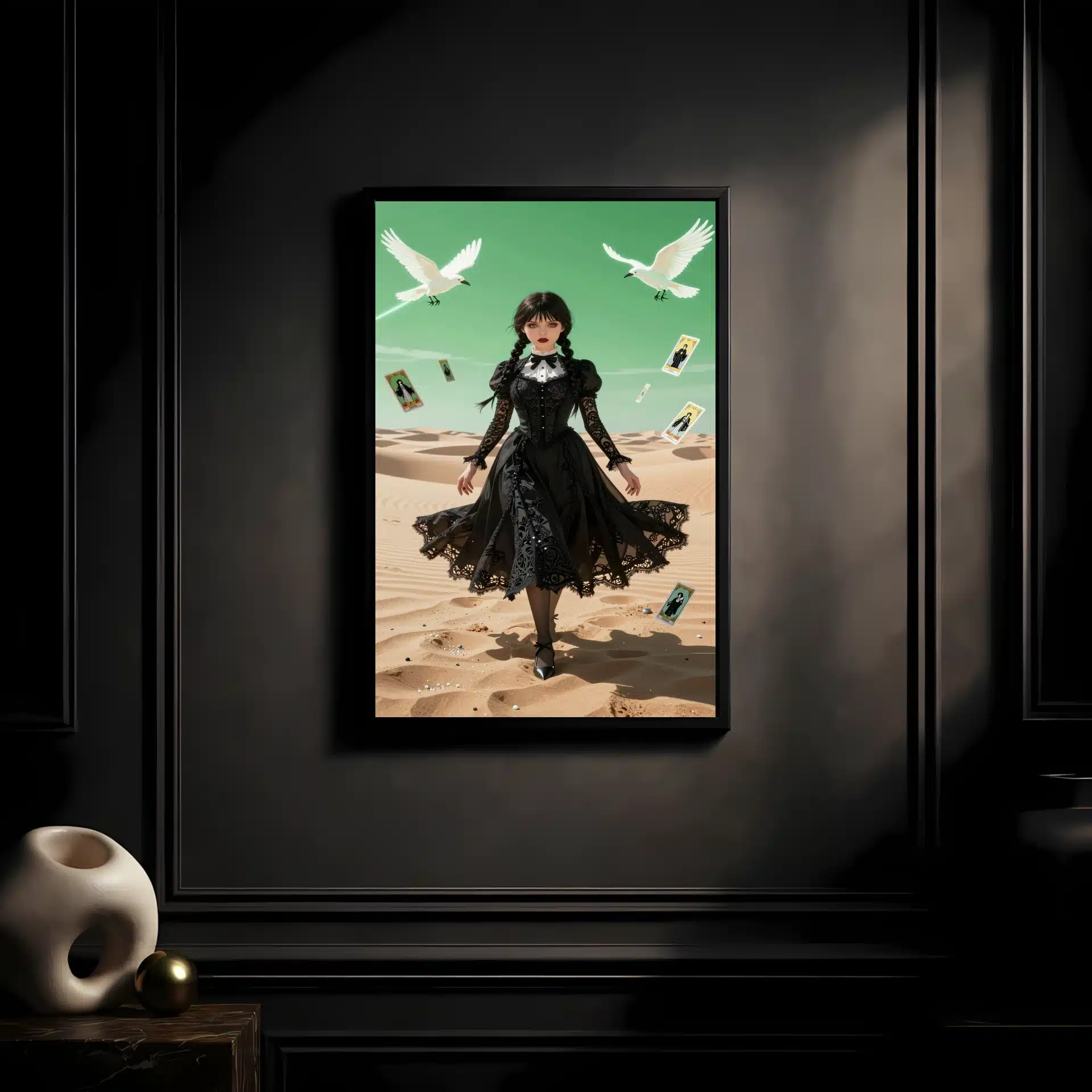 این قاب عکس با الهام از شخصیت ونزدی آدامز، یک اثر هنری خیرهنده در سبک انیمه ارائه میدهد. صحنهای سورئال از ونزدی را در یک بیابان وسیع با نورپردازی دراماتیک و رنگهای پاستلی ملایم به تصویر میکشد.