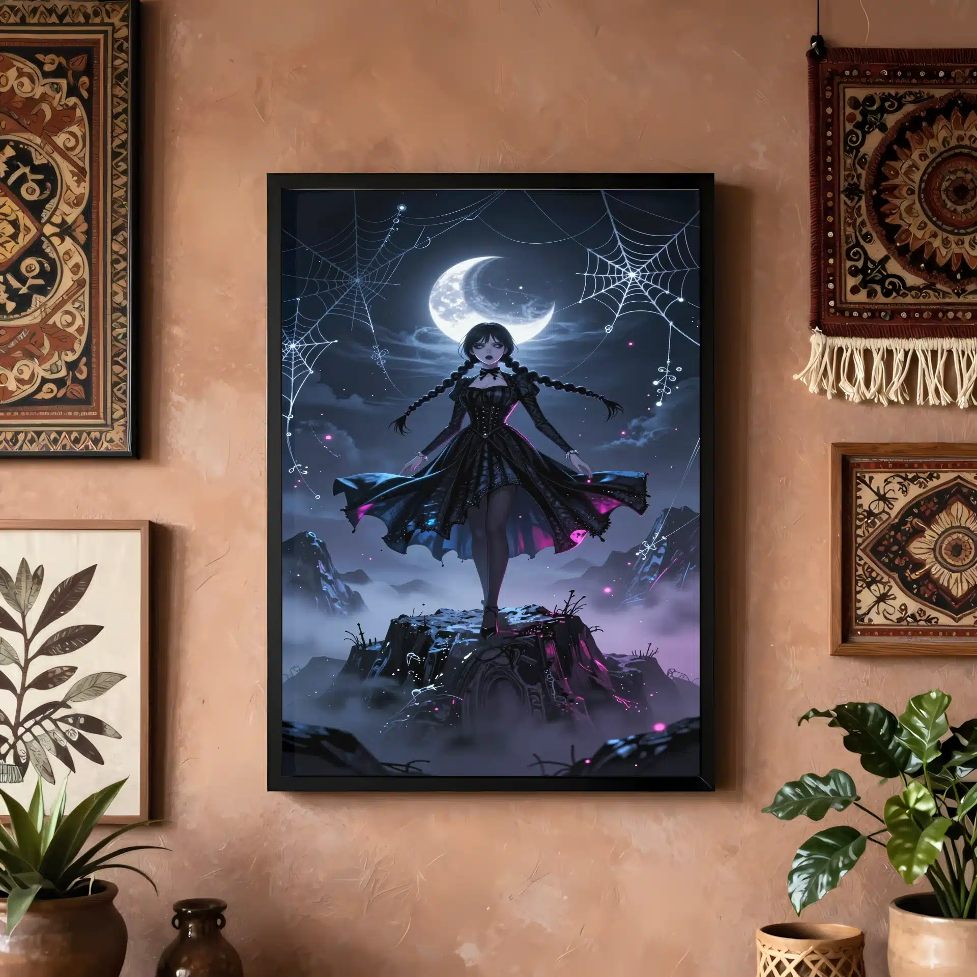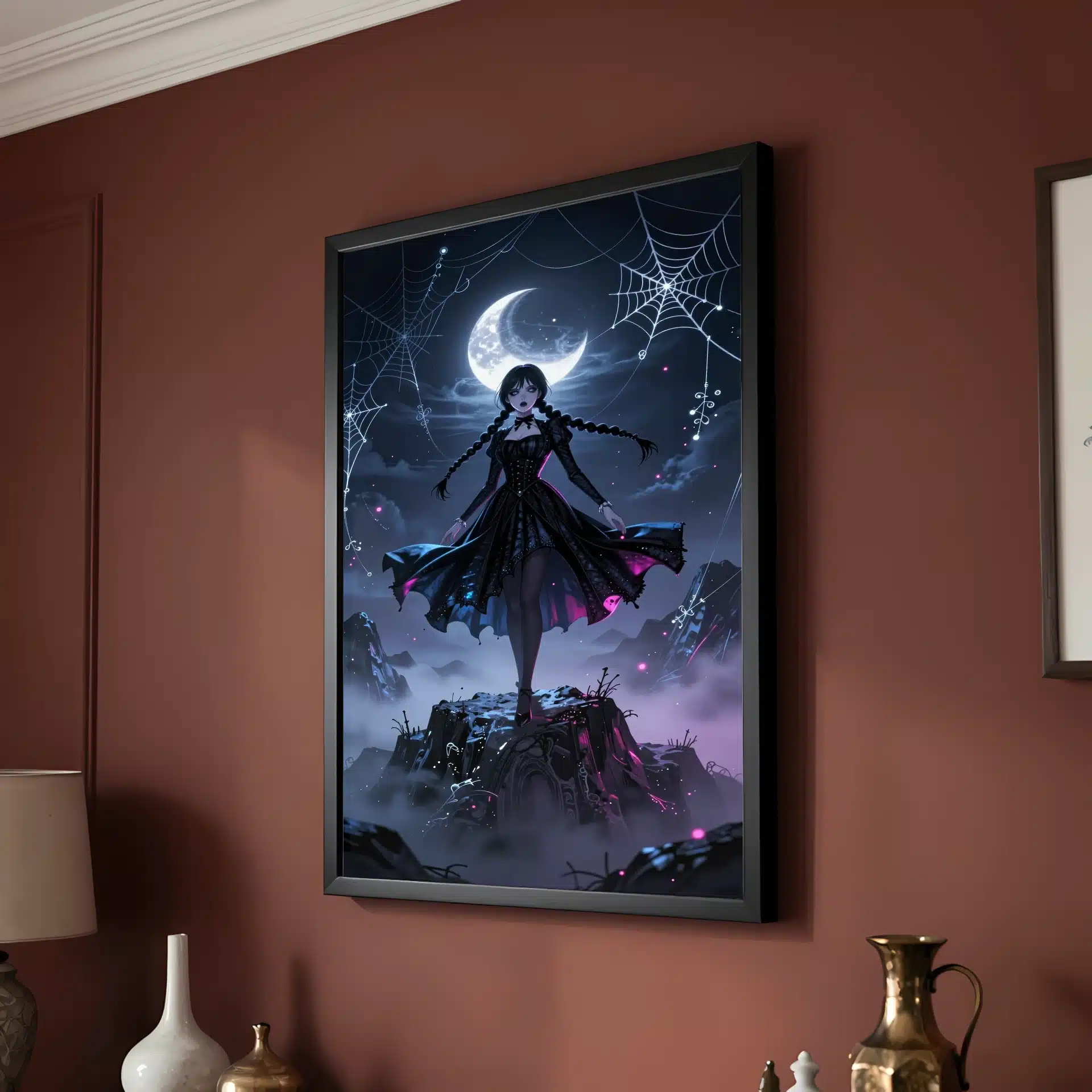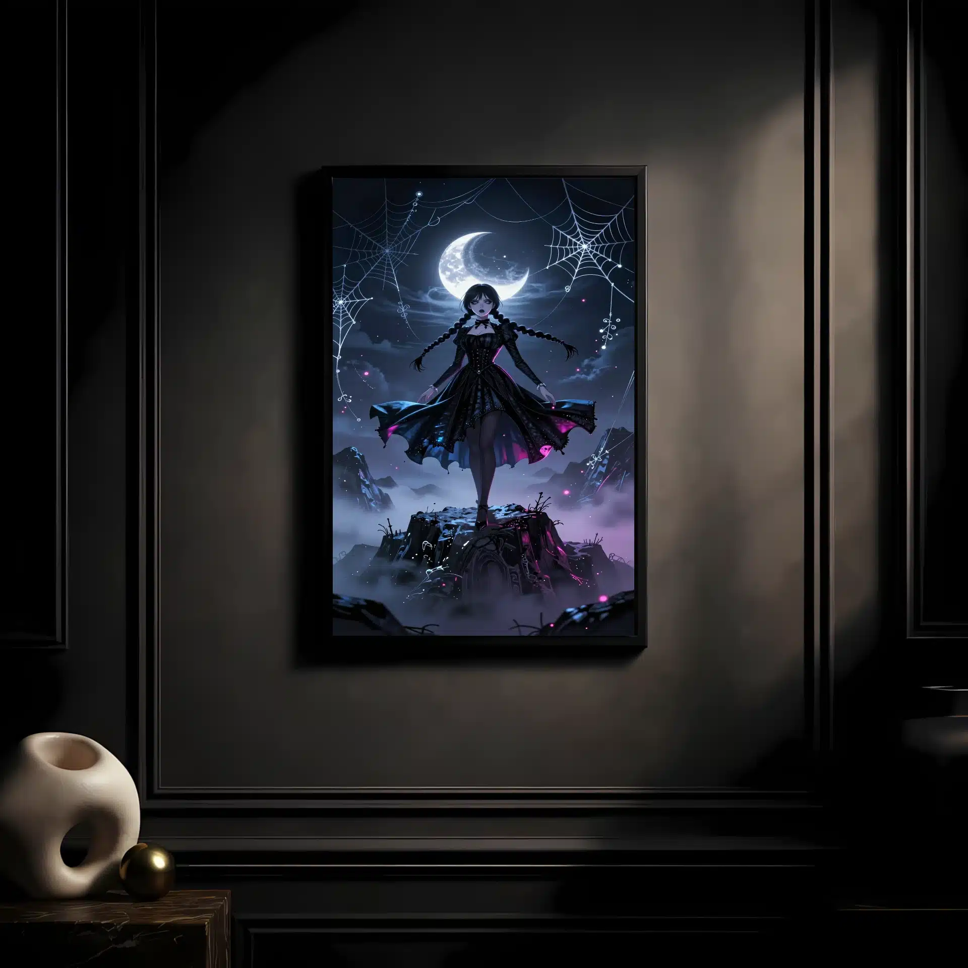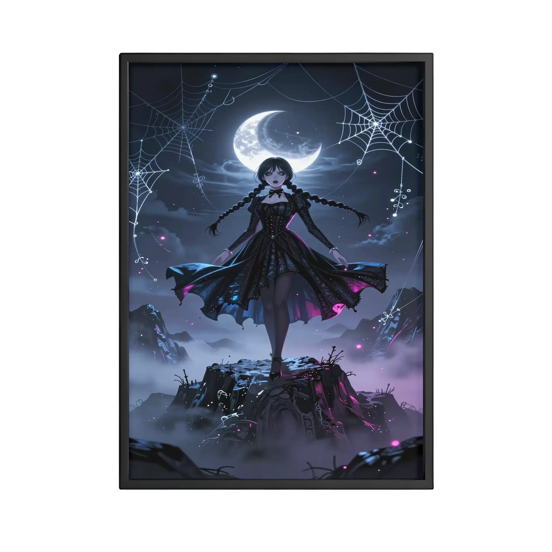این طراحی فوقالعاده با جزئیات 8K، شامل تارعنکبوتهای نقرهای درخشان و الگوهای گوتیک ارگانیک است که حول او میچرخند. اثر فیشآی و ذرات اتری، ترکیبی جذاب از فانتزی تاریک و هایلایتهای نئون سایبرگوتیک را ایجاد میکند.