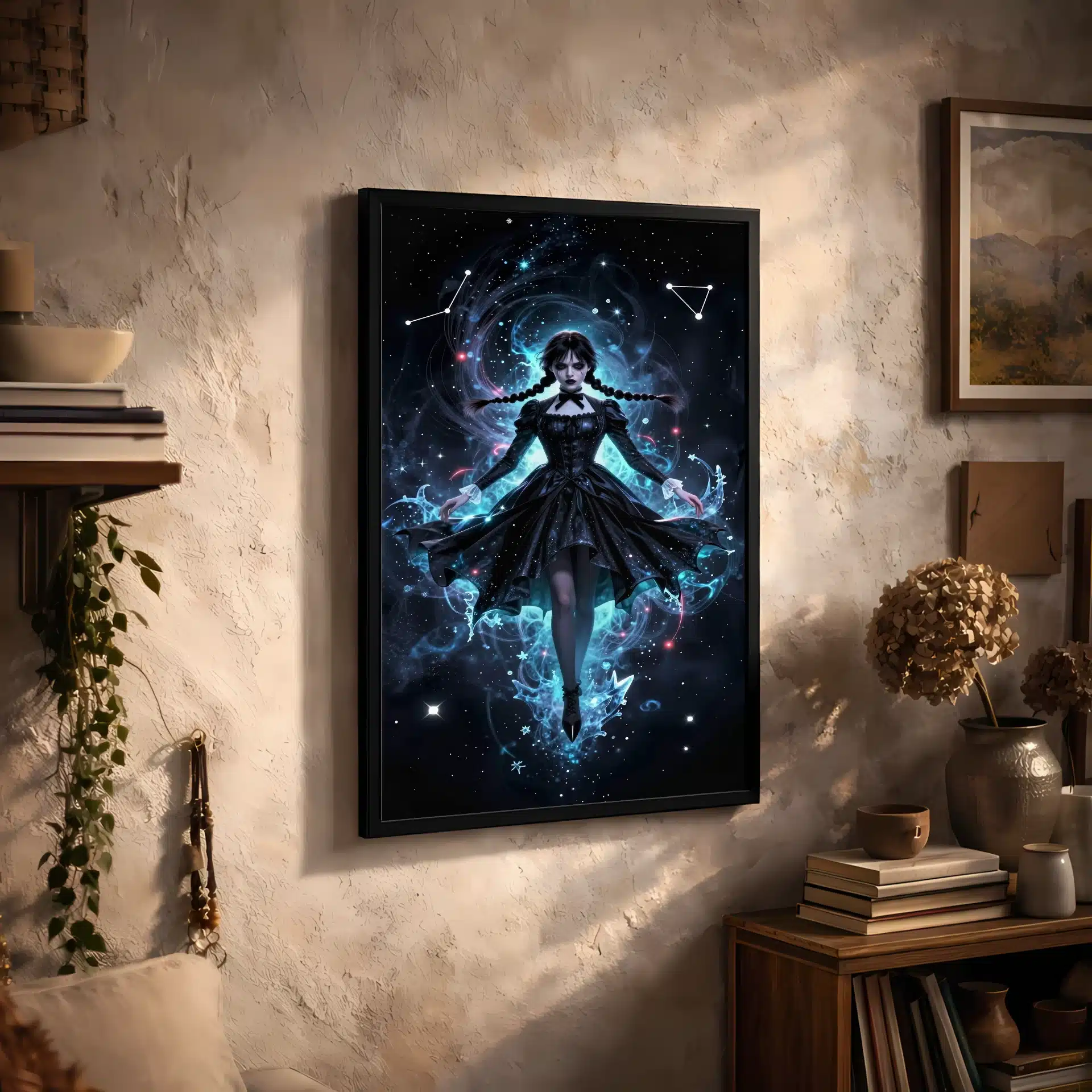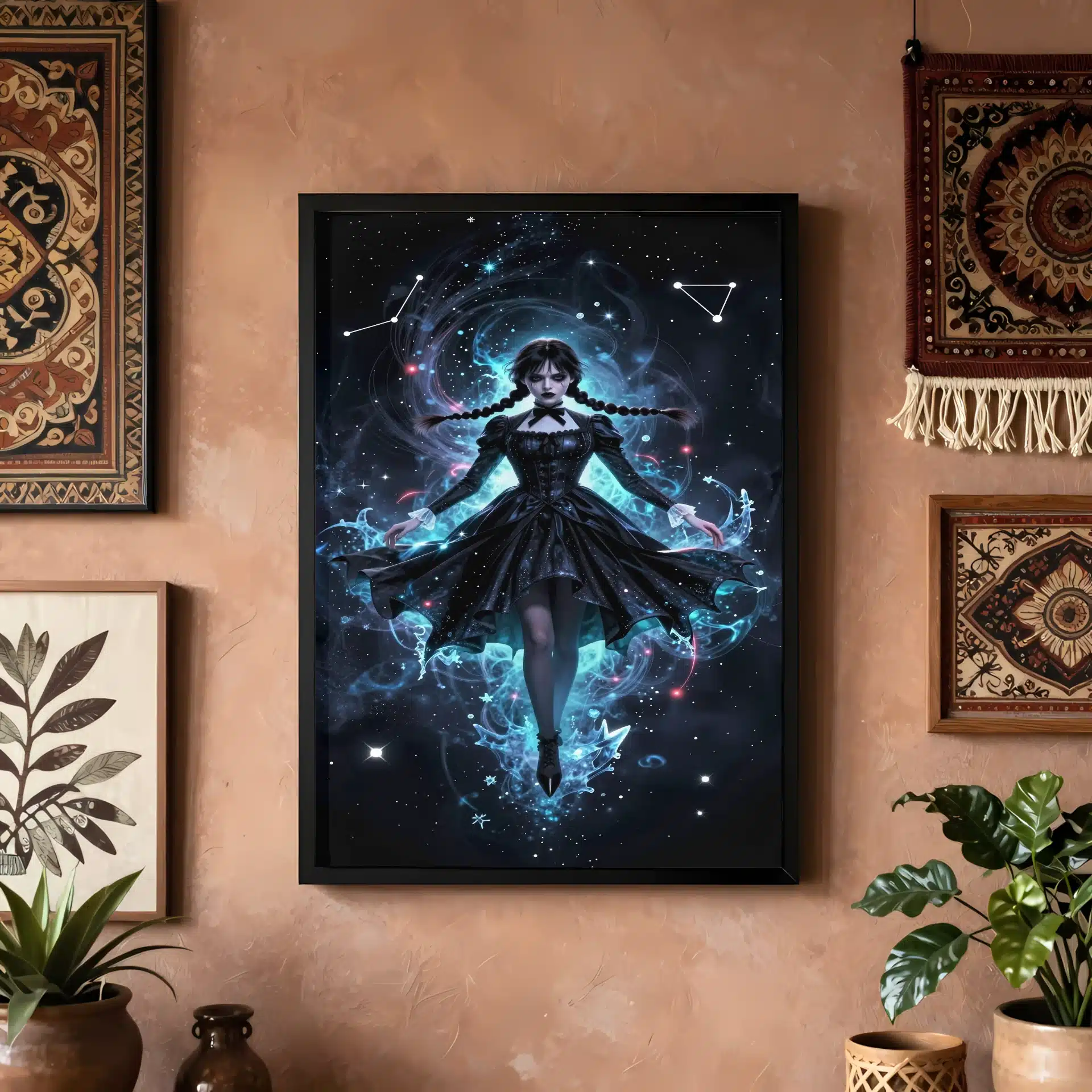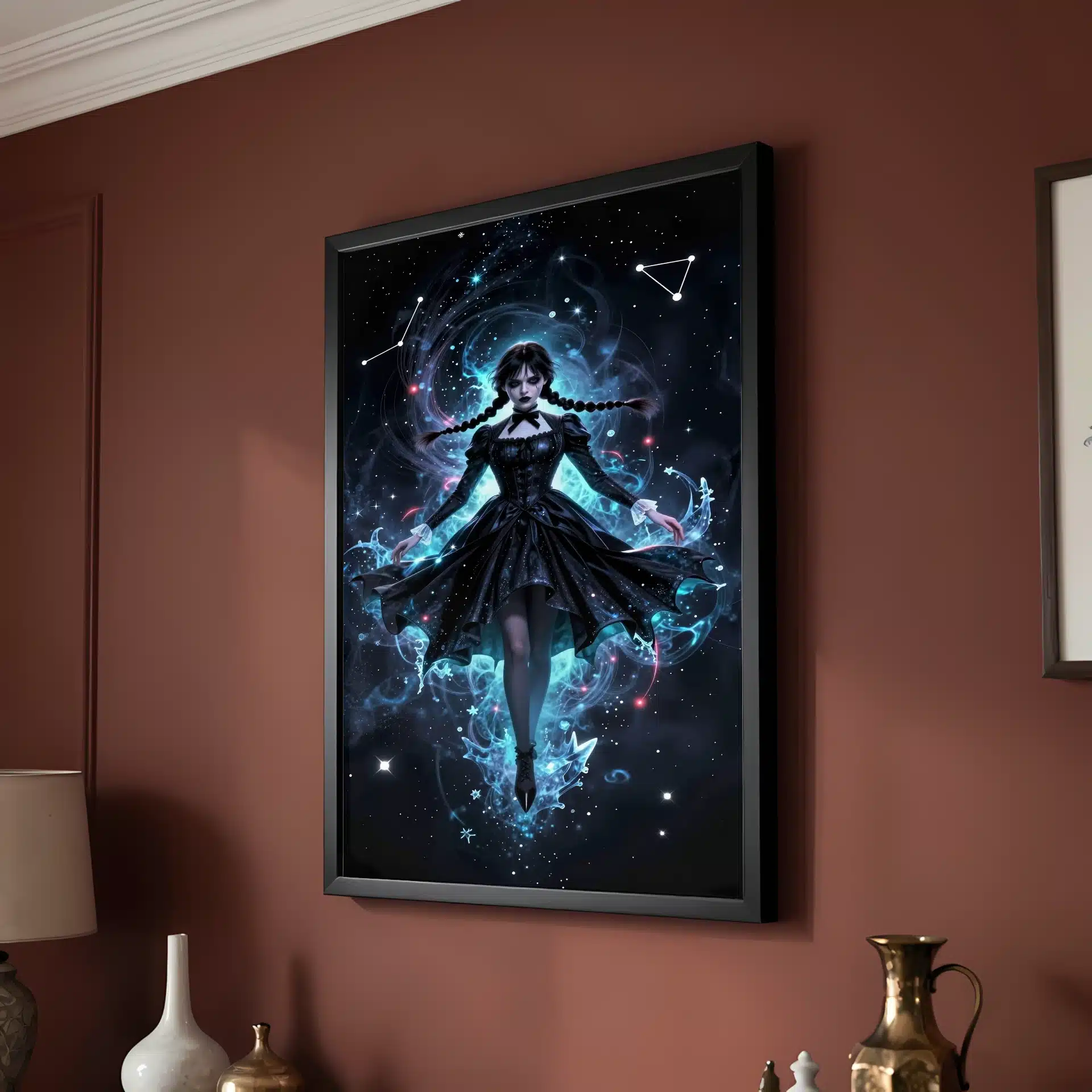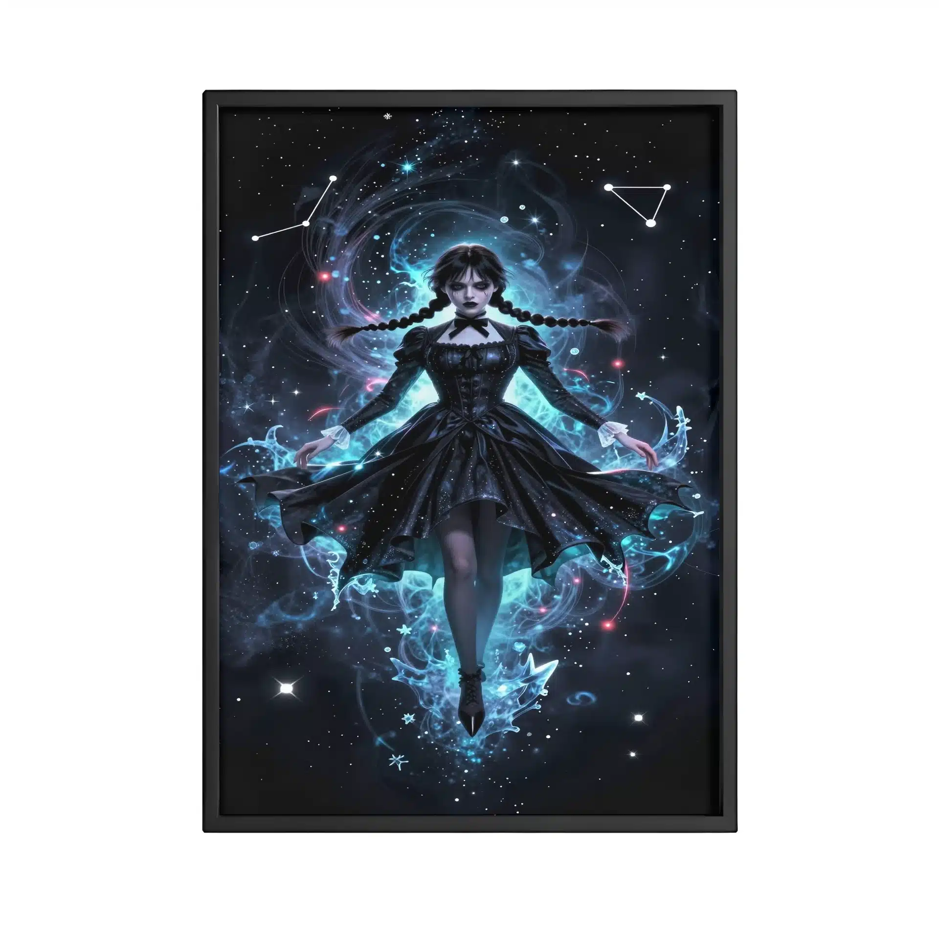 این قاب عکس با الهام از شخصیت ونزدی آدامز طراحی شده است که در فضای بیکران و یخزده شناور است. ترکیب رنگهای آبی فیروزهای و مرجانی، همراه با جزئیات خیرهکننده، حالتی رویایی و فرازمینی به تصویر بخشیدهاند.