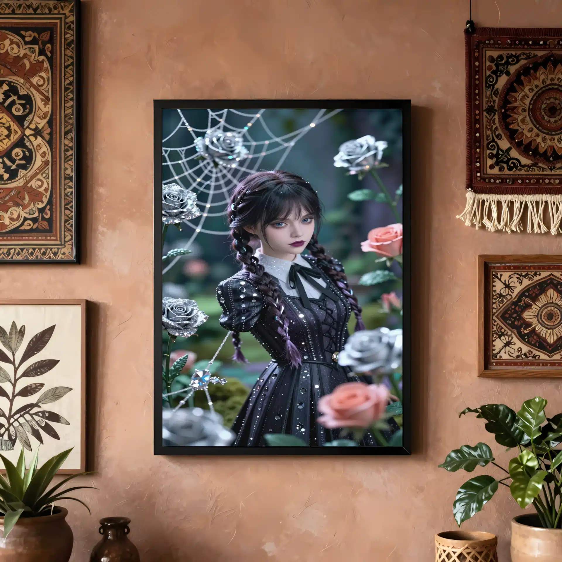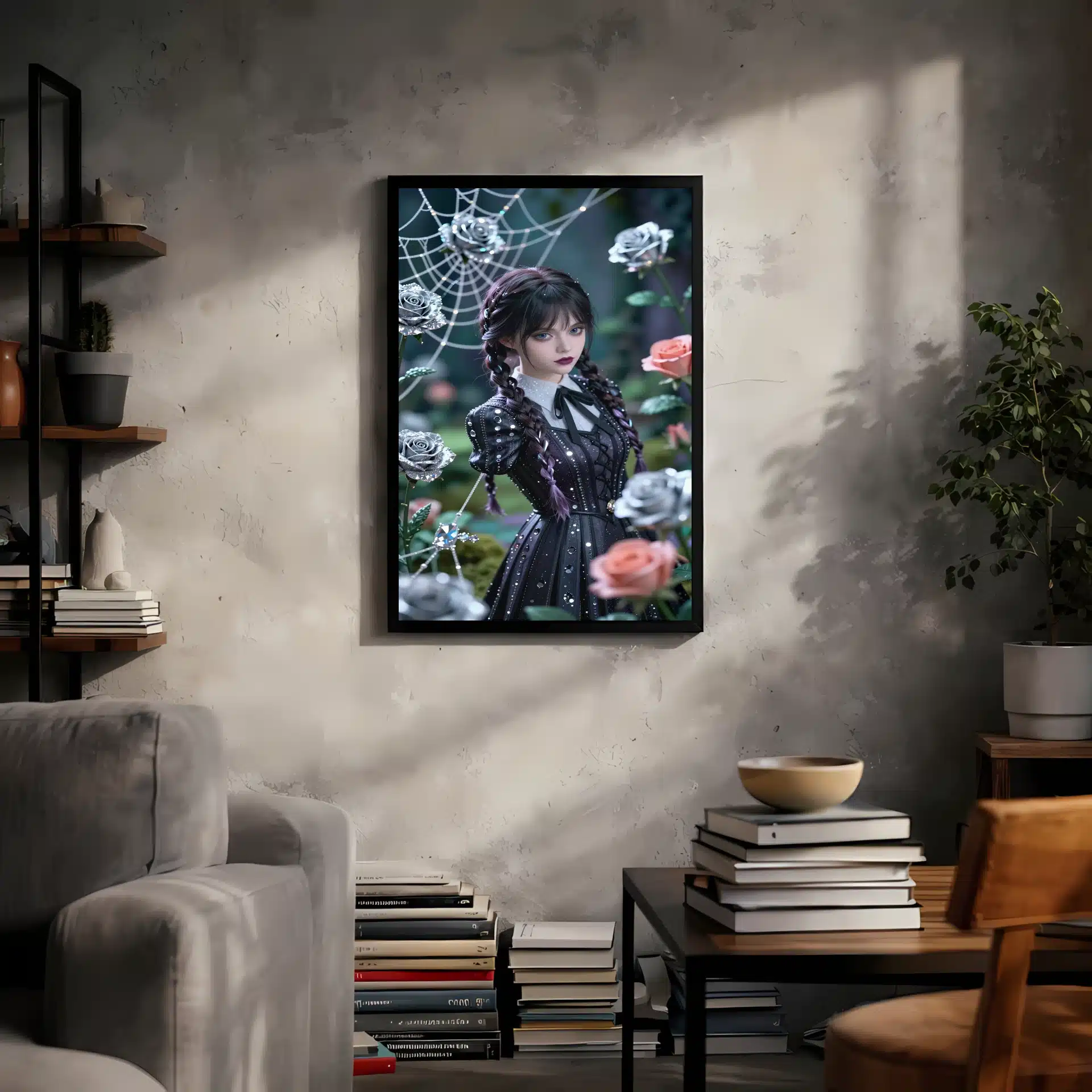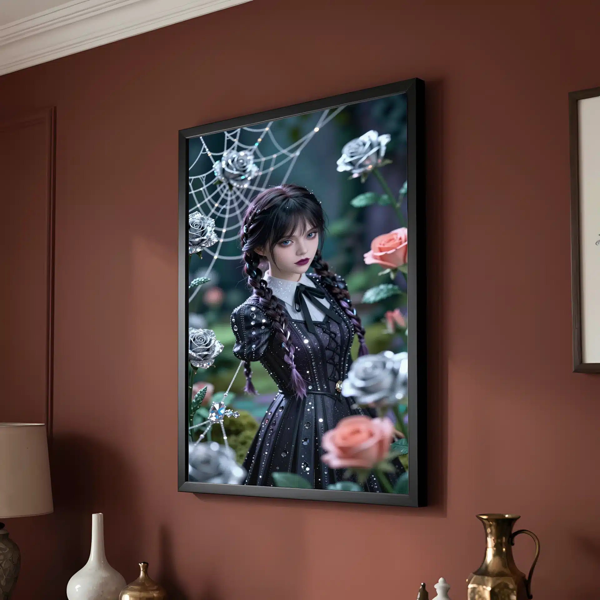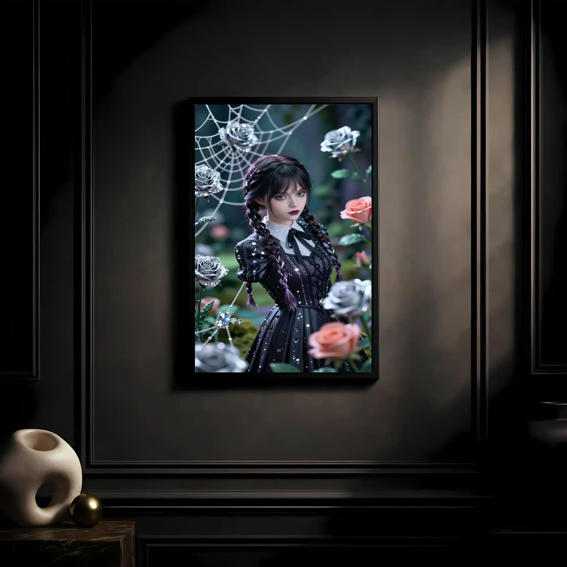 ونزدی در یک باغ گوتیک جادویی زیر نور ماه به تصویر کشیده شده است. این اثر با سبک انیمه و جزئیات کریستالی خیرهکننده، زیبایی مرموز او را در فضایی رویایی و فراواقعی به نمایش میگذارد. موهای بافتهی نمادین و چهرهی جدی او تحت نور نرم و پخششده، جلوهای فراموشنشدنی ایجاد میکند.