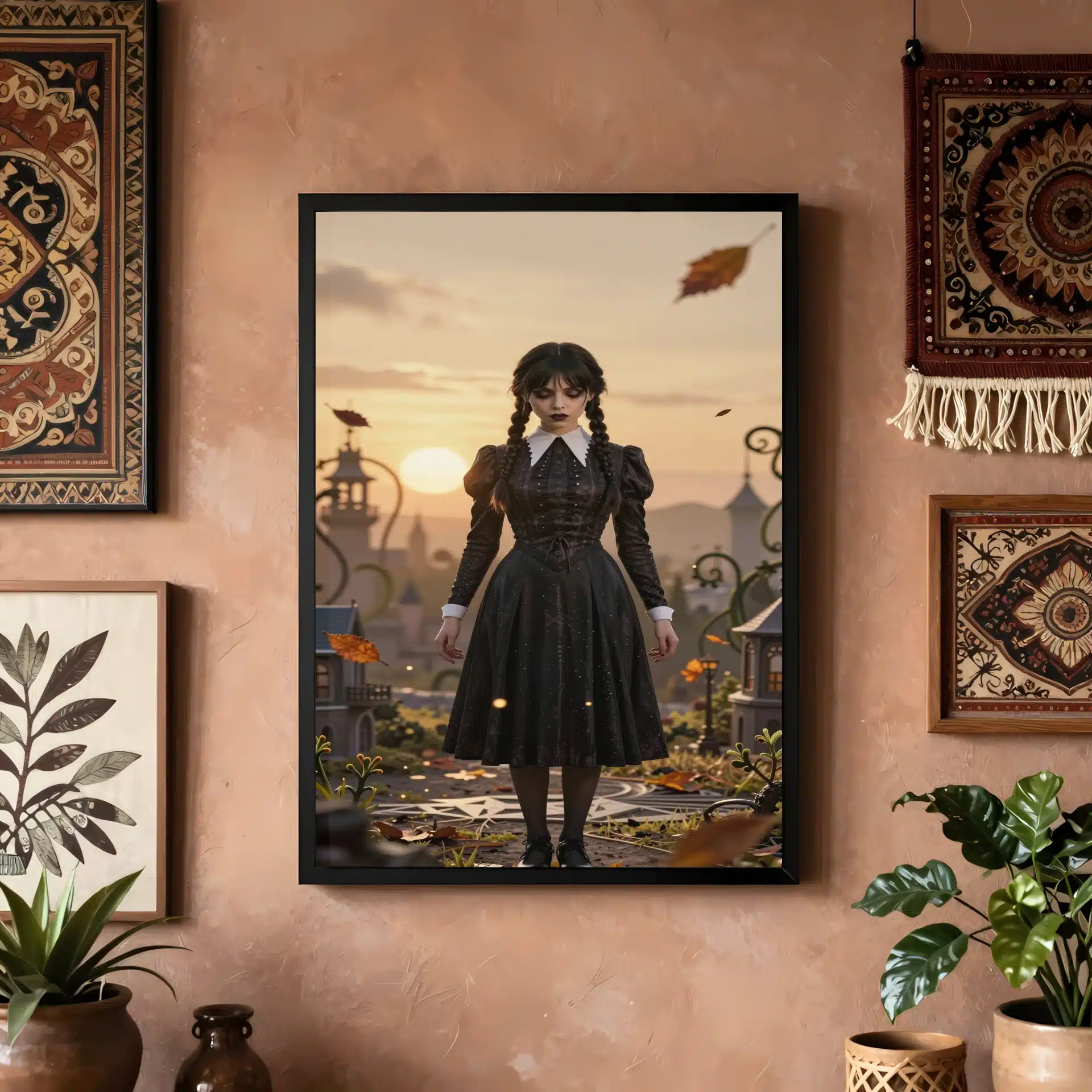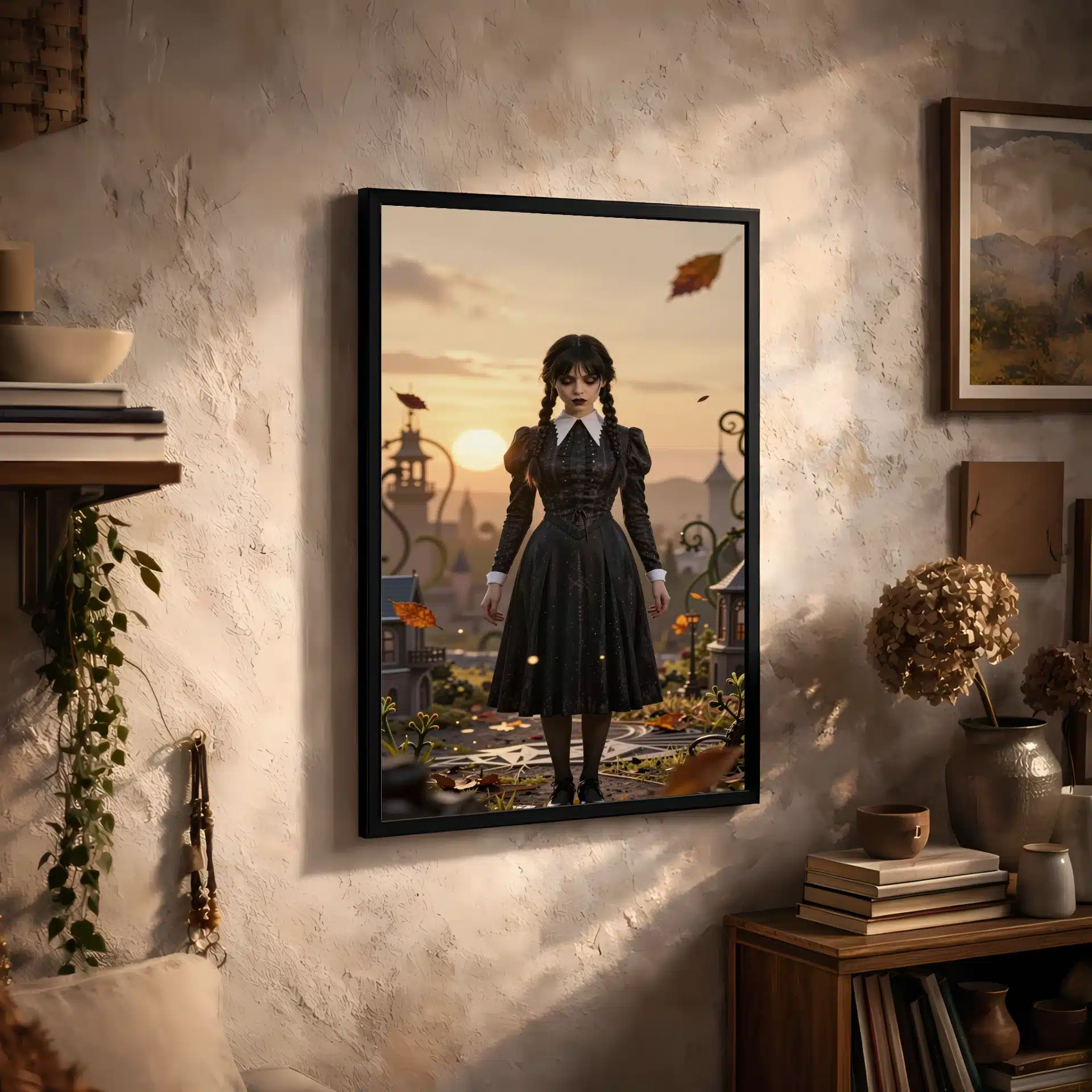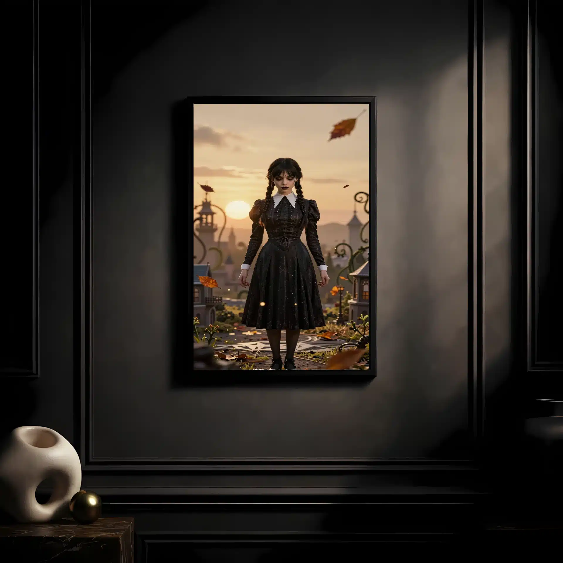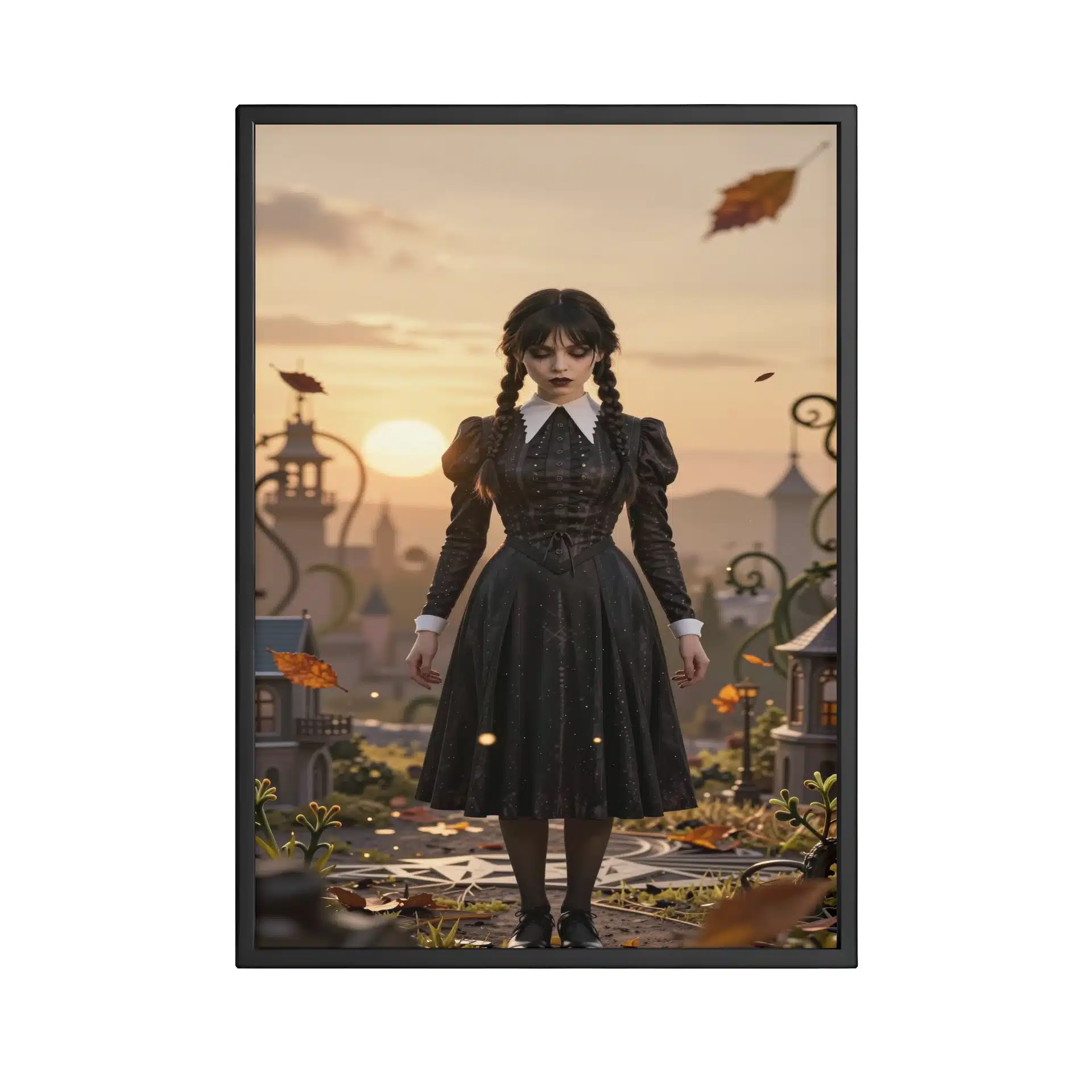 این قاب عکس با الهام از شخصیت محبوب ‘ونزدی آدامز’ طراحی شده است. تصویری خیرهکننده از ونزدی در یک منظره طلایی و رویایی، با ترکیبی از زیبایی مرموز و جذابیت انیمهای که هر بینندهای را مجذوب خود میکند.
