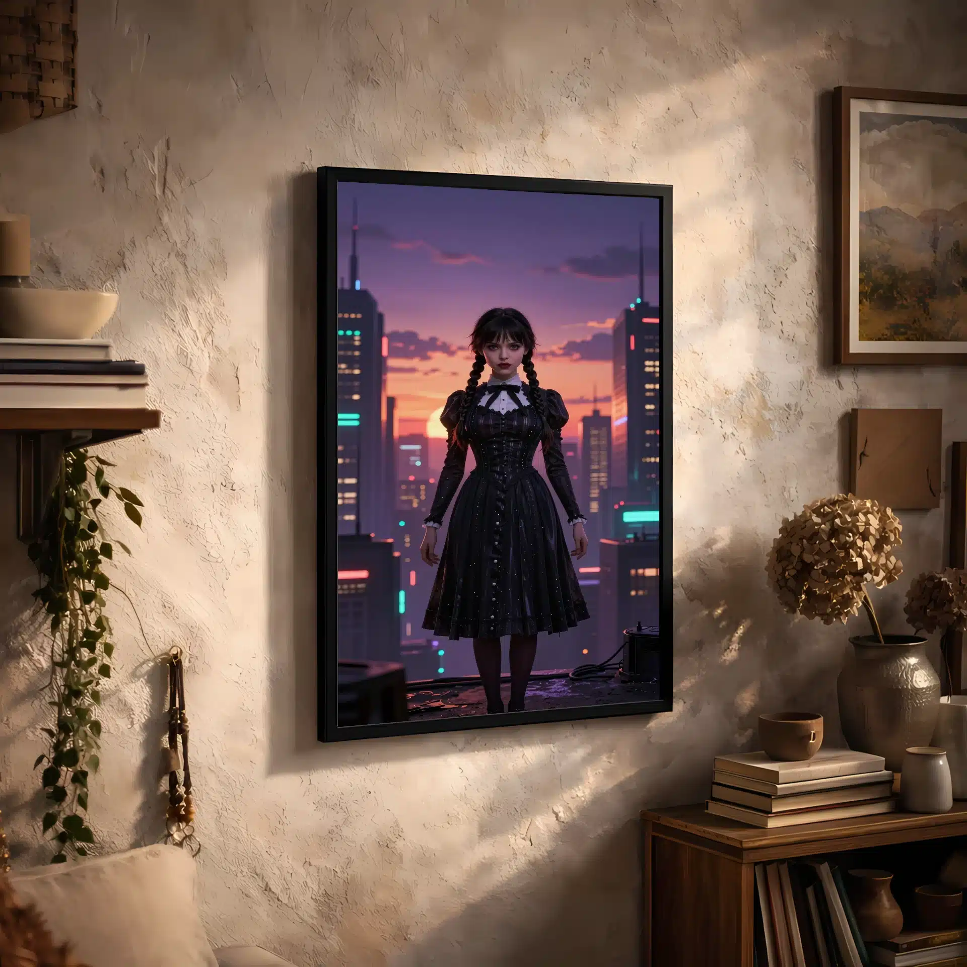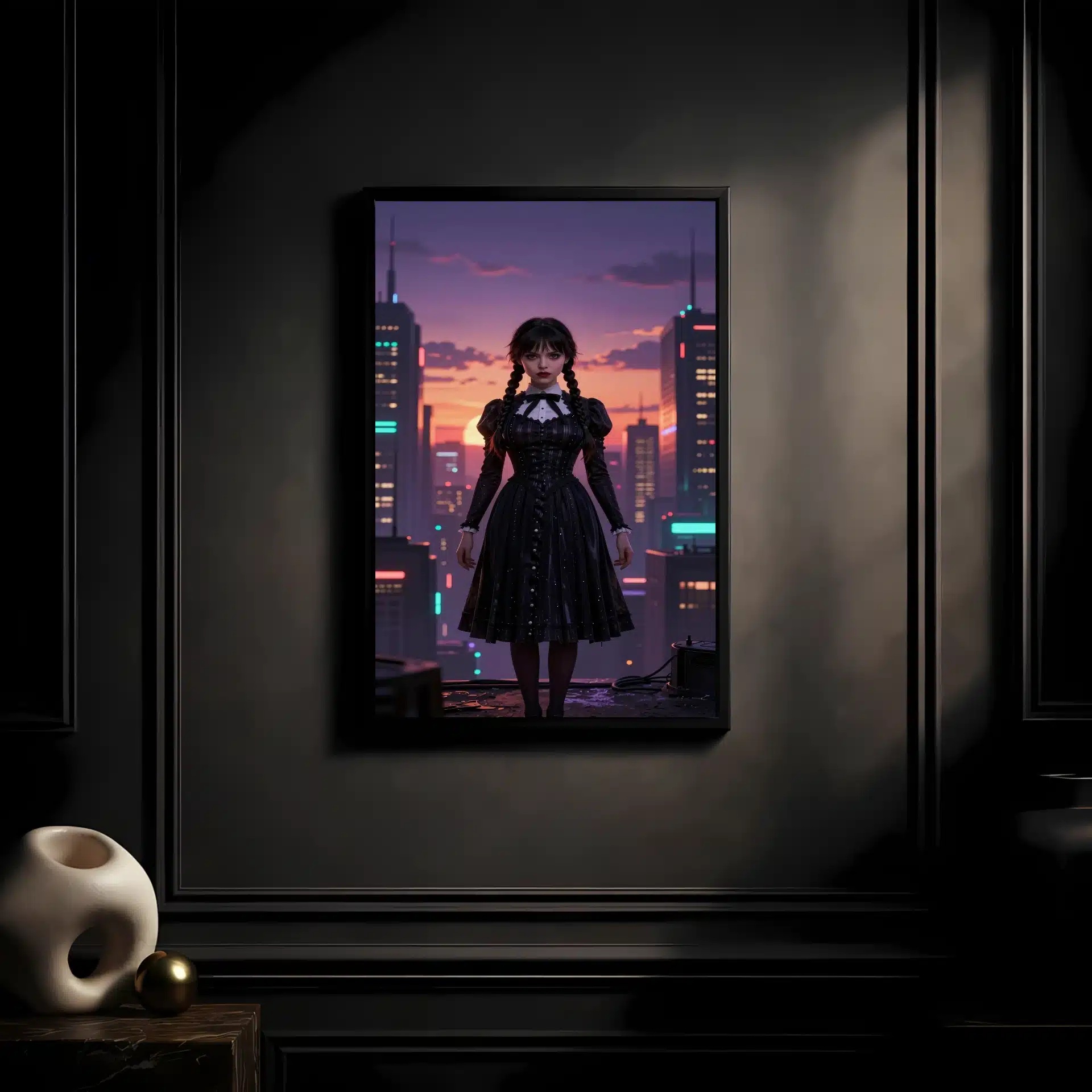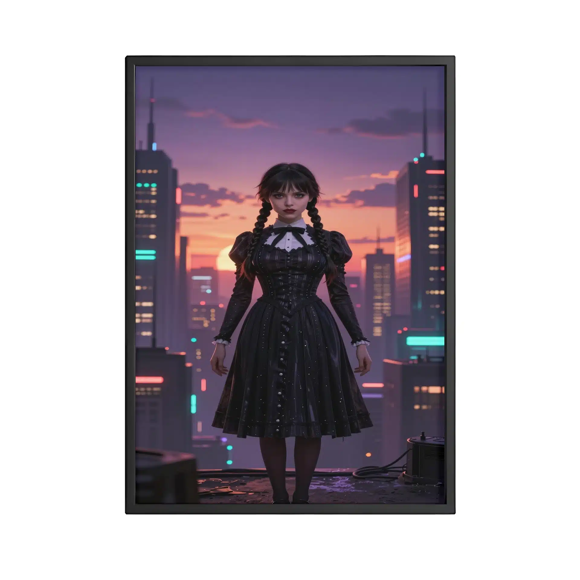 این قاب عکس از ونزدی آدامز در یک شهر سایبرپانک آیندهنگر طراحی شده است. او در غروب آفتاب بنفش و نارنجی ایستاده و نورپردازی دراماتیک، سیلوئت خیرهکنندهای از او ایجاد کرده است.