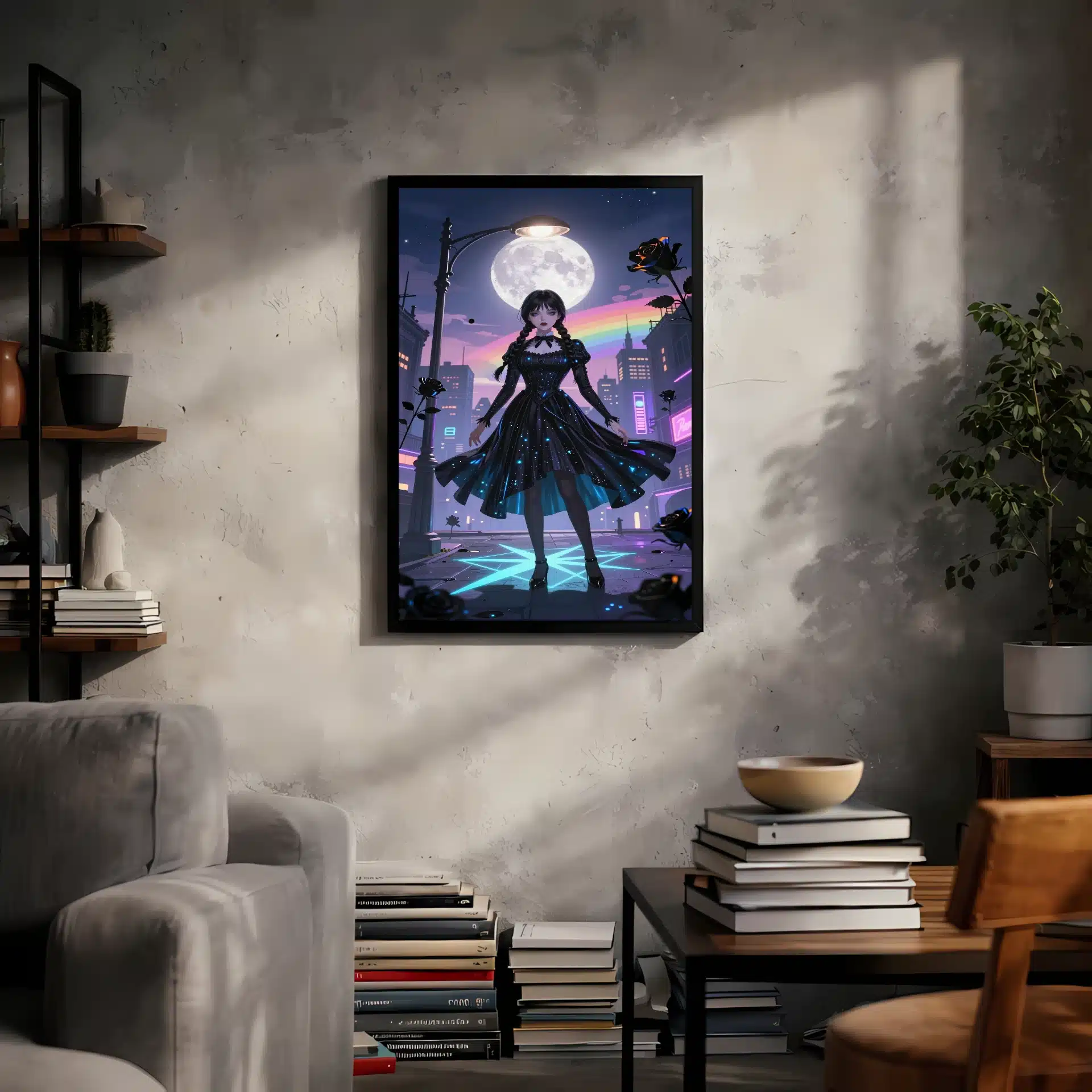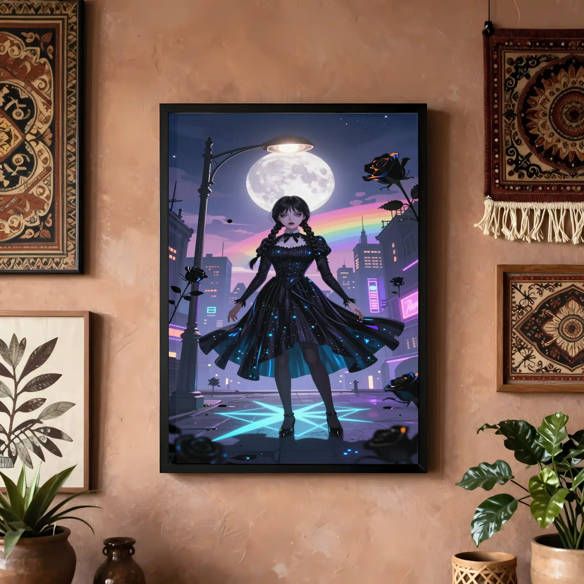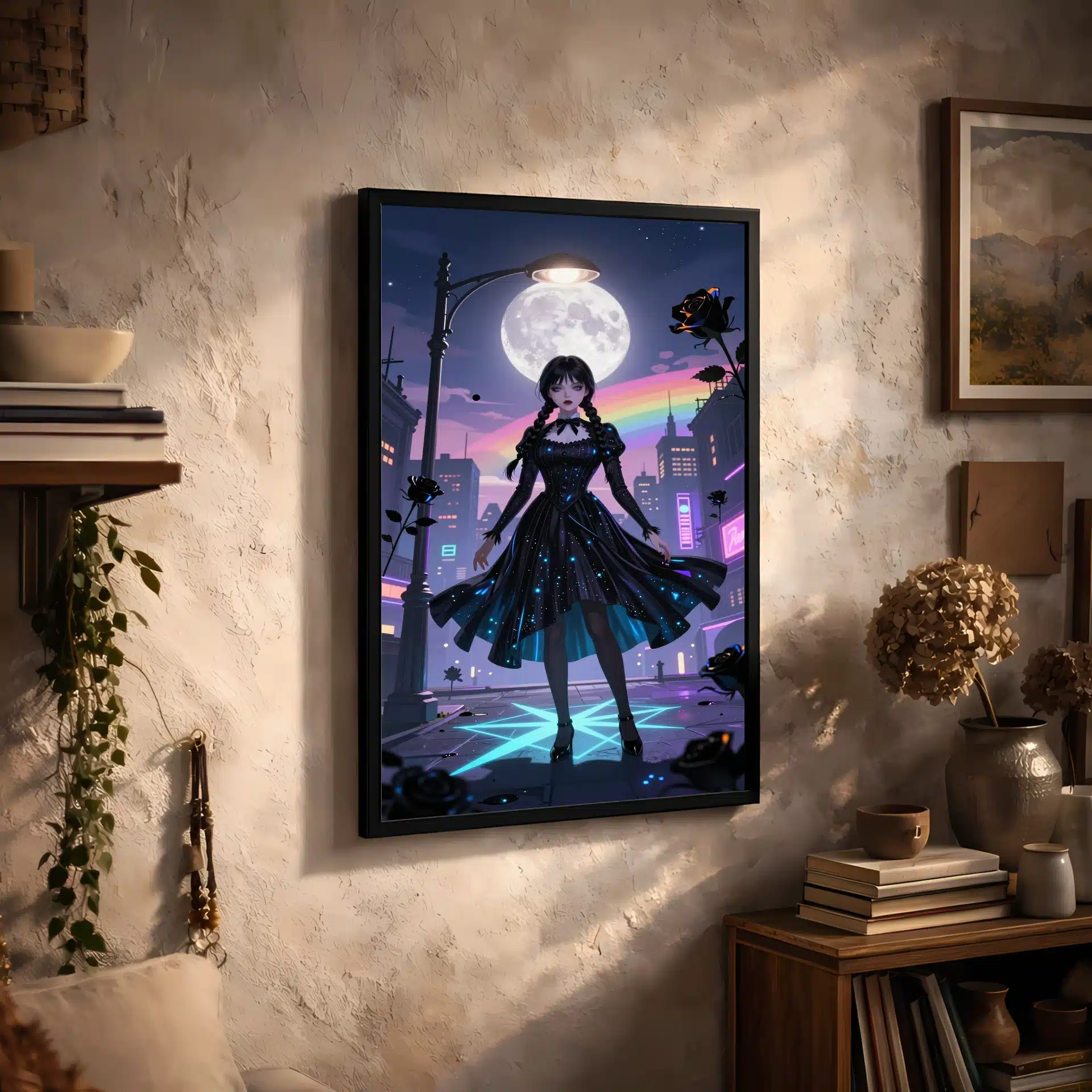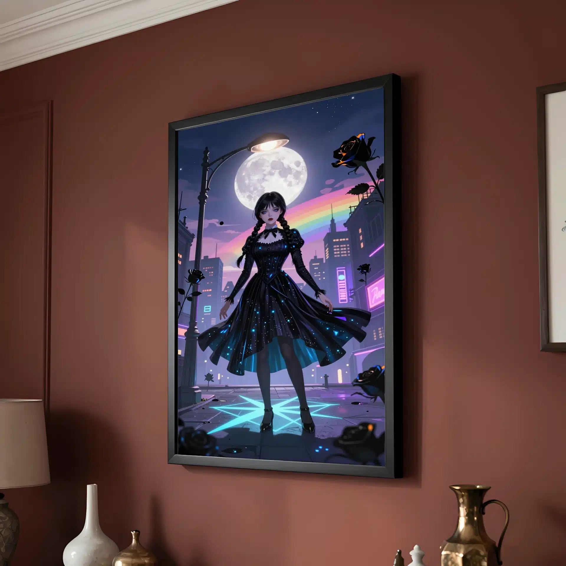 این قاب عکس از ونزدی آدامز در یک منظره شهری رویایی و شبانه طراحی شده است. با ترکیب رنگهای درخشان و سایههای دراماتیک، این اثر هنری یک تصویر خیرهکننده و منحصر به فرد را ارائه میدهد که برای علاقهمندان به سبک انیمه و طراحیهای پرجزئیات ایدهآل است.