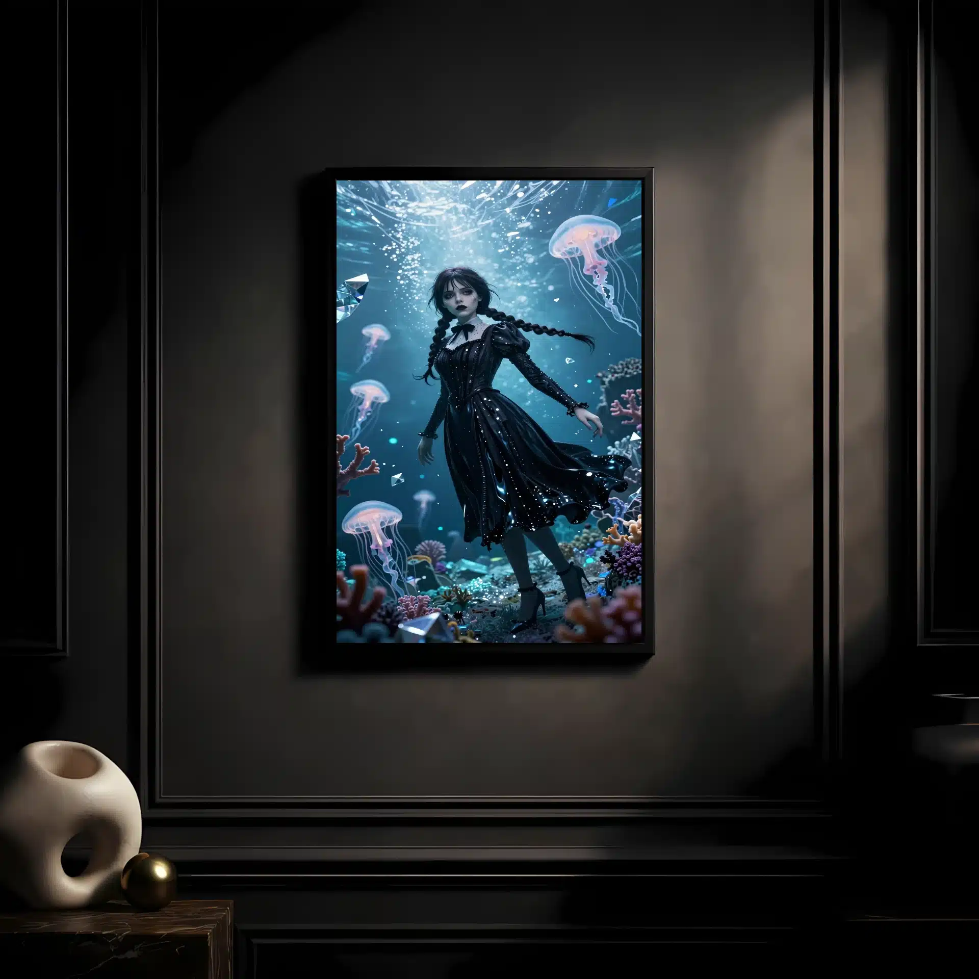 این قاب عکس با الهام از شخصیت محبوب ‘ونزدی آدامز’ طراحی شده است. صحنهای خیرهکننده از اعماق اقیانوس منجمد شمالی که در آن ونزدی با لباس سیاه نمادینش، مانند مرکبی سیال در میان جریانهای فیروزهای و نقرهای به نظر میرسد.