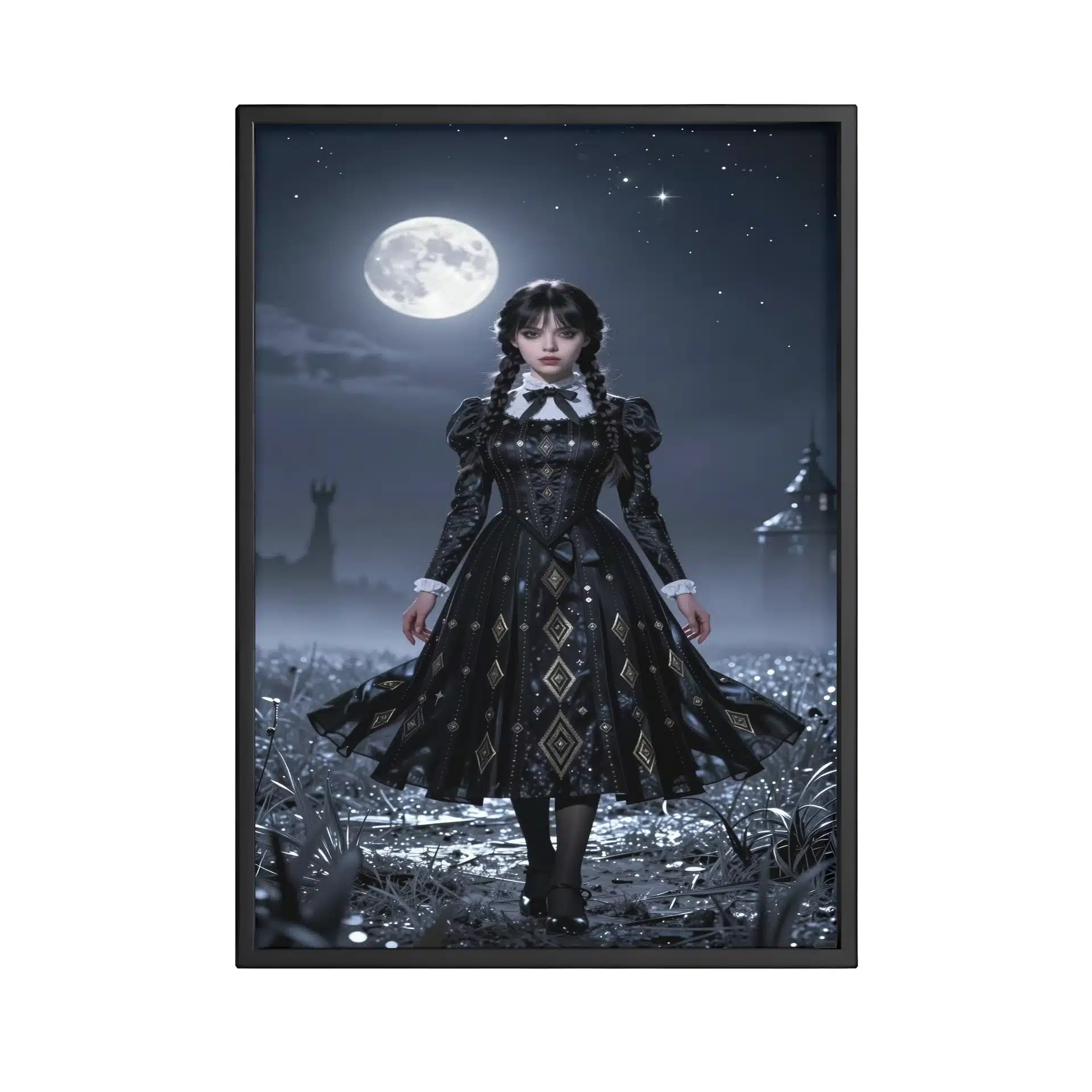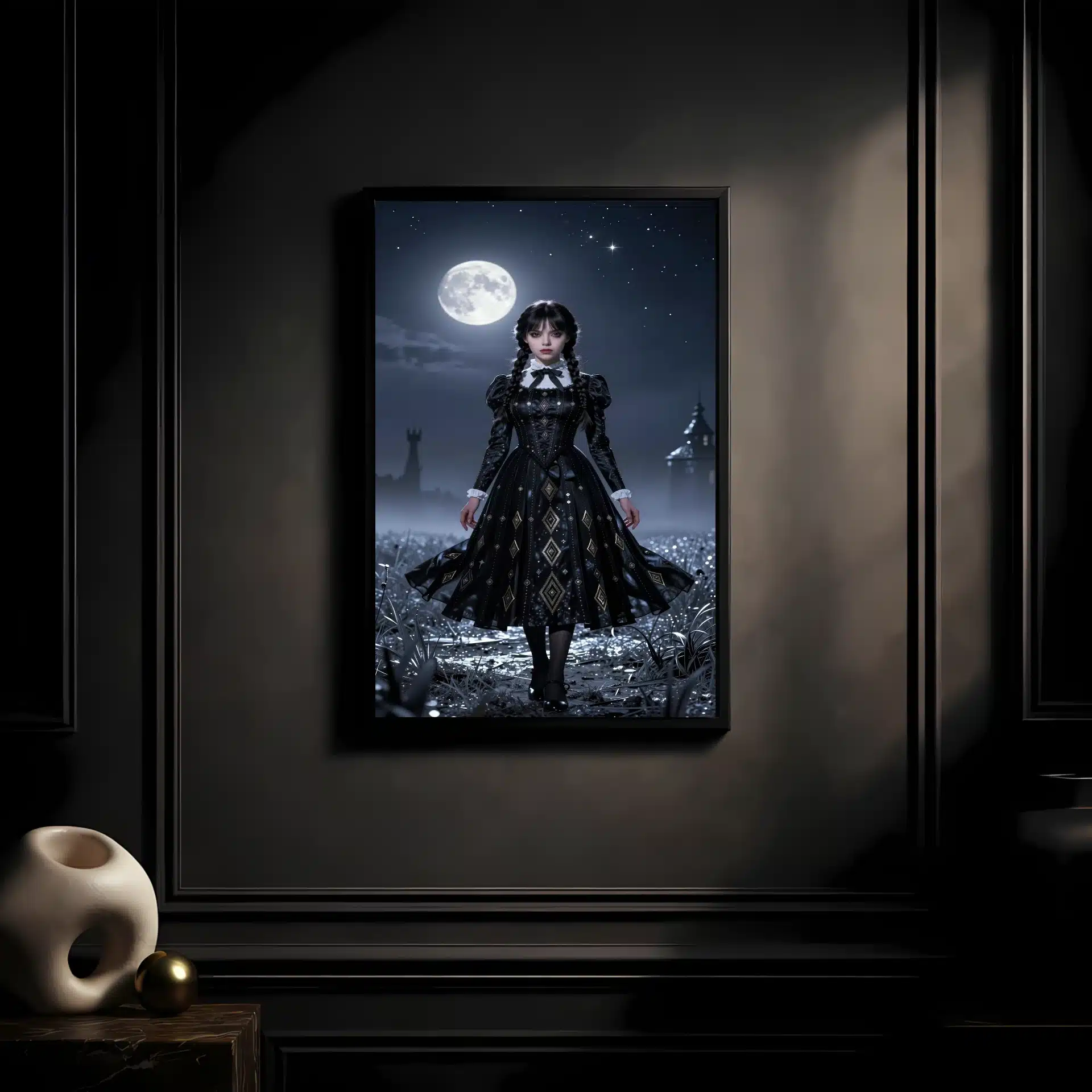 طرح شامل لباس سیاه ونزدی با نقشهای هندسی پیچیده است که در بافت پارچه بافته شدهاند. نور فلورسنت ماه و سایههای عمیق، همراه با ترکیب رنگهای آبی تیره و طلایی متالیک، جلوهای سینمایی و ویرال به اثر بخشیدهاند.