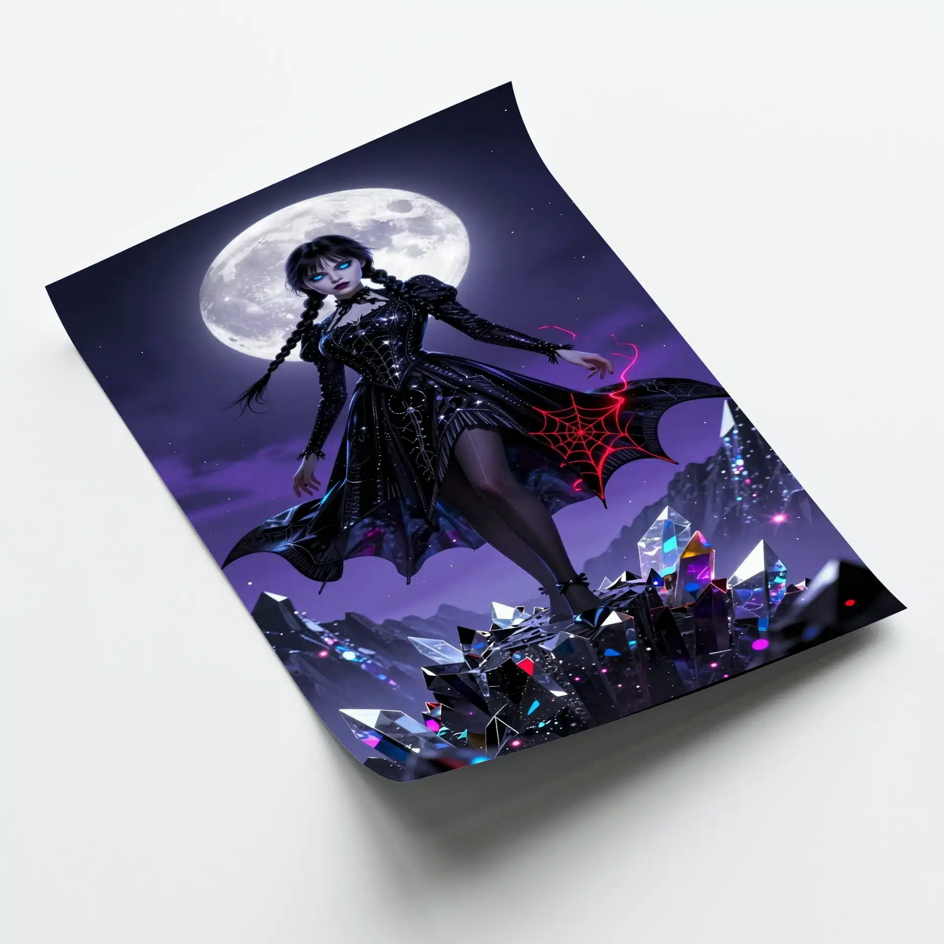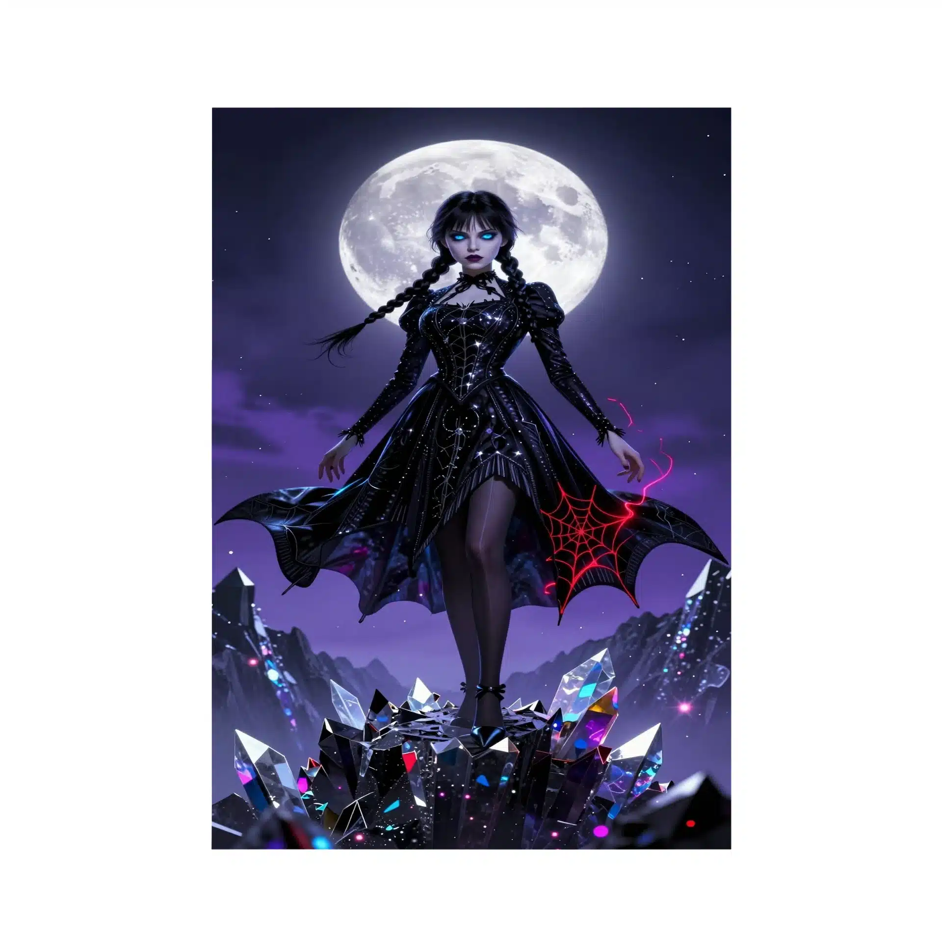 جزئیات فوقالعاده دقیق این پوستر شامل لباس سیاه با گلدوزیهای نقرهای درخشان و الگوهای تارعنکبوت قرمز است که انرژی را منتقل میکنند. پسزمینه متشکل از یخهای تیز و پرتوهای نور پراکنده، ترکیبی از بنفش نئونی و سیاه عمیق را ایجاد کردهاست.