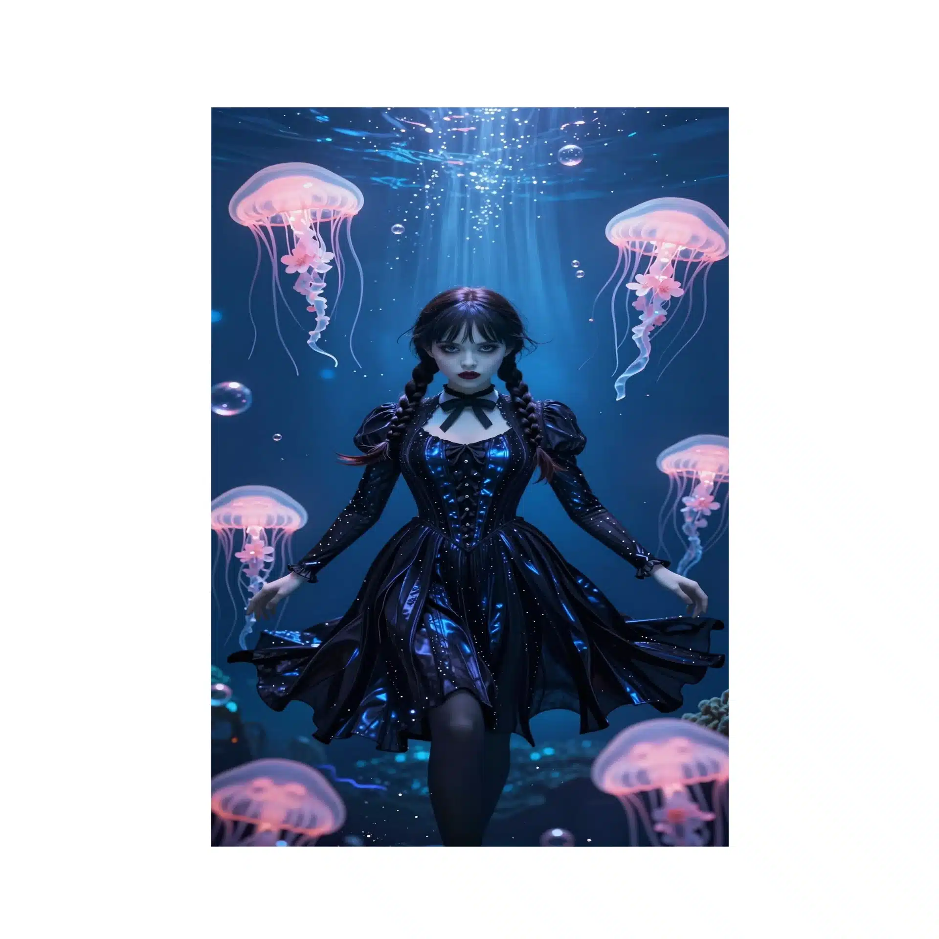 طراحي اين پوستر شامل لباس سياه Wednesday با درخشش آبي متاليك، عروس هاي دريايي صورتي نوراني و حباب هاي ماژيکال است که در نور آبي خنک غوطه ور شده اند.