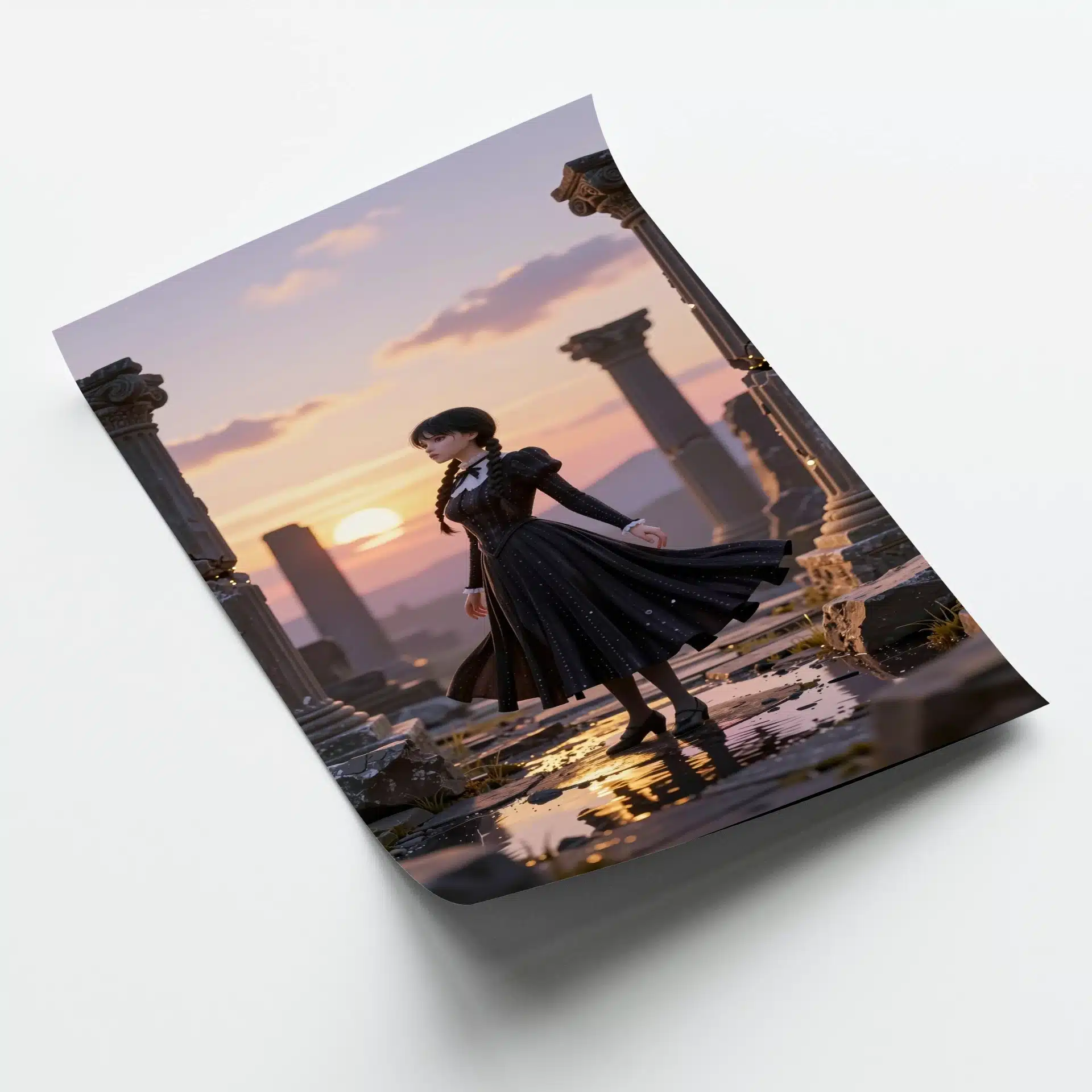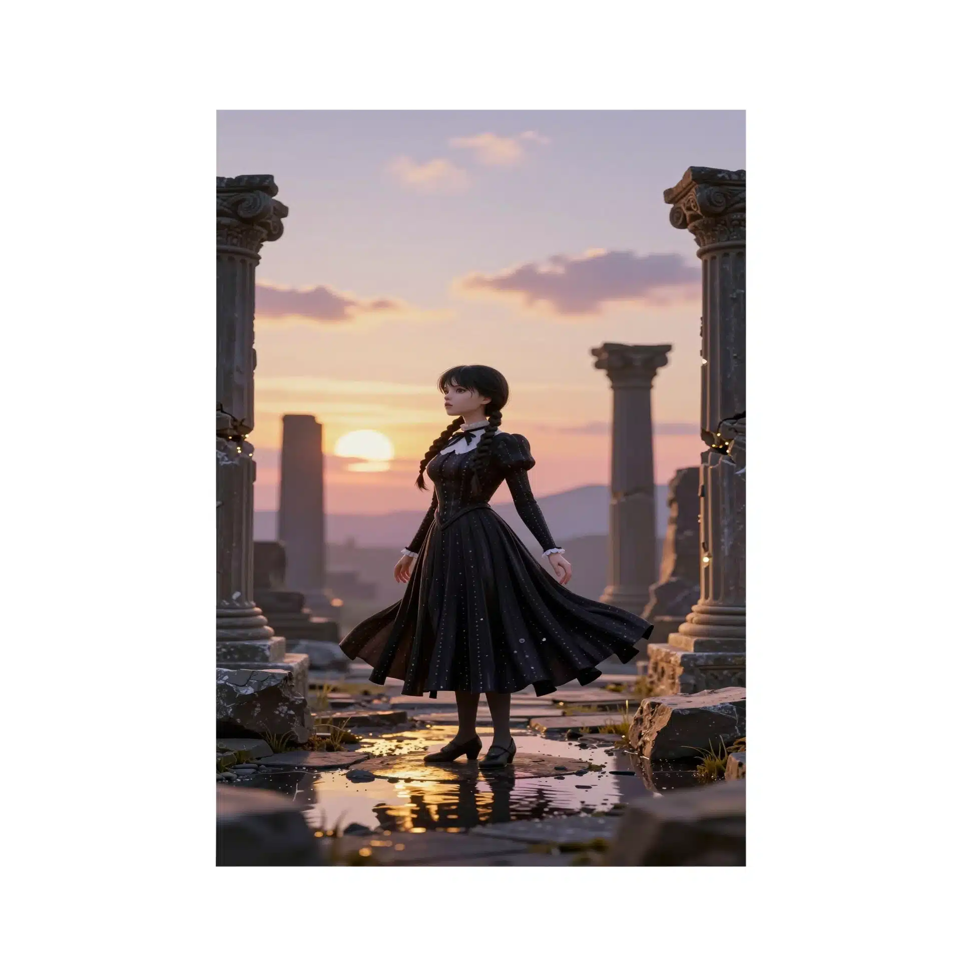 لباس سیاه نمادین او به صورت دراماتیک در باد میرقصد و ستونهای سنگی فرسوده و بازتابهای نور در حوضچههای کم عمق، فضایی رویایی خلق کردهاند. اثر tilt-shift و رنگهای پاستلی ملایم، ترکیبی خیرهکننده از نور و سایه را در آسمان گرگ و میش به نمایش میگذارند.