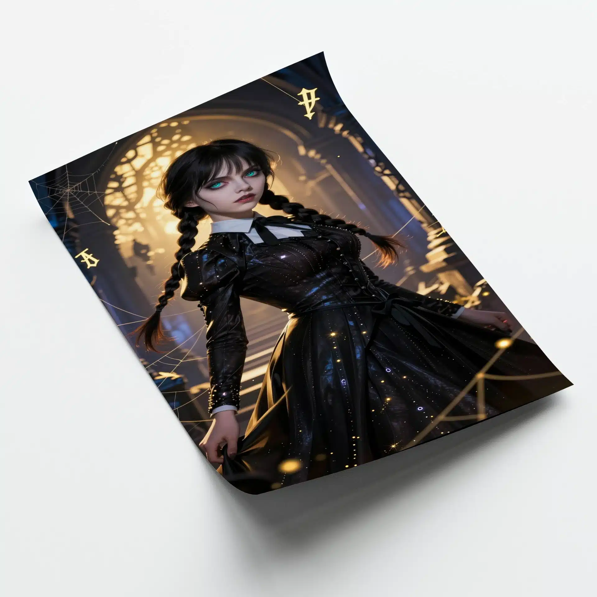 طراحی با جزئیات بالا و رزولوشن 8K، ترکیبی از سایههای آبی تیره و هایلایتهای طلایی غنی را نشان میدهد. نمادهای گوتیک شناور و تارعنکبوتهای ظریف که نور طلایی را منعکس میکنند، به تصویر عمق و جذابیت ویژهای بخشیدهاند.
