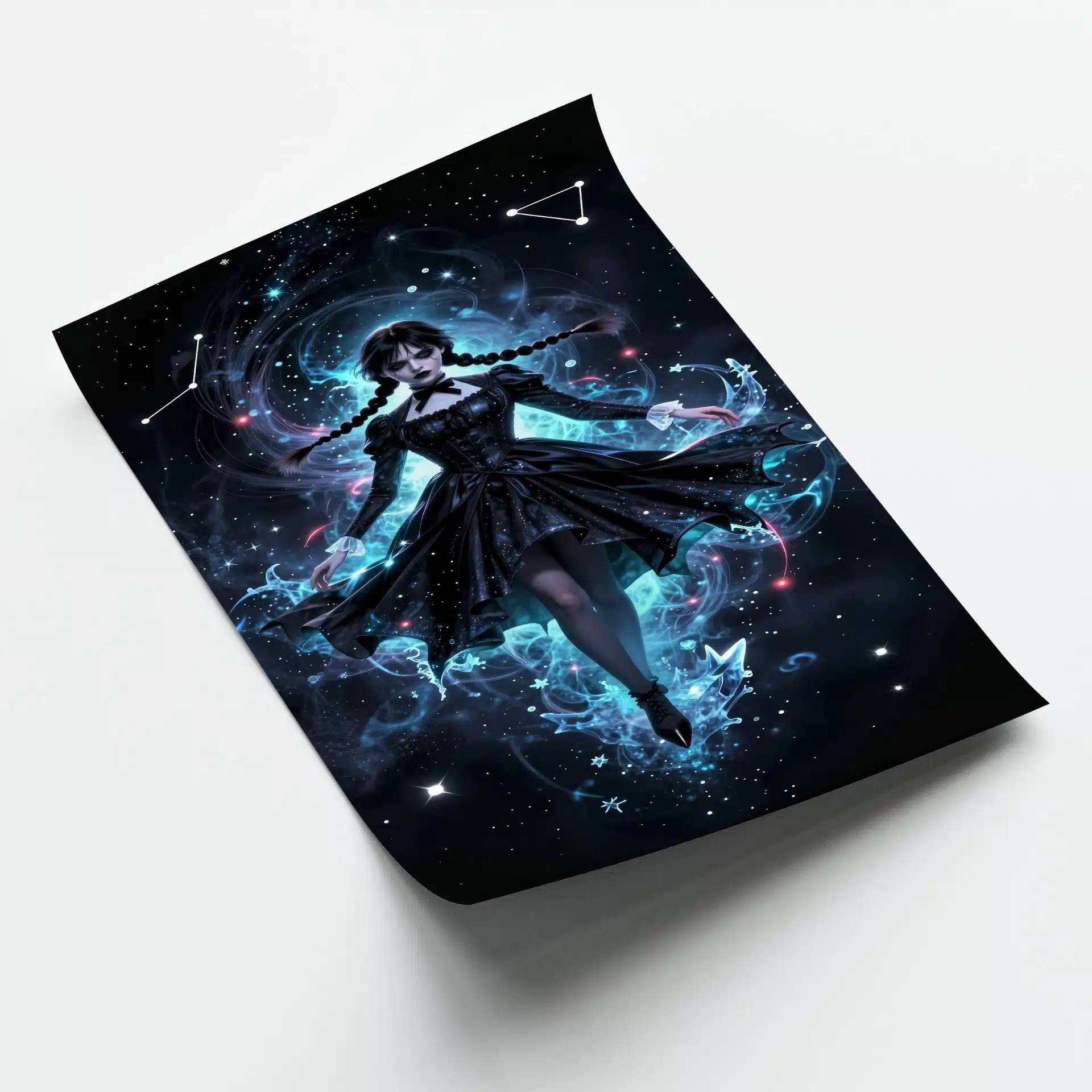 پوستر ‘ونزدی’ با الهام از شخصیت ونزدی آدامز، تصویری خیرهنده از او را در فضای یخی و بیکران فضا به نمایش میگذارد. این اثر با سبک انیمهای و نورپردازی خیرهکننده، ترکیبی از جذابیت گوتیک و شگفتیهای کیهانی را ارائه میدهد.