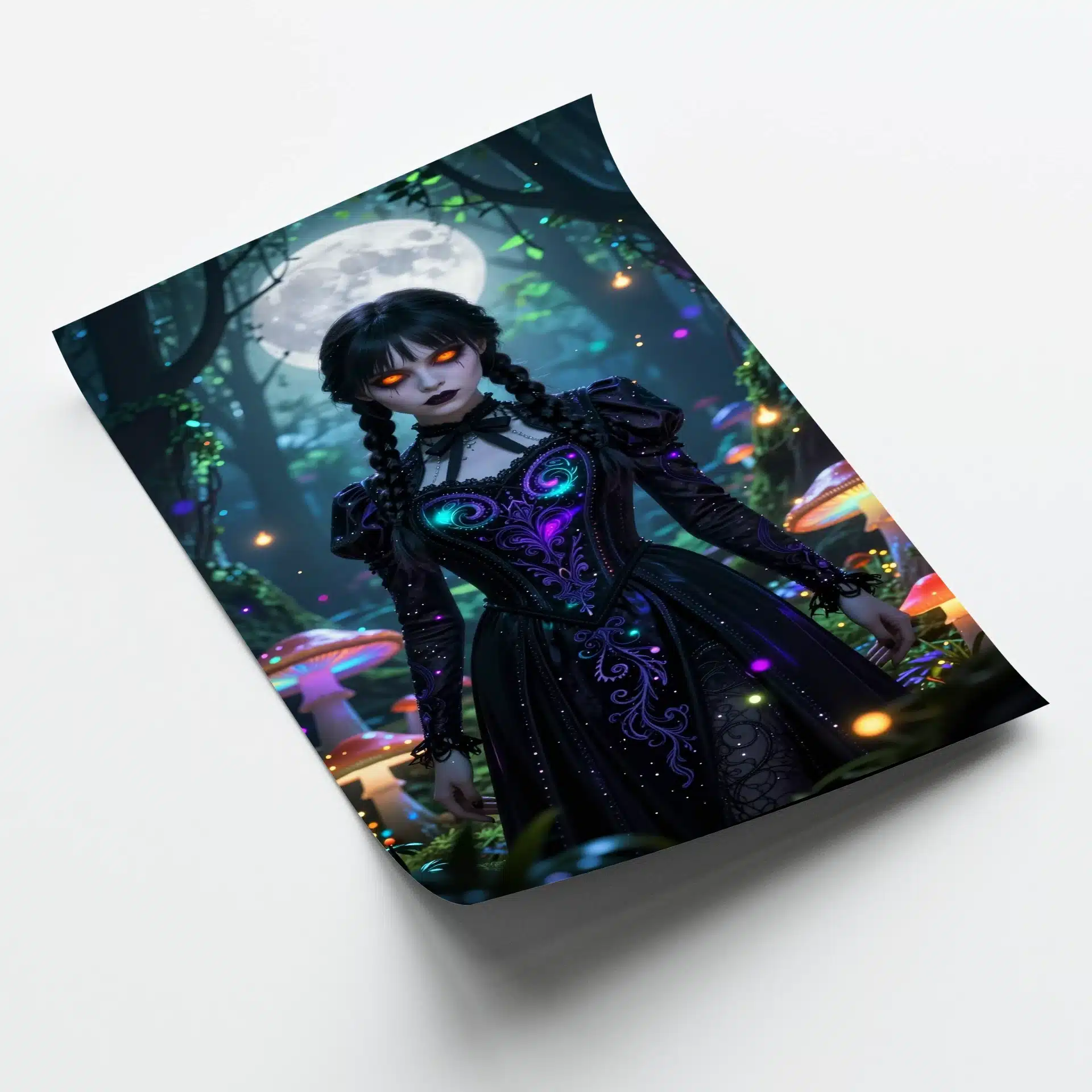 پوستر ‘ونزدی’ با الهام از شخصیت محبوب و جذاب وندزدی آدامز طراحی شده است. این اثر هنری با ترکیب فضای گوتیک و عناصر فانتزی مدرن، صحنهای خیرهکننده از او را درون یک جنگل افسونشده و نورانی به تصویر میکشد.