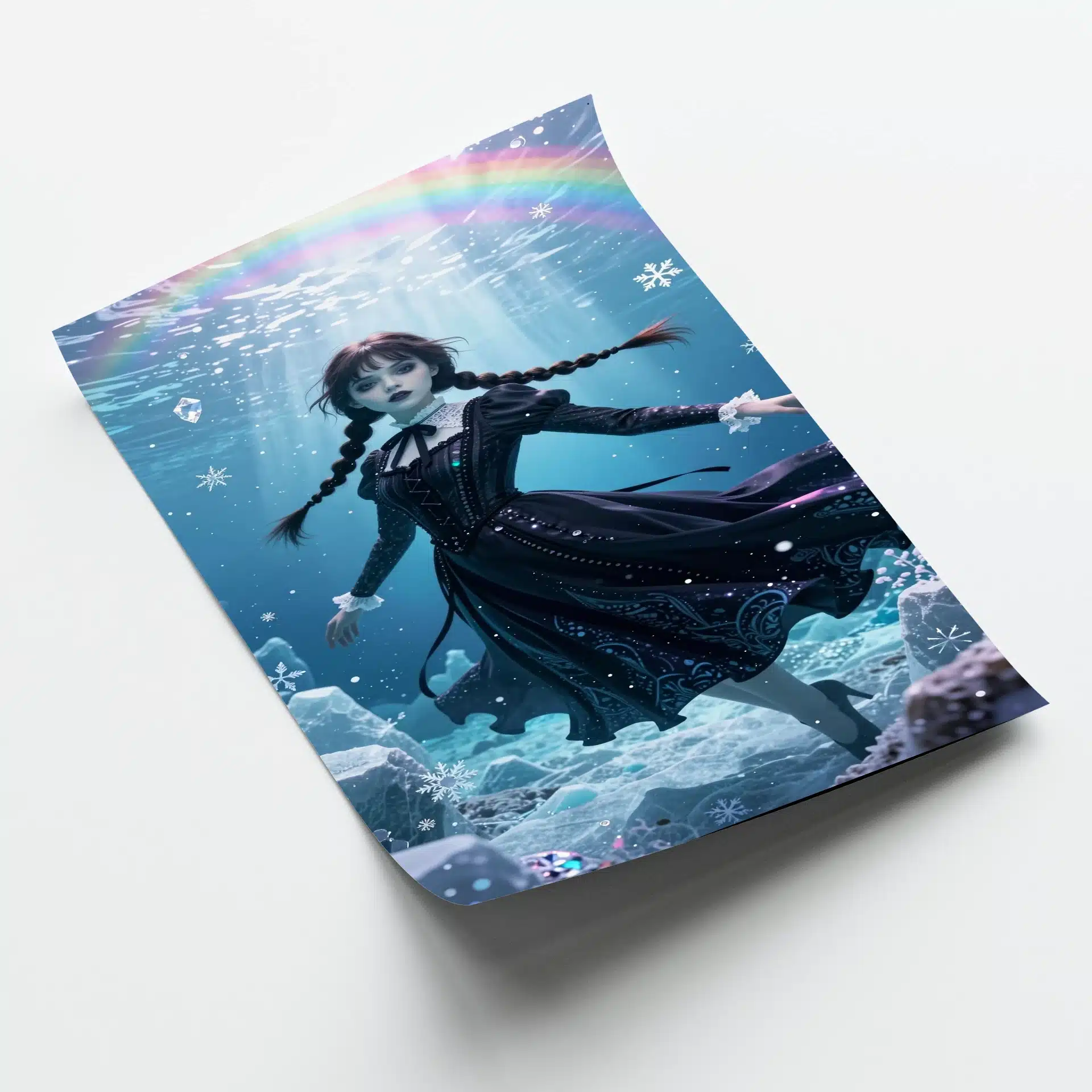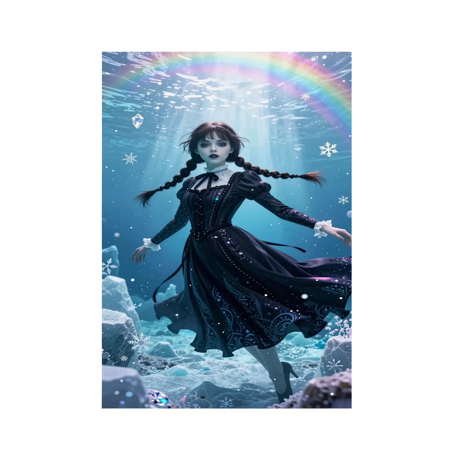 طراحی این پوستر با نورپردازی نرم و ذرات برف الماسگونه، عمق و رویایی بودن فضا را تقویت میکند. جزئیات بالا در رندر 8K، از بافت لباس سیاه تا تارهای موی بافتهشده، زیبایی منحصربهفردی را خلق کرده.