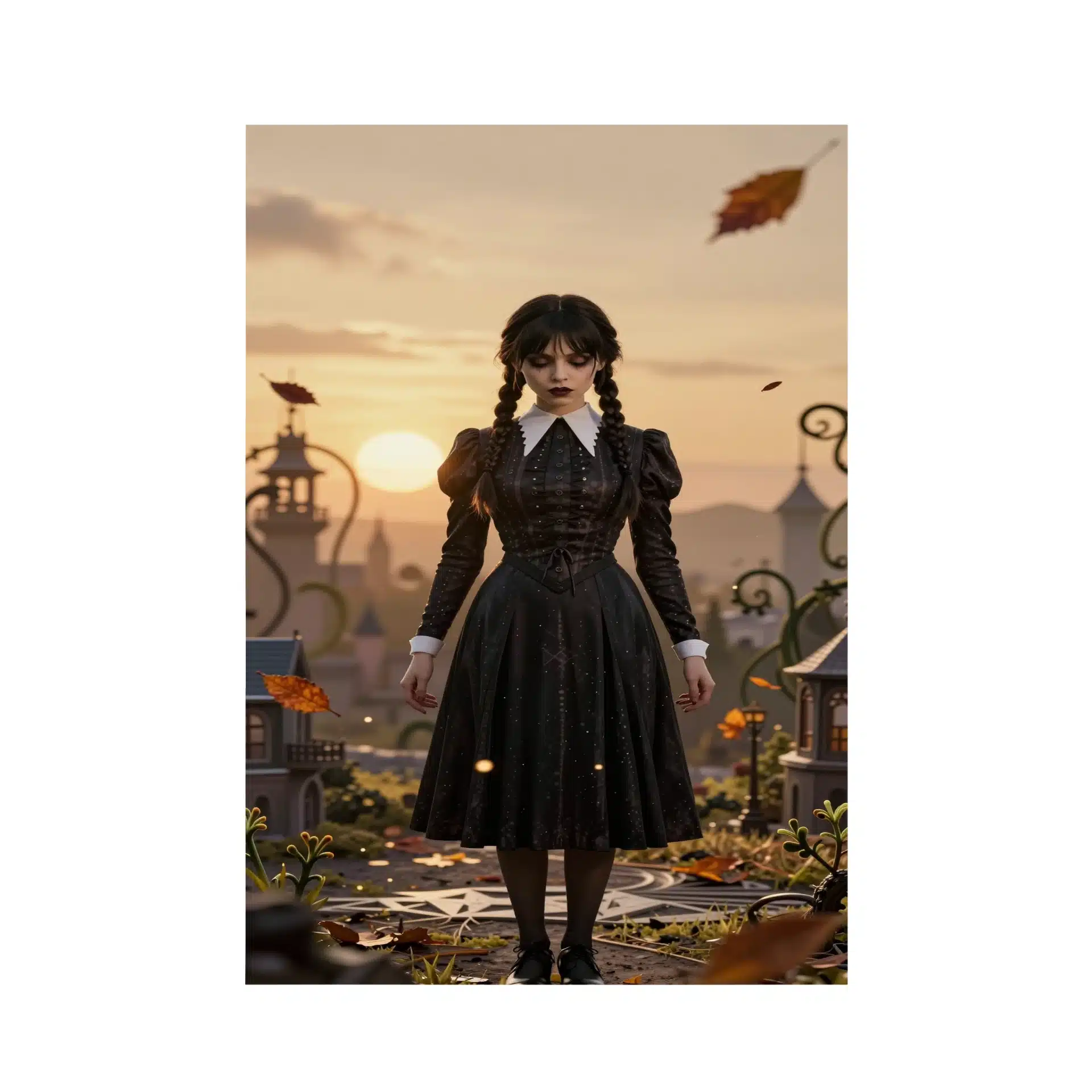 طراحی این پوستر با جزئیات بالا و نورپردازی سینمایی، ونزدی را با لباس سیاه و یقه سفید در مرکز یک صحنه مینیاتوری تیلت-شیفت قرار داده است. الگوهای هندسی و برگهای پاییزی با افکت بوکه ظریف، عمق و جذابیت بصری خارقالعادهای به تصویر بخشیدهاند.