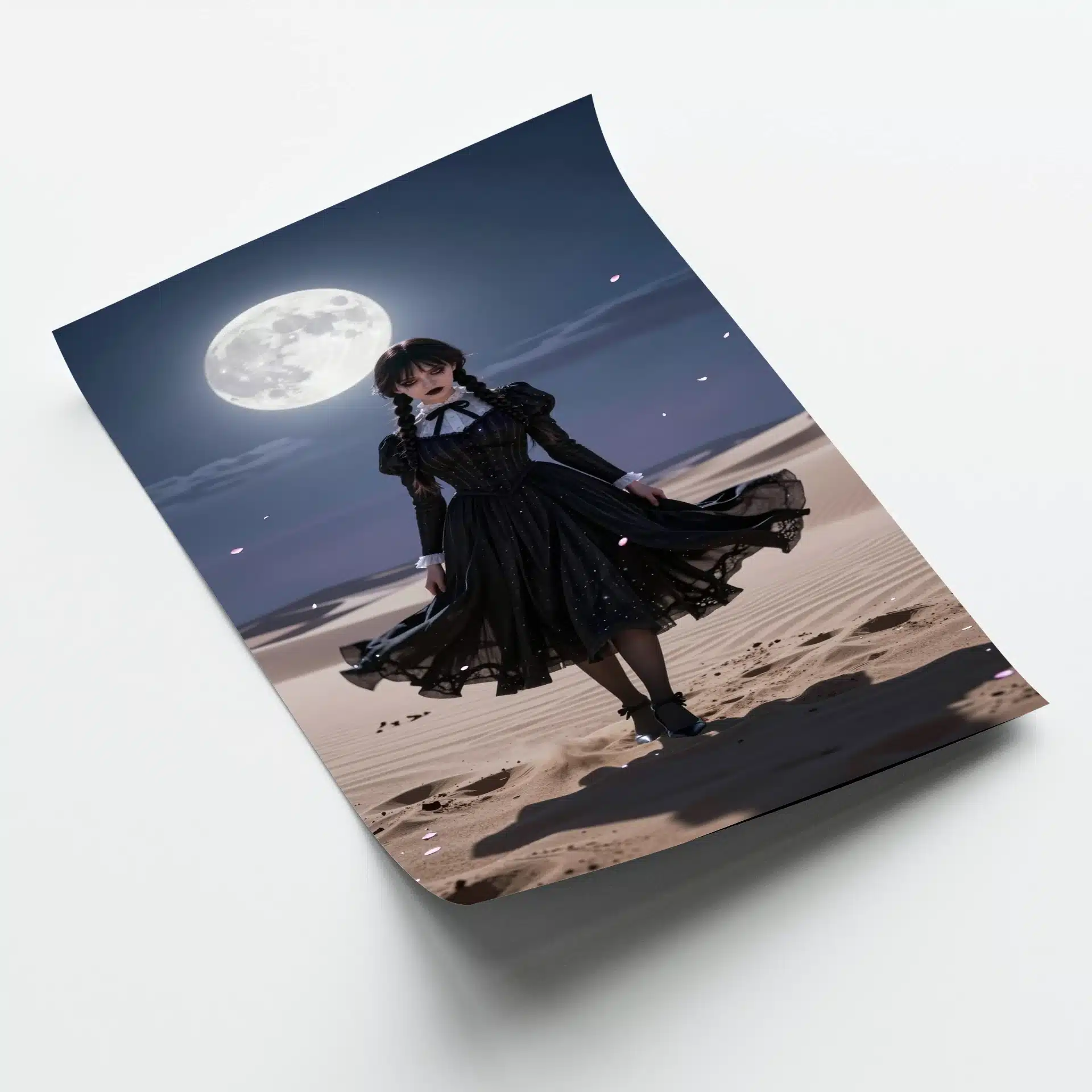پوستر محصول ‘ونزدی’ با الهام از شخصیت جذاب و گوتیک ‘ونزدی آدامز’ طراحی شده است. این اثر با سبک انیمهال و کیفیت 8K، صحنهای خیرهکننده از او را در یک بیابان وسیع زیر آسمانی گرگومیش به تصویر میکشد.