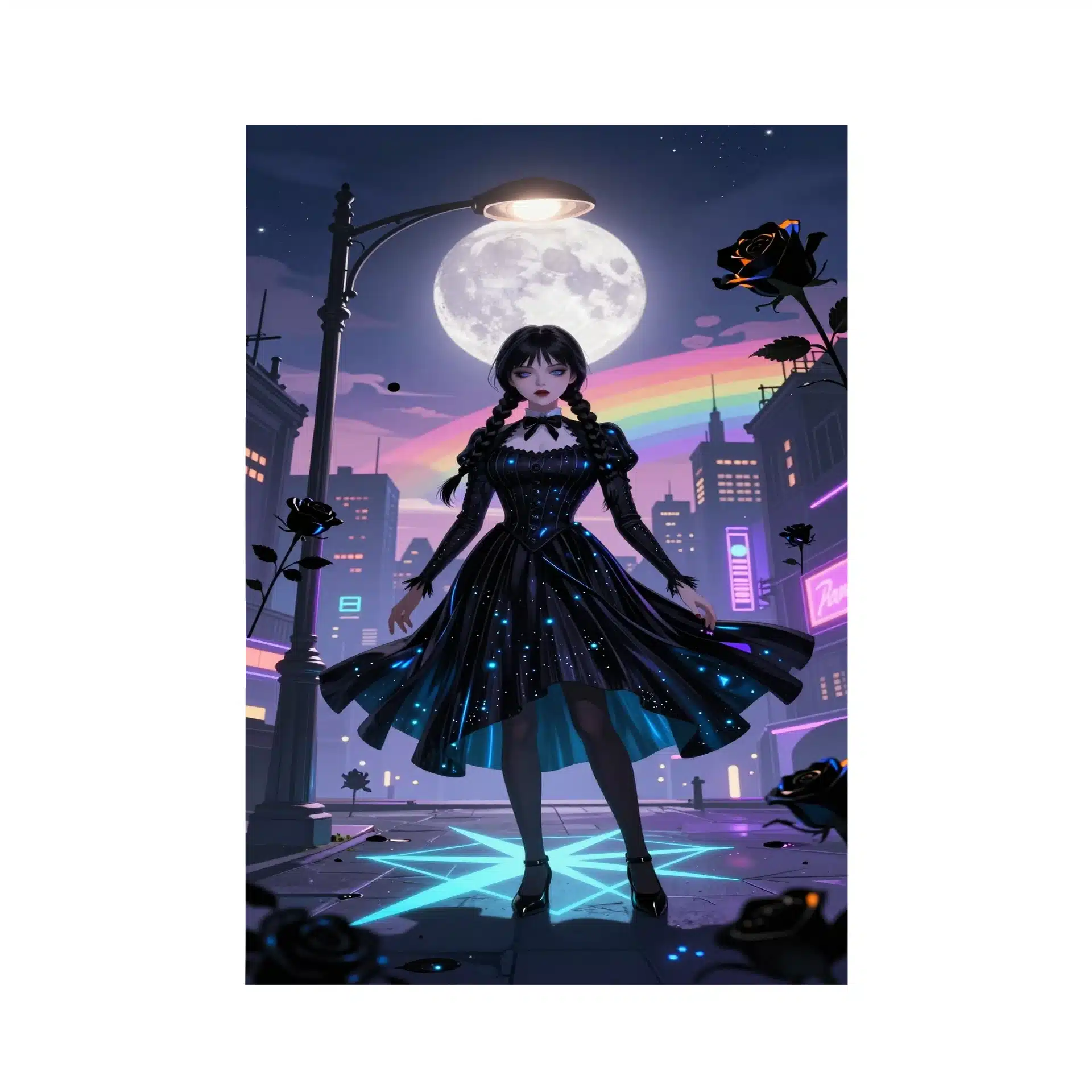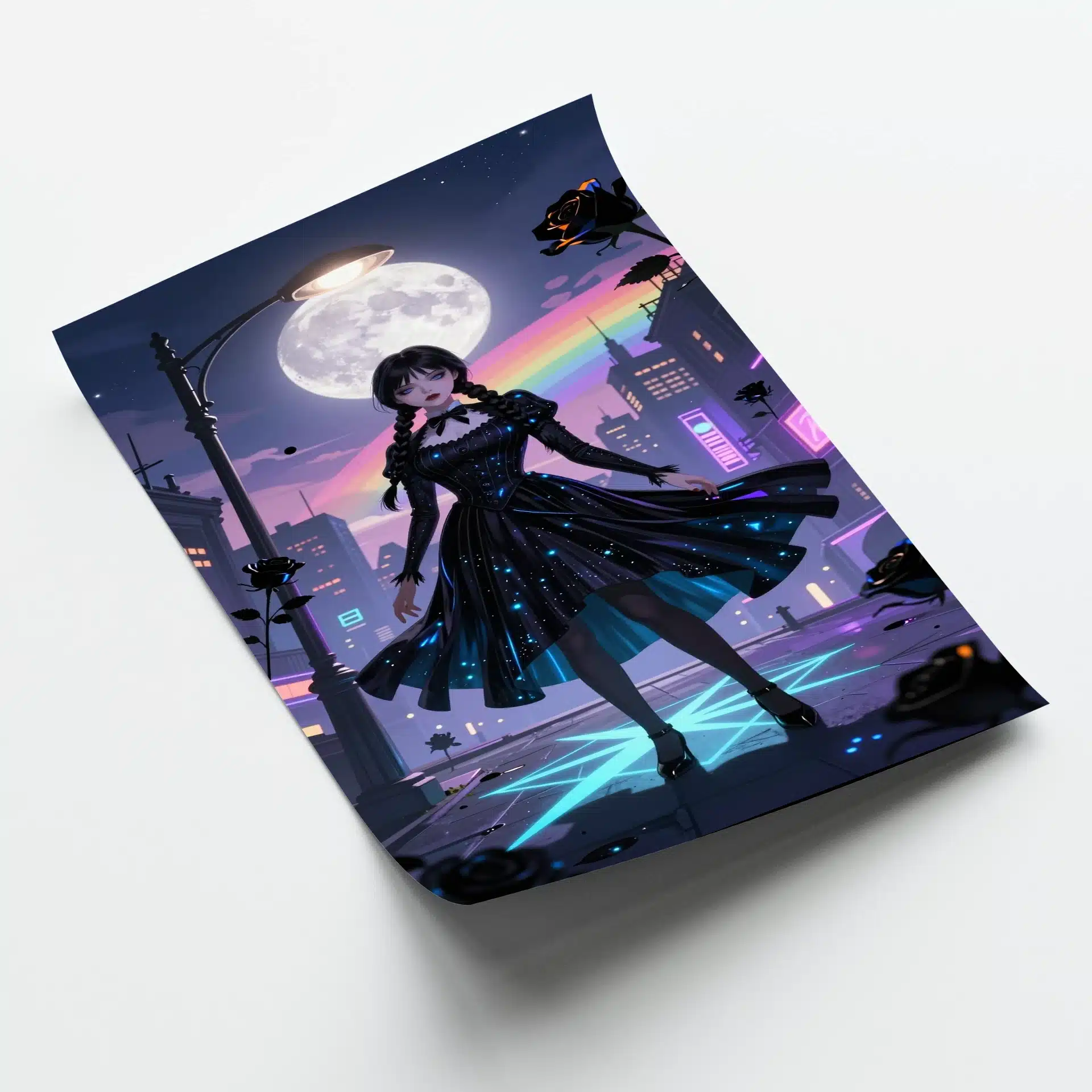 طراحي اين پوستر شامل لباس سياه نمادين ونزدي با هايلايتهاي آبي فلورسنت، آسمان رنگينمانند پاستلي و منظره شهري با نورپردازي نئون در پرسپکتيو فيشآي است. گلهاي سياه شناور با انعکاسهاي بنفش و نارنجي و سايههاي دراماتيک تحت نور ماه، به فضاي اسرارآميز اثر افزودهاند.