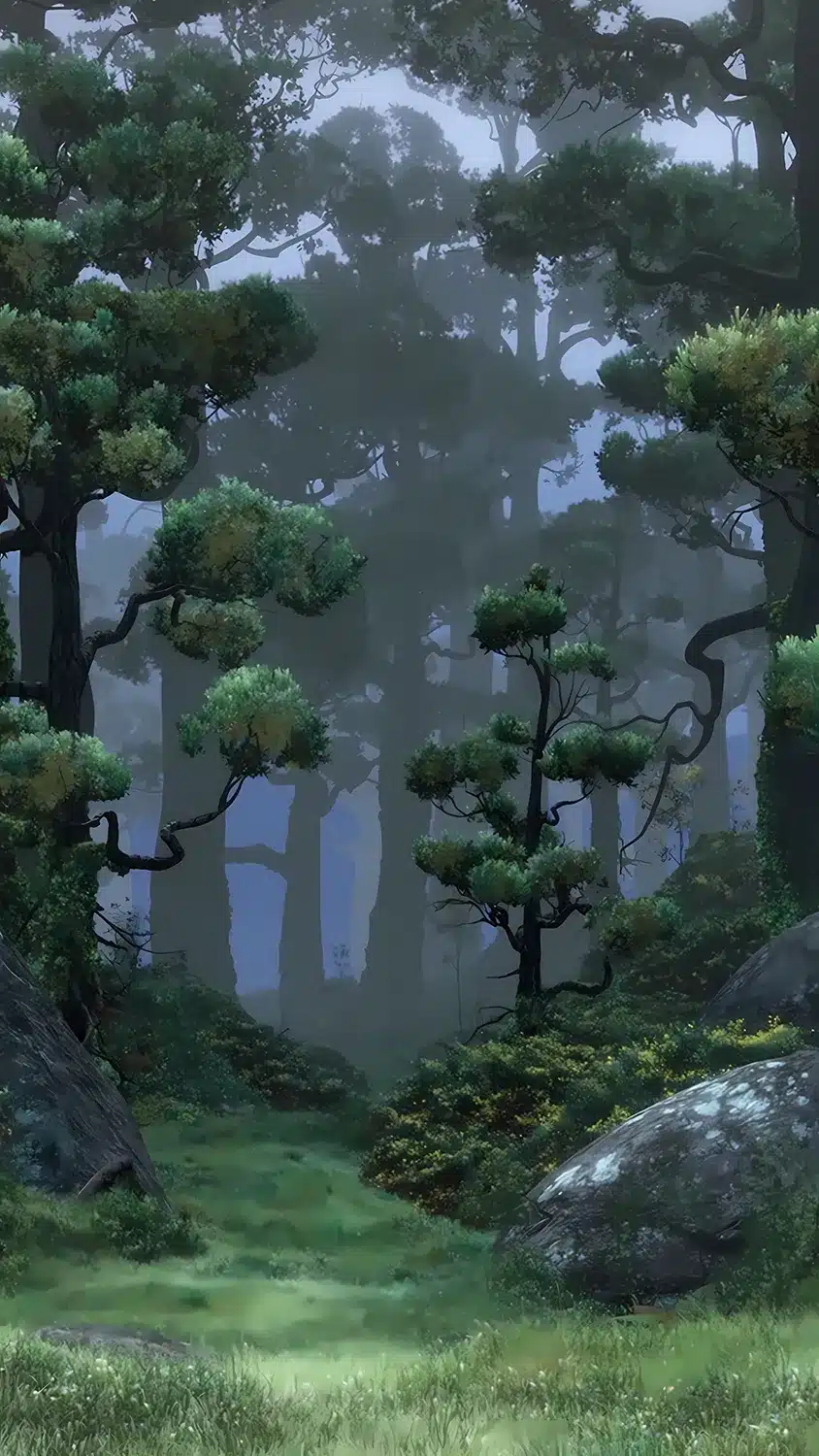 منظره جنگل‌های مه آلود و ارواح آبی در انیمیشن دلاور