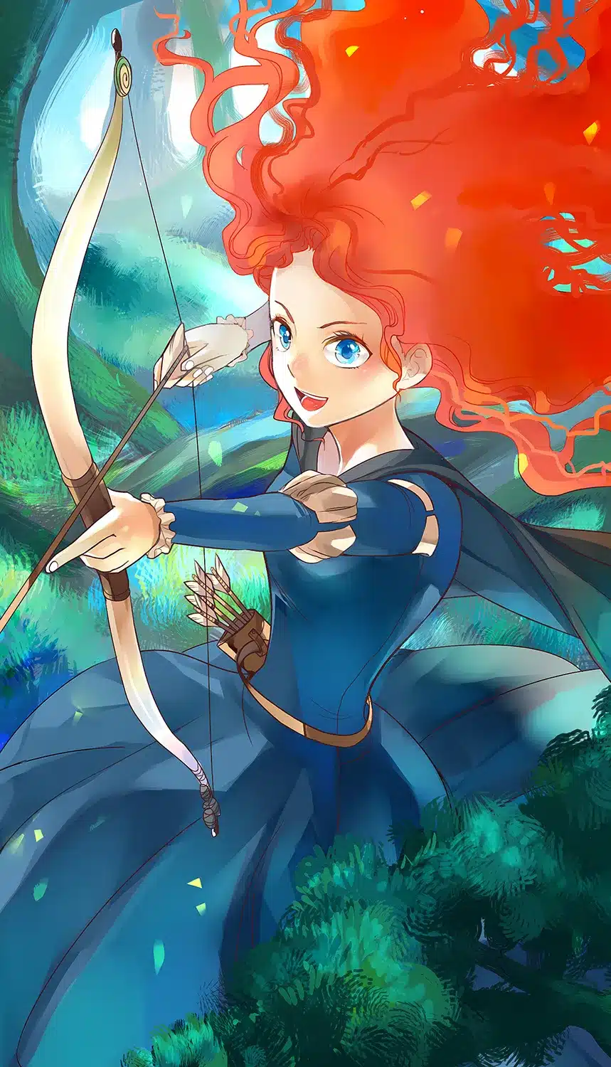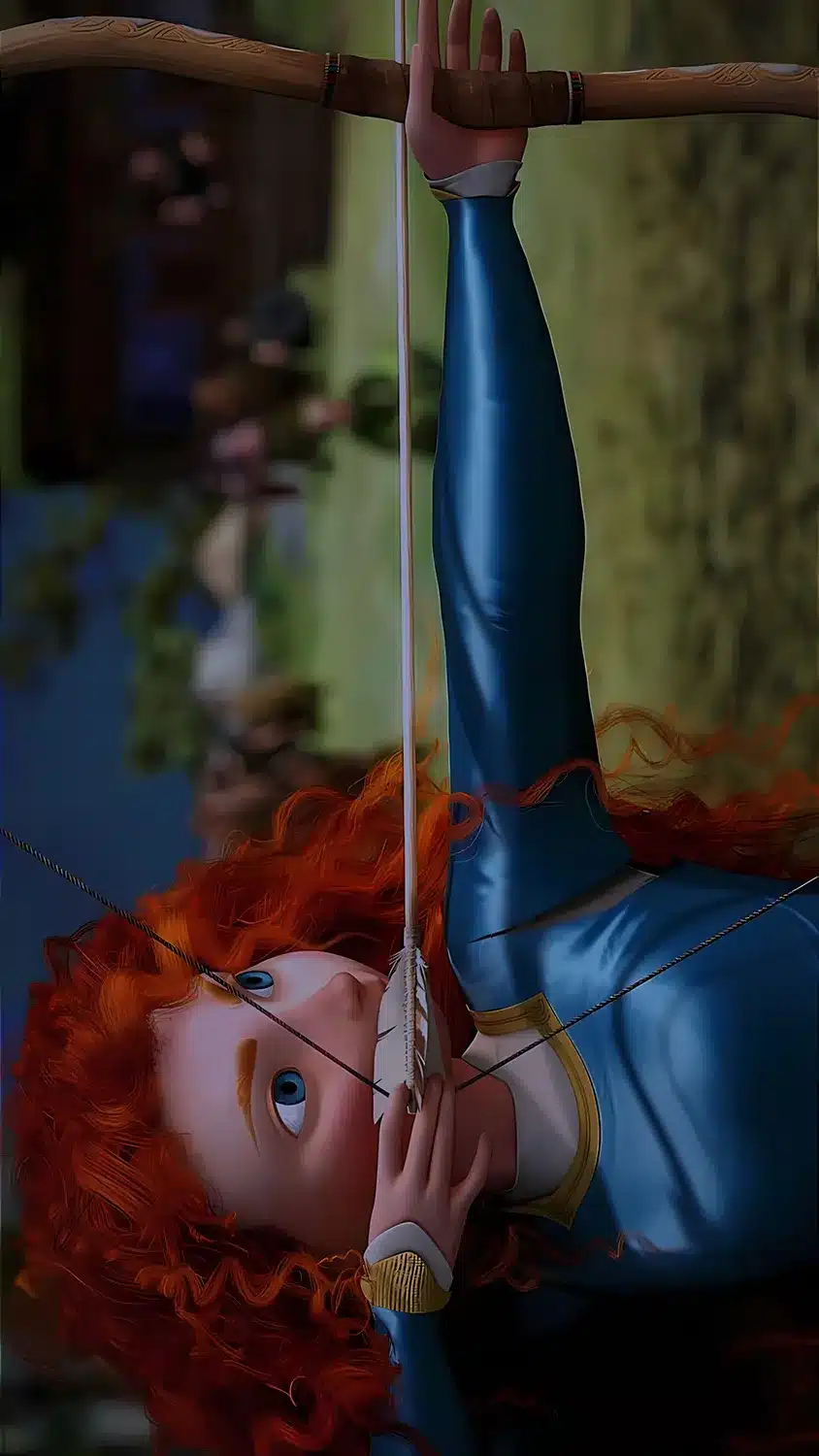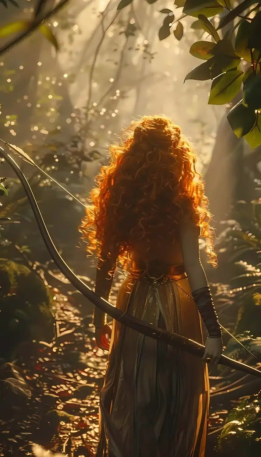 پرنسس مریدا با موهای افشان و کمانی کشیده در جنگل انیمیشن شجاع