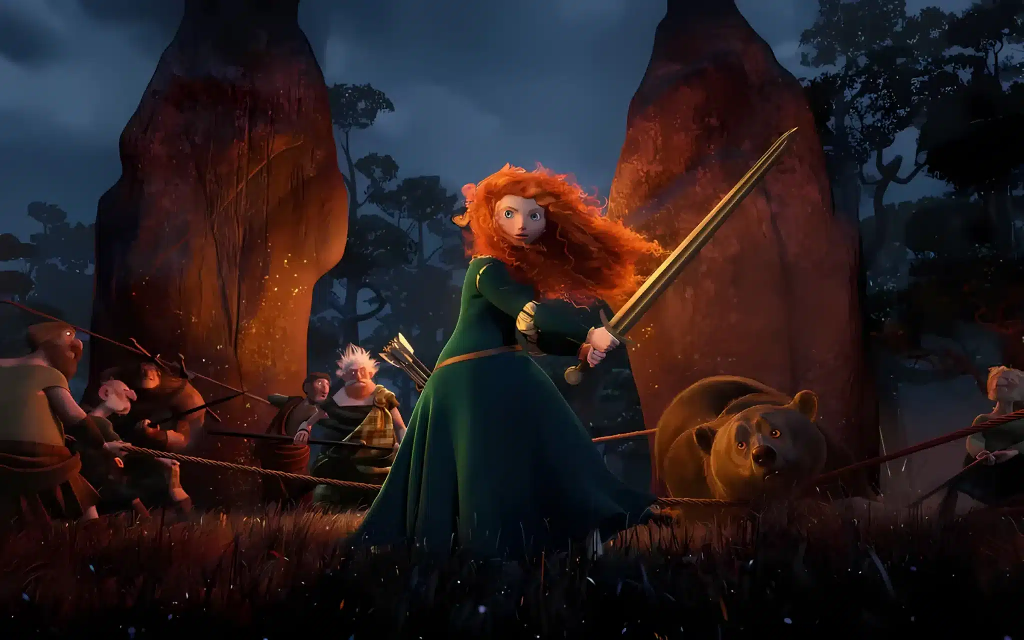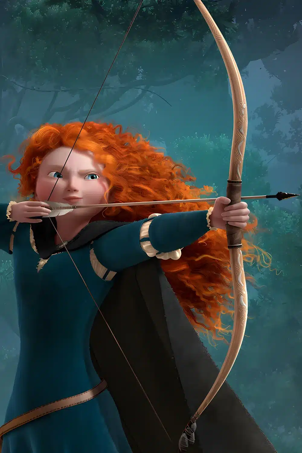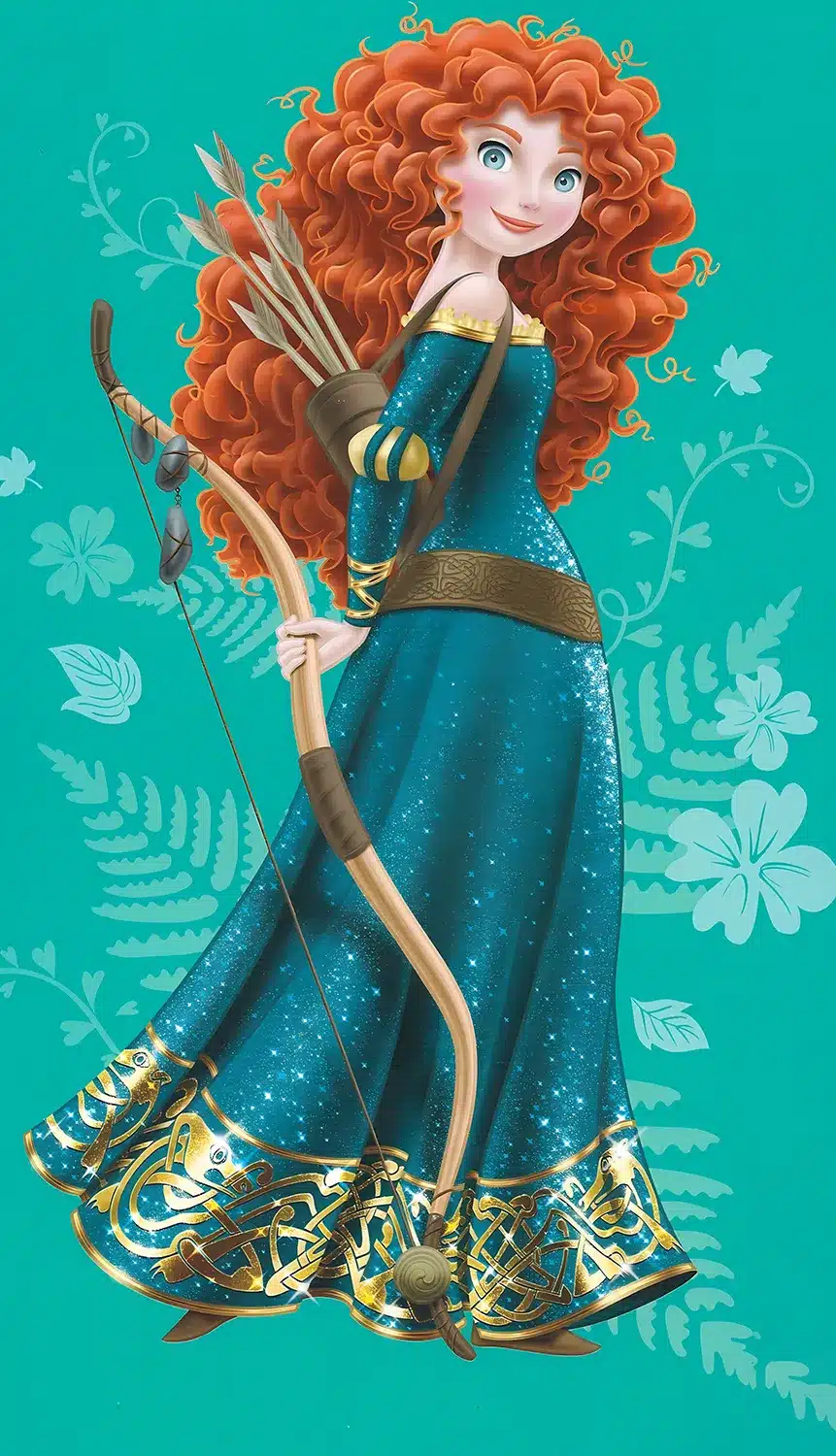 پرنسس مریدا با موهای افشان و کمانی کشیده در جنگل انیمیشن شجاع