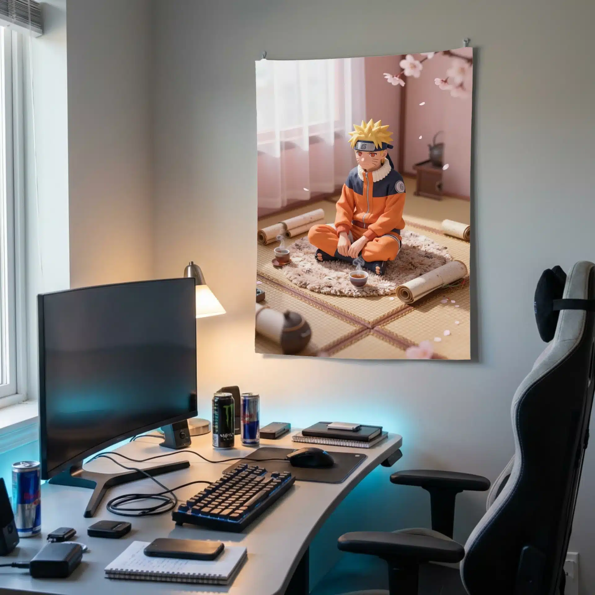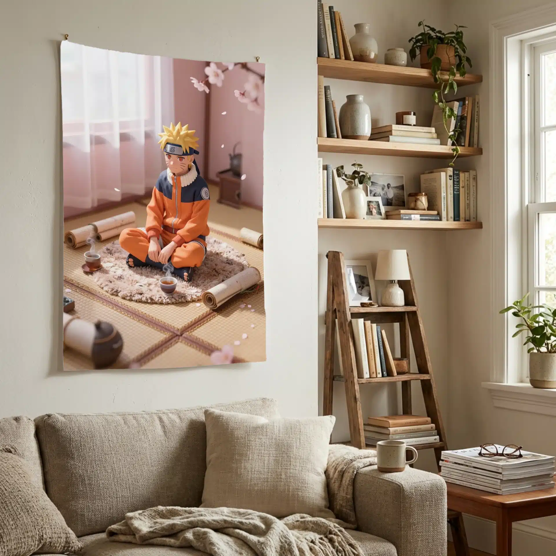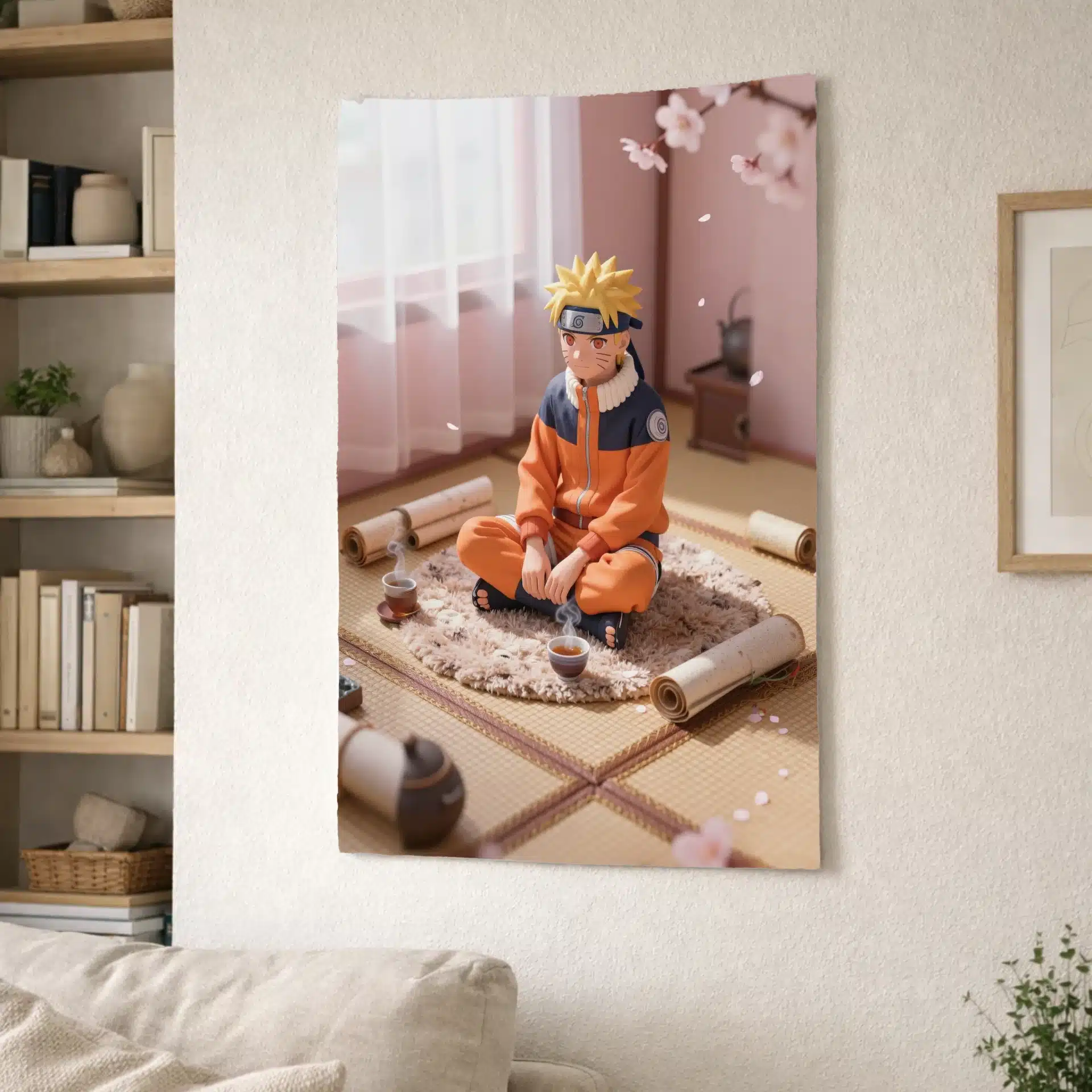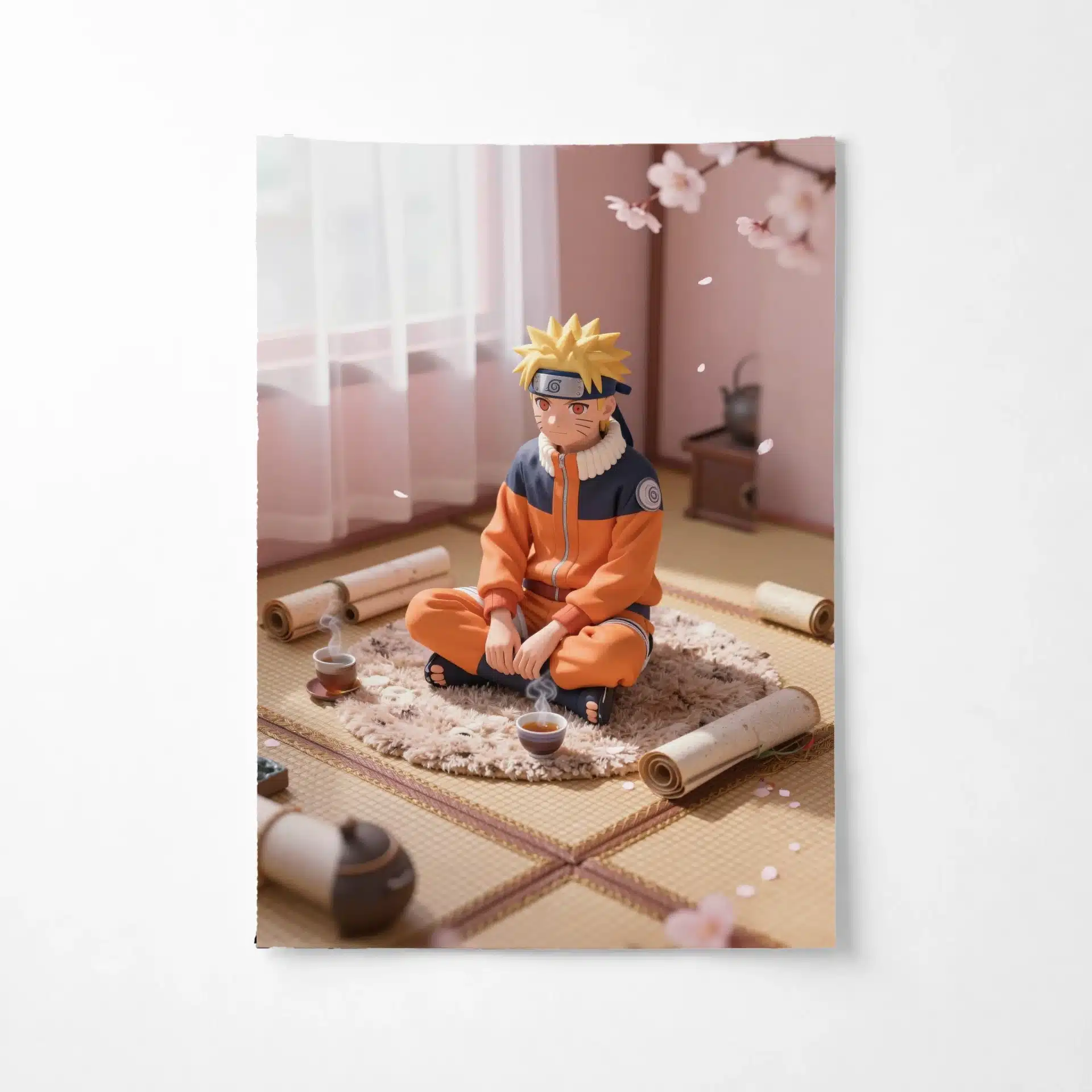 ناروتو در حالی که به صورت چهارزانو روی یک فرش نرم و بافتدار نشسته، در یک اتاق دنج با دیوارهای رنگپاستلی و نور طبیعی ملایم روز قرار دارد. اطراف او پر از طومارهای پراکنده و یک فنجان چای داغ است که حال و هوایی آرام و صمیمی را ایجاد میکند.