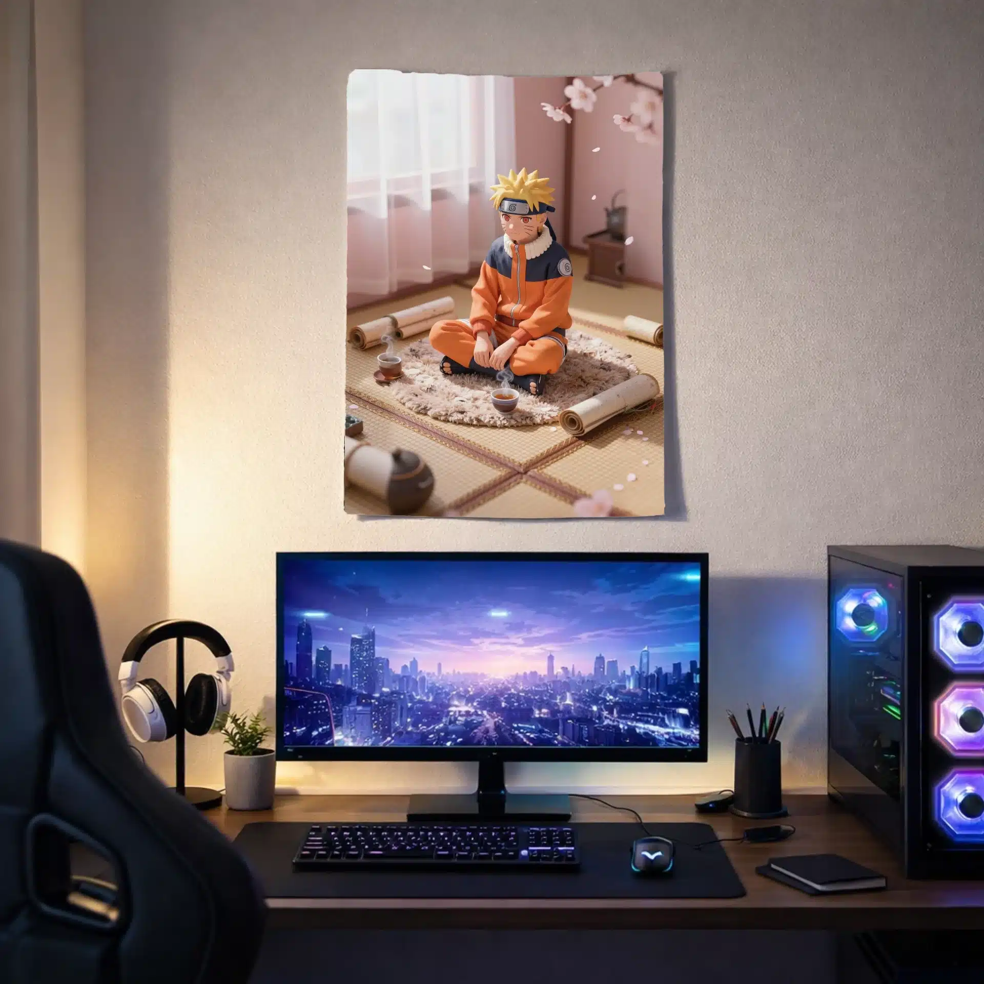 طرح این بکدراپ با نور ملایم و سایههای نرم روی حصیرهای تاتامی، همراه با گلهای گیلاس شناور در هوا، فضایی رویایی و مینیاتوری خلق کرده است. ژاکت نارنجی ناروتو در تضاد با رنگهای ملایم محیط، جلوهای جذاب و انیمهای به تصویر میدهد.