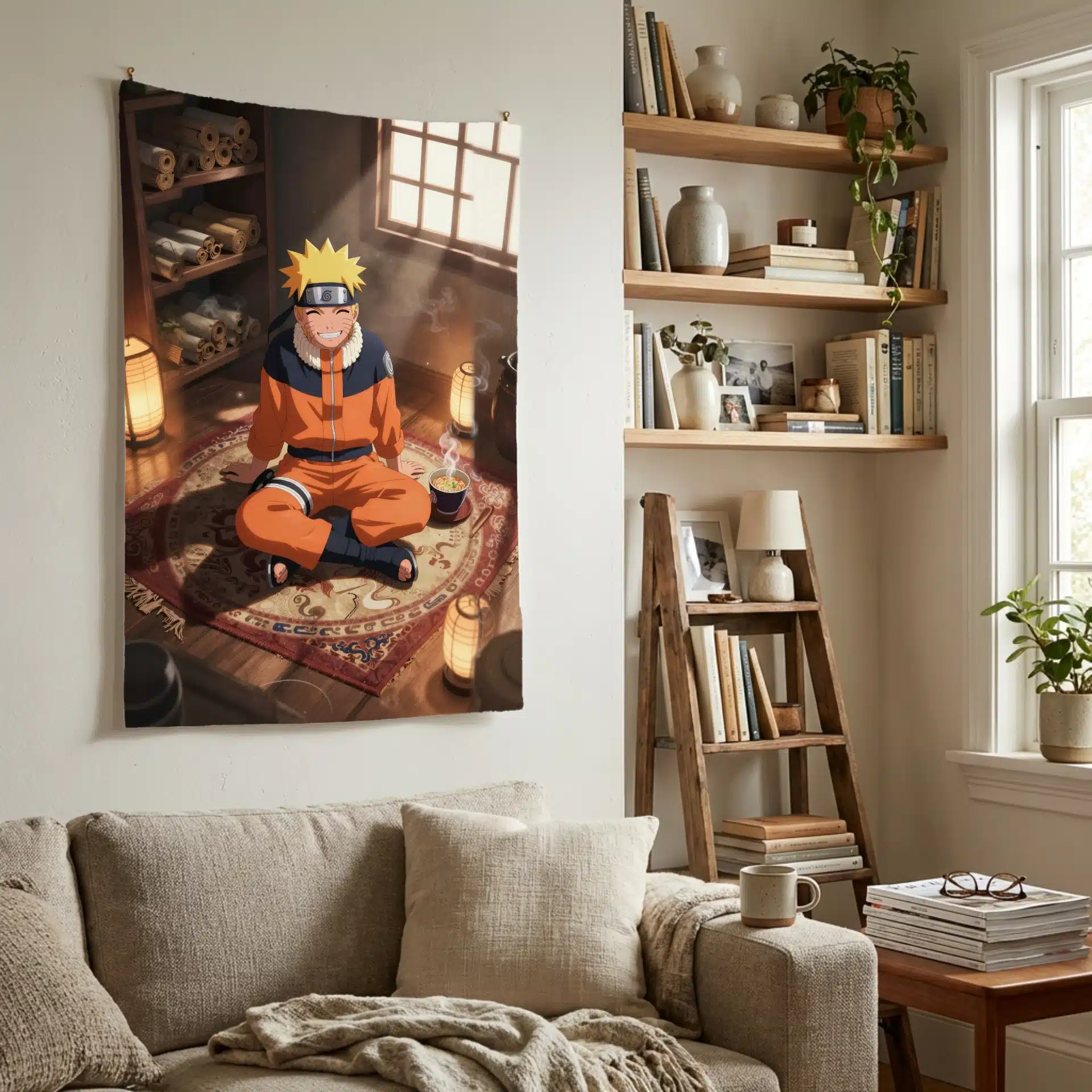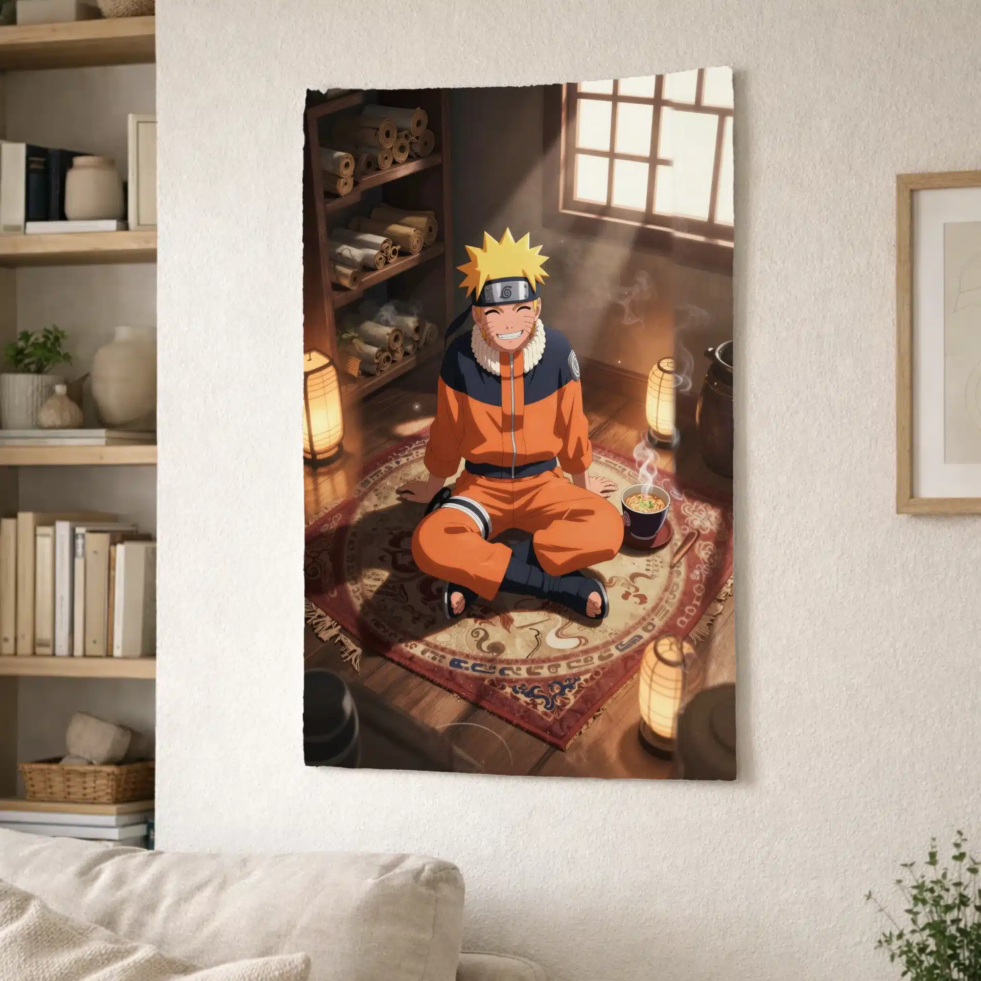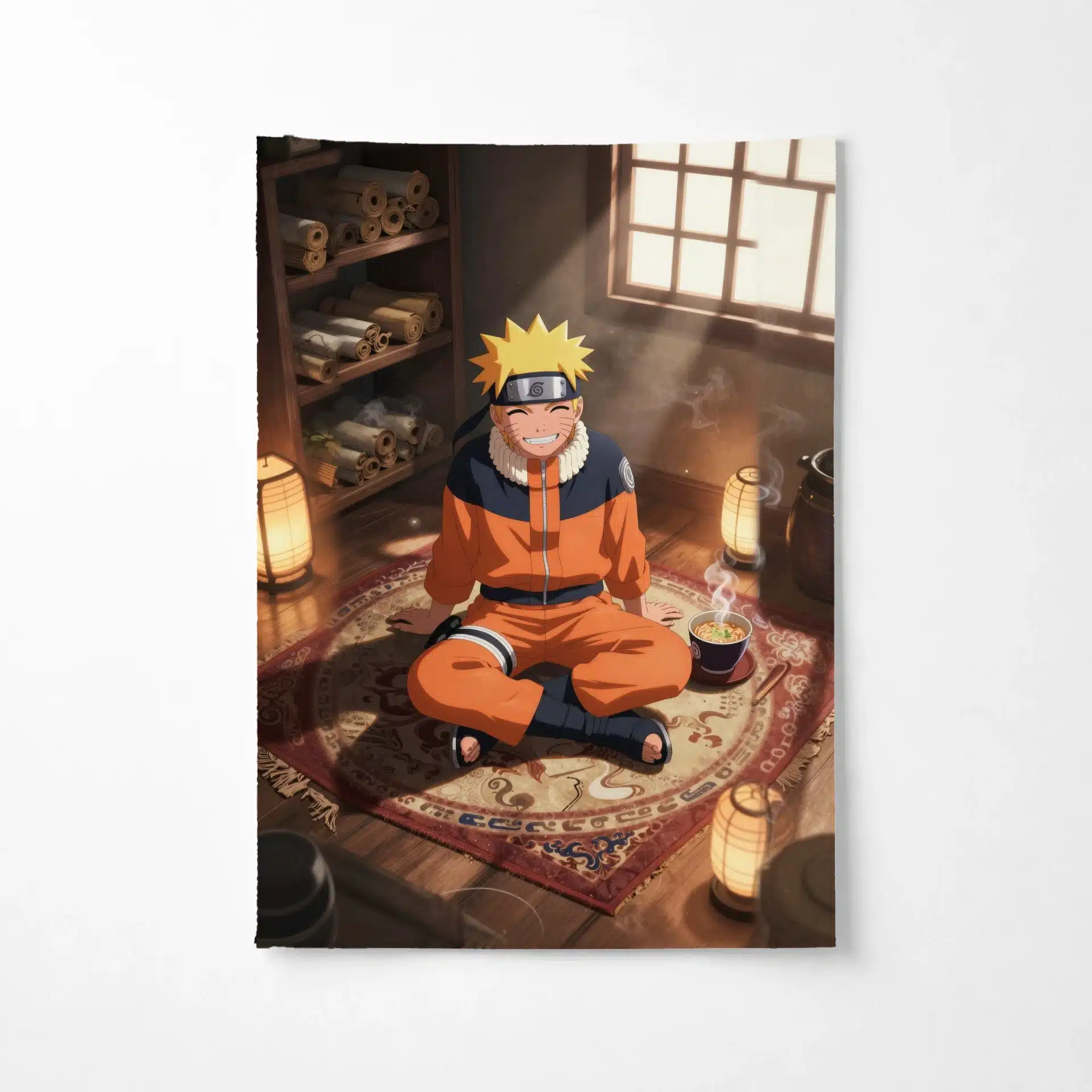 ناروتو اوزوماکی در این تصویر با حالتی آرام و مطمئن روی یک فرش نرم و طرحدار نشسته است. نور گرم و مهآلود پنجره، فضایی رویایی و صمیمی ایجاد کرده و انعکاسهای زیبایی روی کف چوبی اتاق میاندازد. این صحنه با جزئیات غنی و نورپردازی چشمنواز، انرژی منحصربهفرد ناروتو را به نمایش میگذارد.