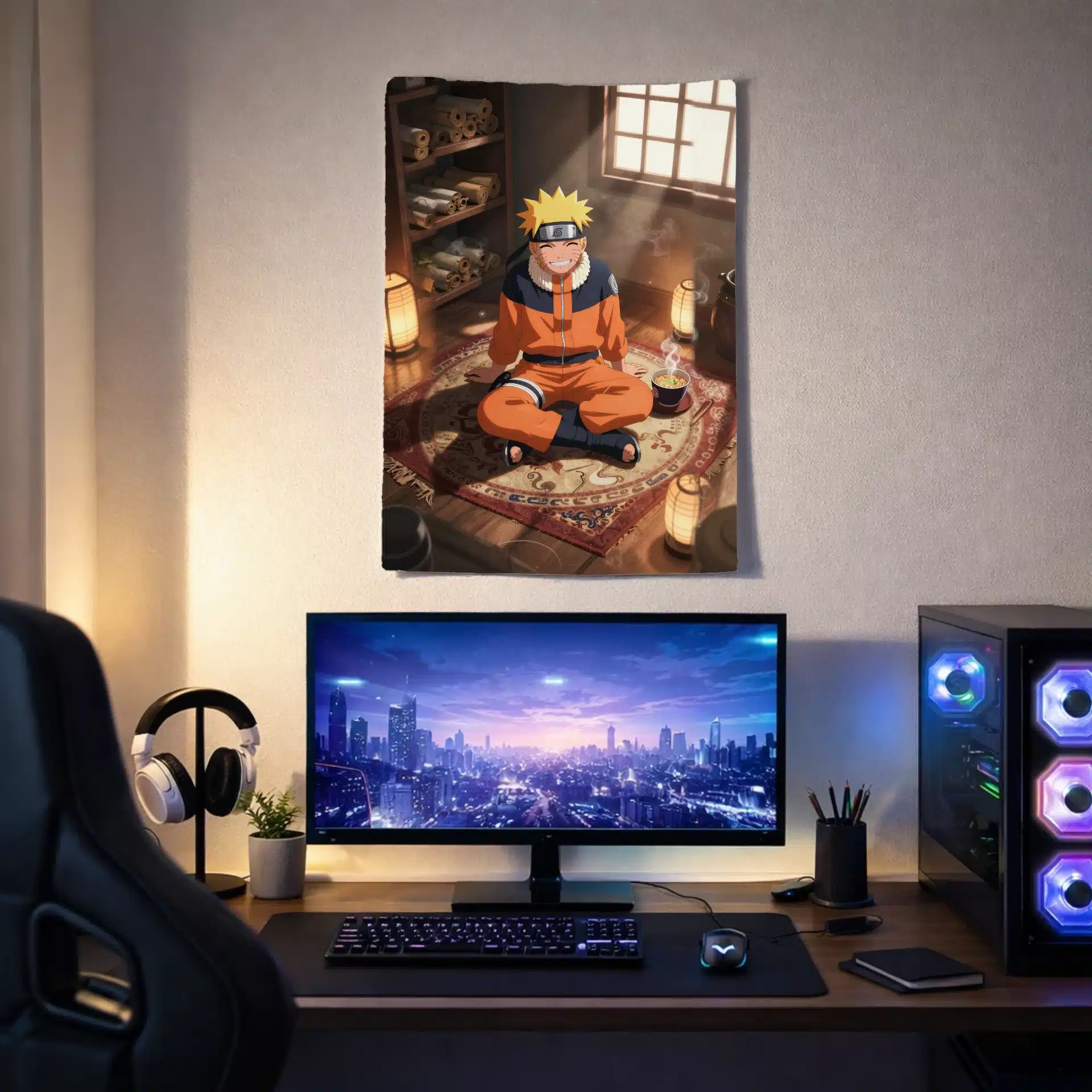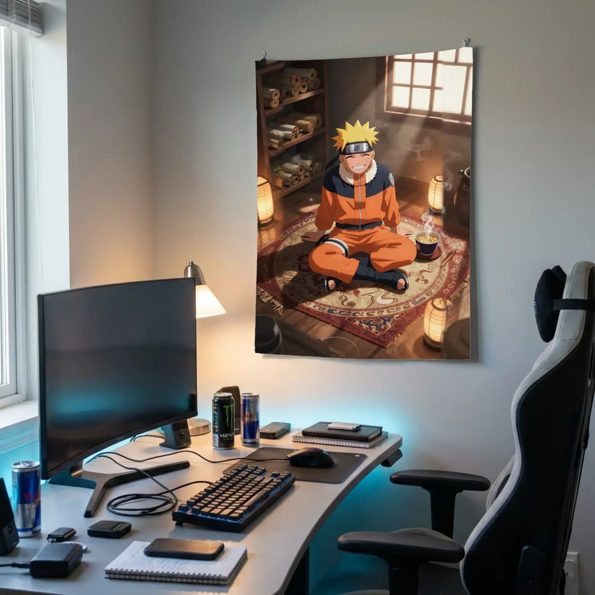 طرح این بکدراپ با نورپردازی کنتراست بالا و سایههای عمیق، لباس نارنجی روشن و موهای بلوند ناروتو را برجسته میکند. قفسههای پر از طومار، فانوسهای روشن و یک کاسه رامن داغ در کنار او، فضایی پرجزئیات و پویا خلق کردهاند.