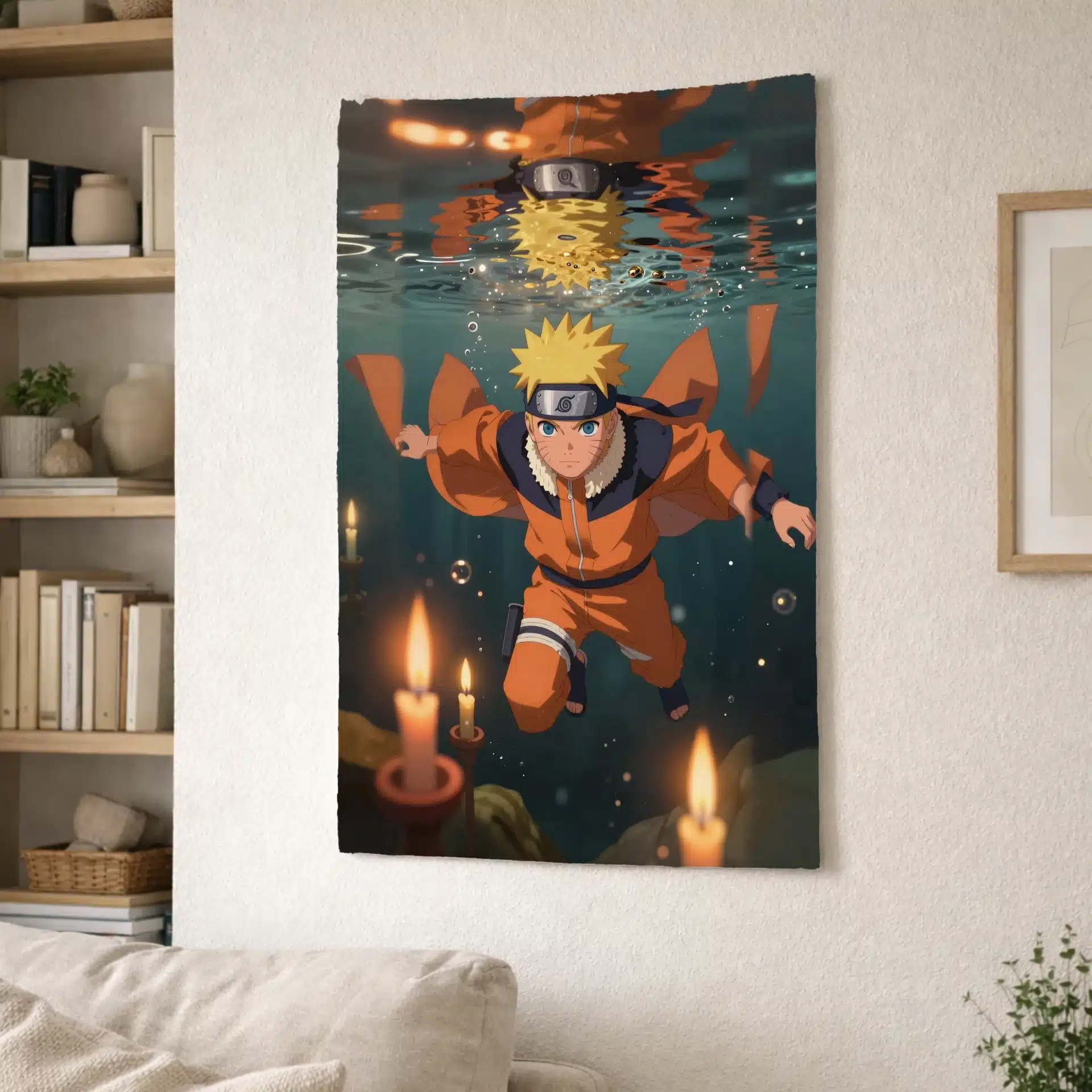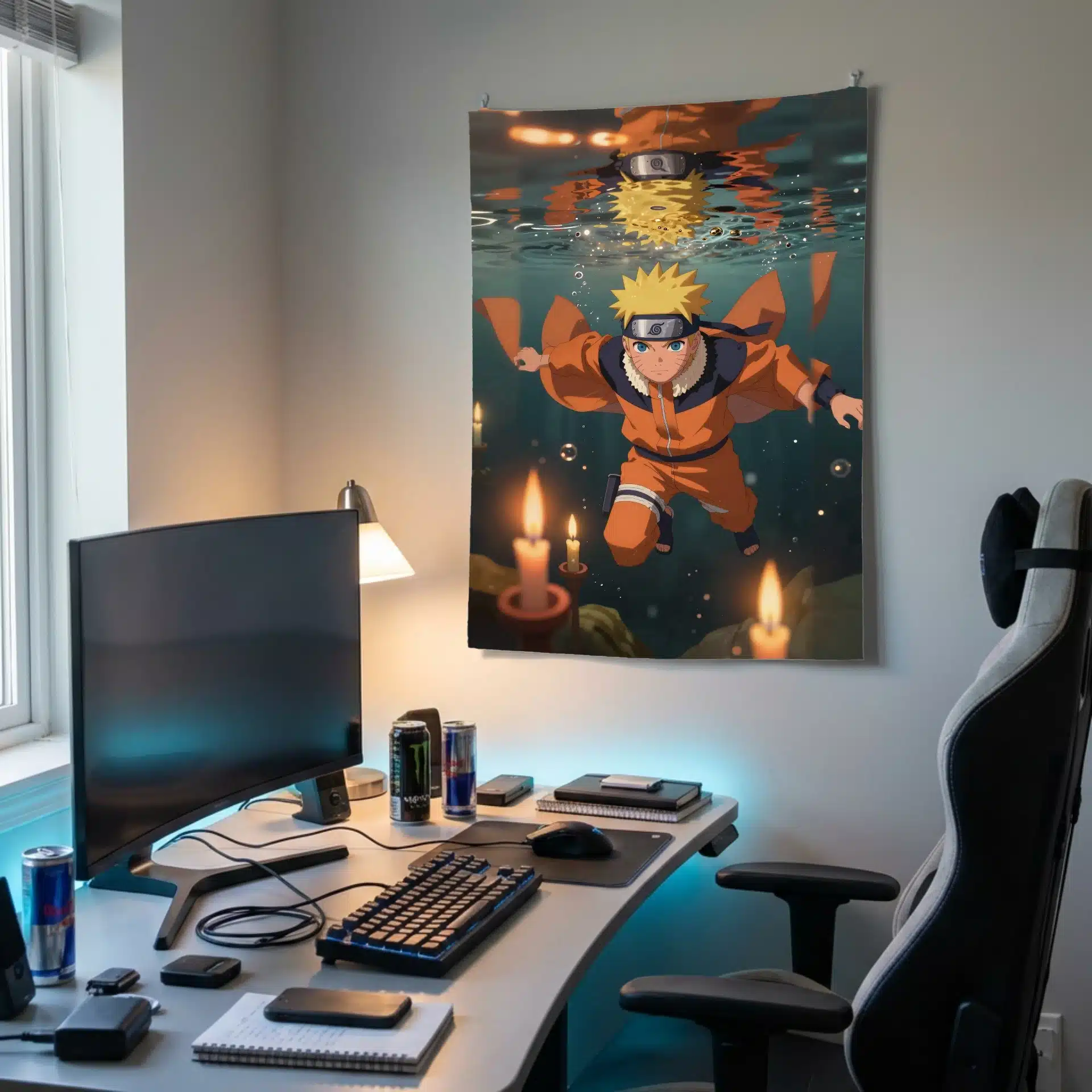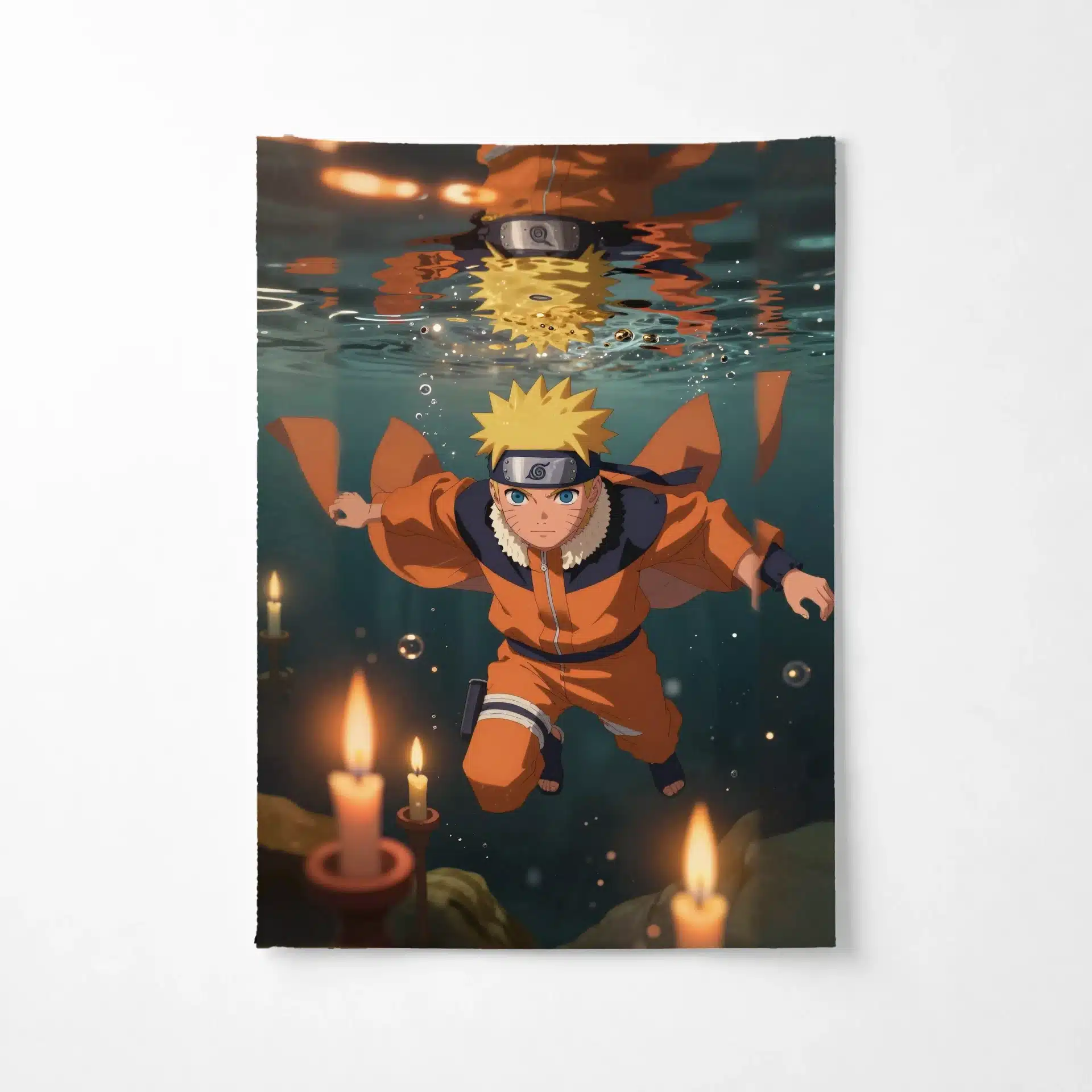 در این بکدراپ خیرهکننده، ناروتو اوزوماکی در یک صحنه زیرآبی رویایی غوطهور شده است. نور گرم شمعها که از میان آب میدرخشد، سایههایی از نارنجی و طلایی بر چهره مصمم او میاندازد و فضایی جادویی خلق میکند.