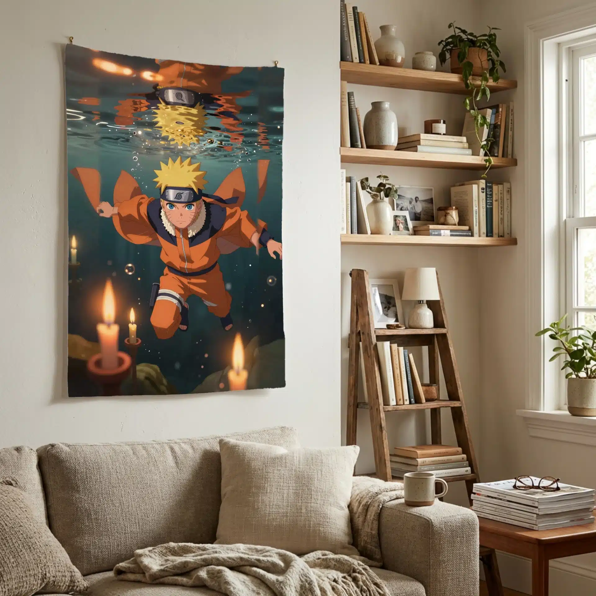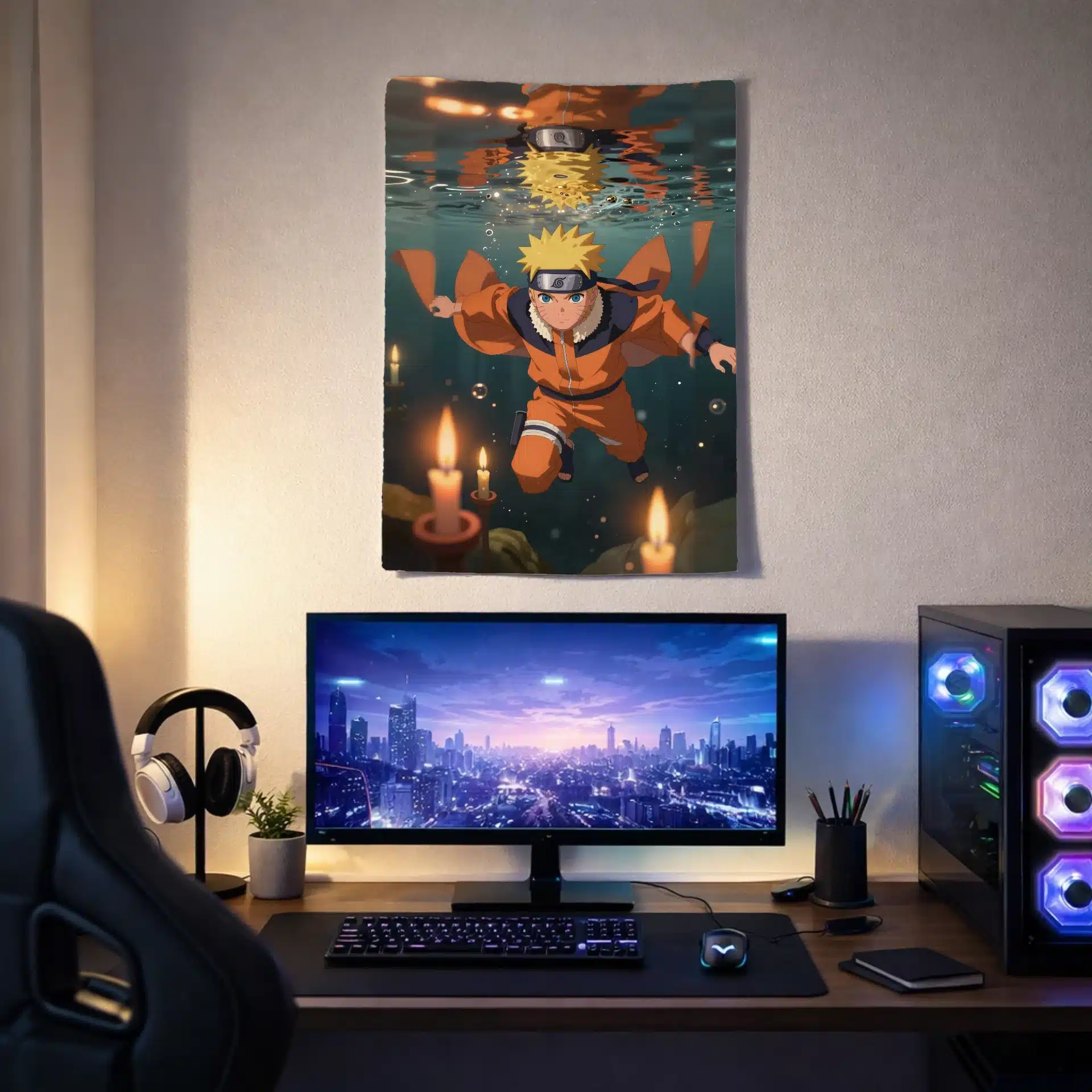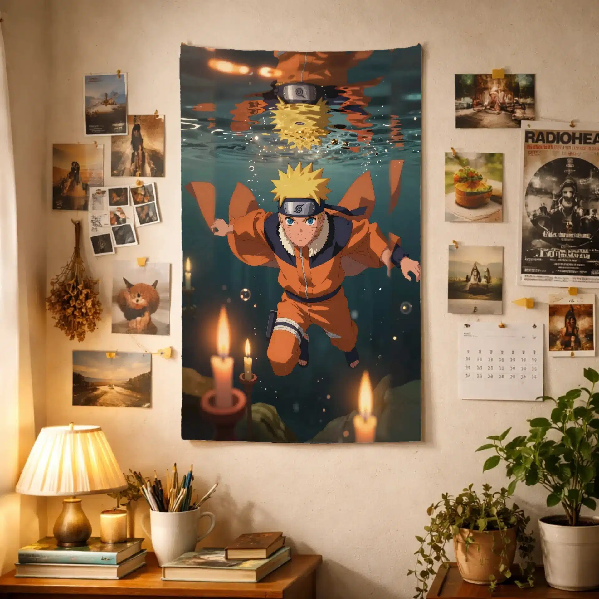 در این بکدراپ خیرهکننده، ناروتو اوزوماکی در یک صحنه زیرآبی رویایی غوطهور شده است. نور گرم شمعها که از میان آب میدرخشد، سایههایی از نارنجی و طلایی بر چهره مصمم او میاندازد و فضایی جادویی خلق میکند.