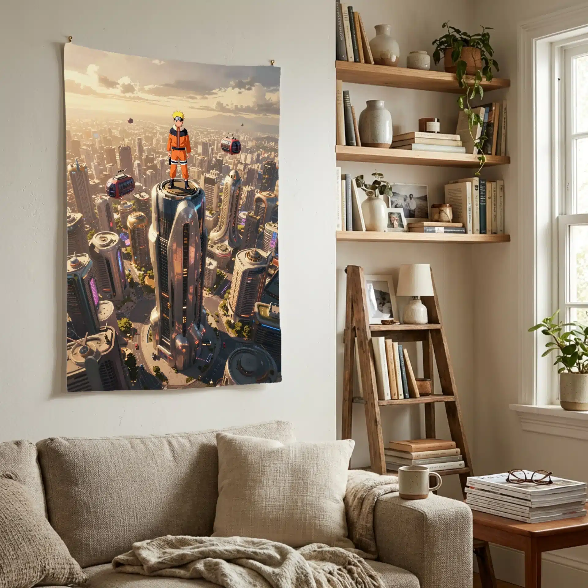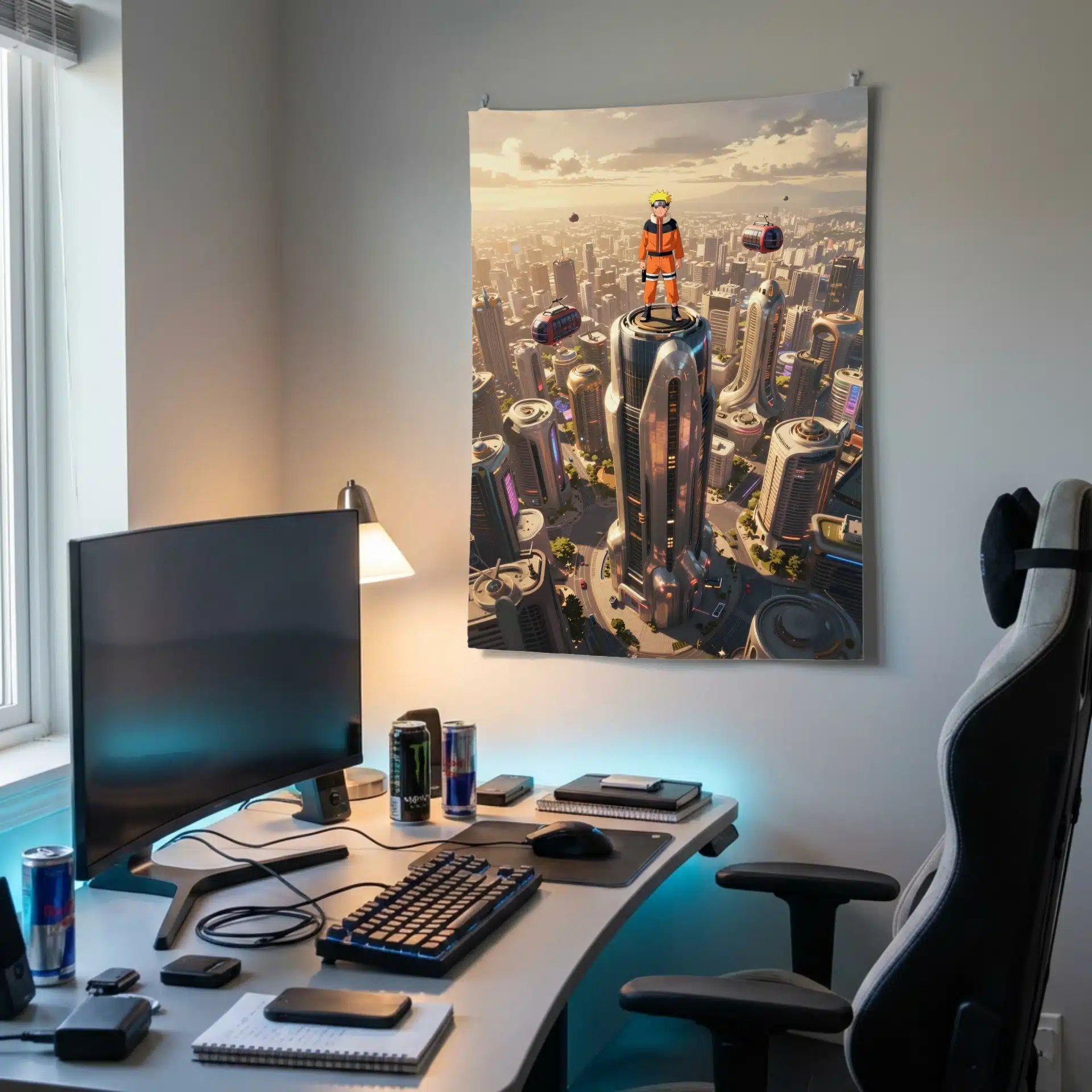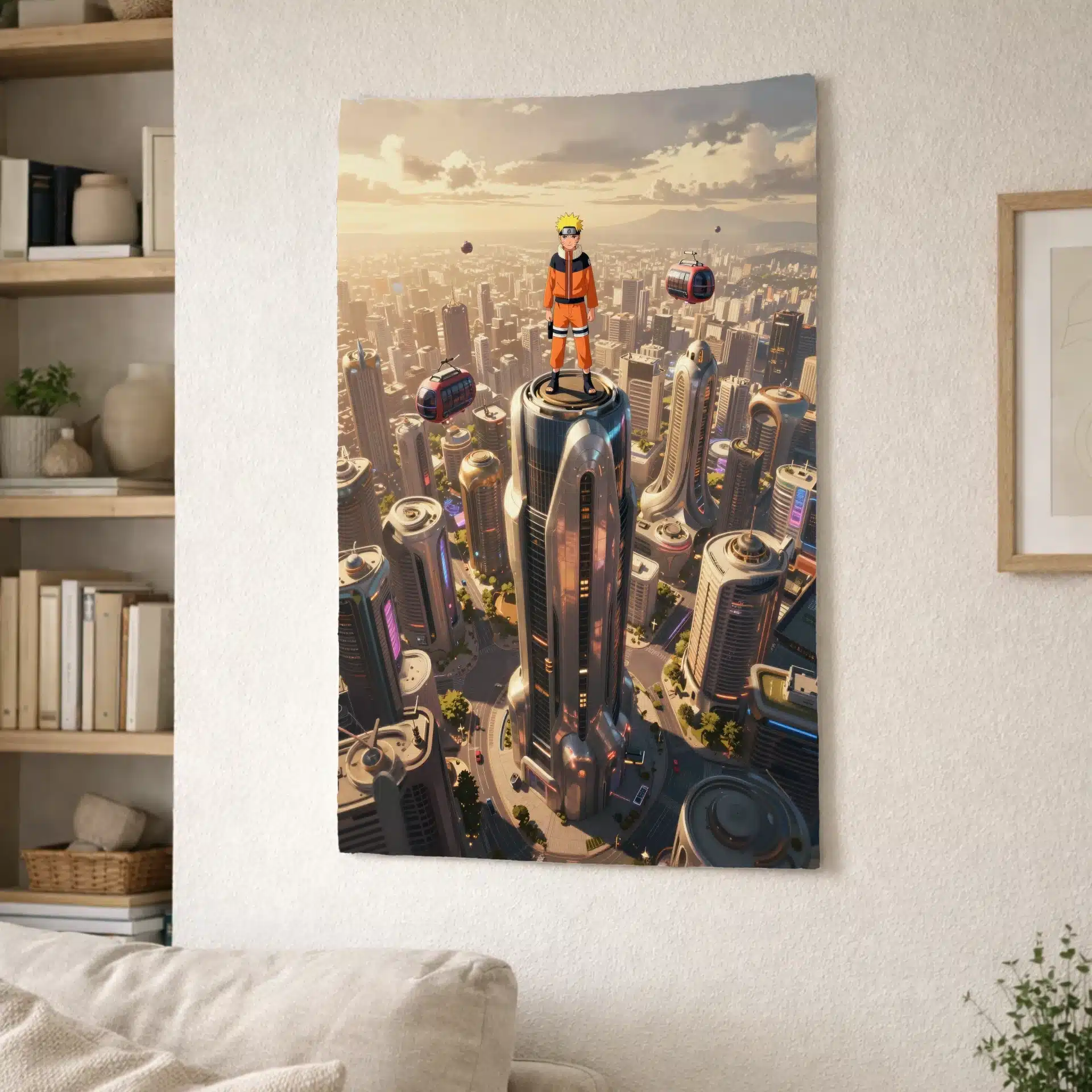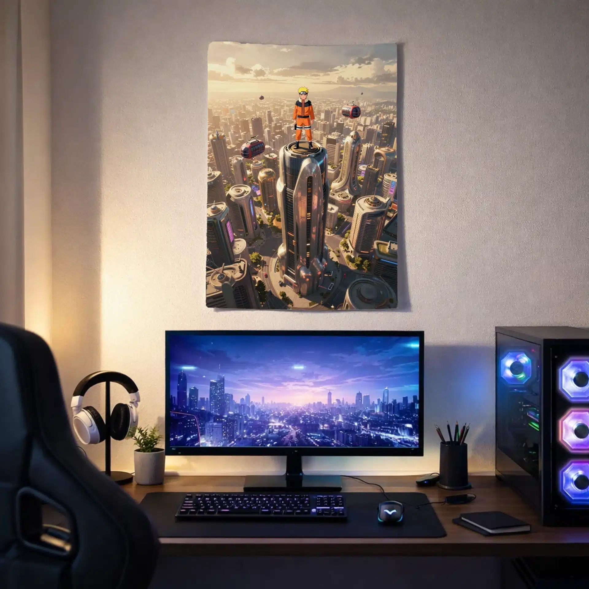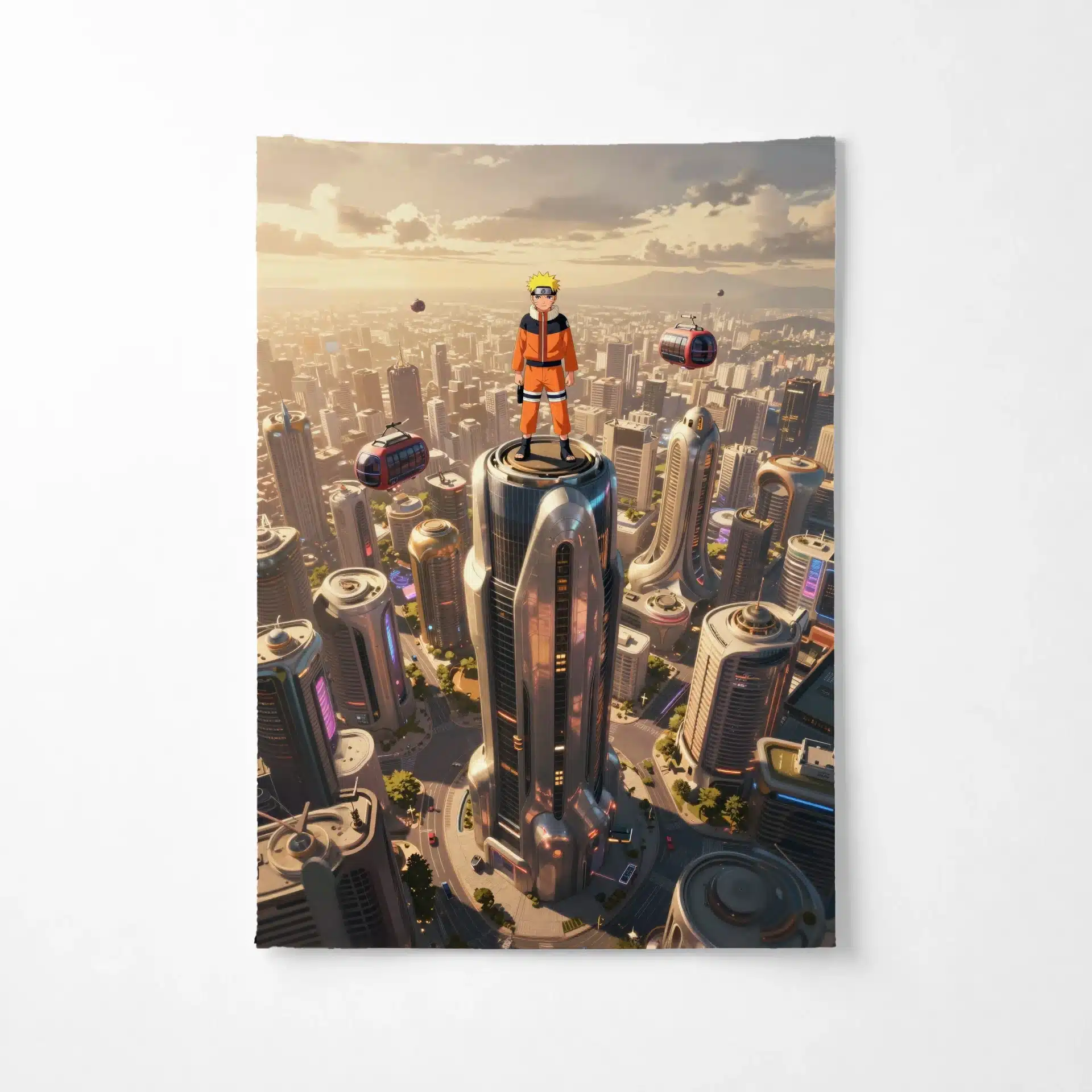 ناروتو بر فراز یک آسمانخراش مدرن و آیندهنگر در شهری پهناور ایستاده است، در حالی که نور طلایی آسمان ابری او را در بر گرفته است. این تصویر ترکیبی جذاب از معماری ارگانیک و خیابانهای نئونی را نشان میدهد که با انرژی پویای ناروتو هماهنگ شدهاند.
