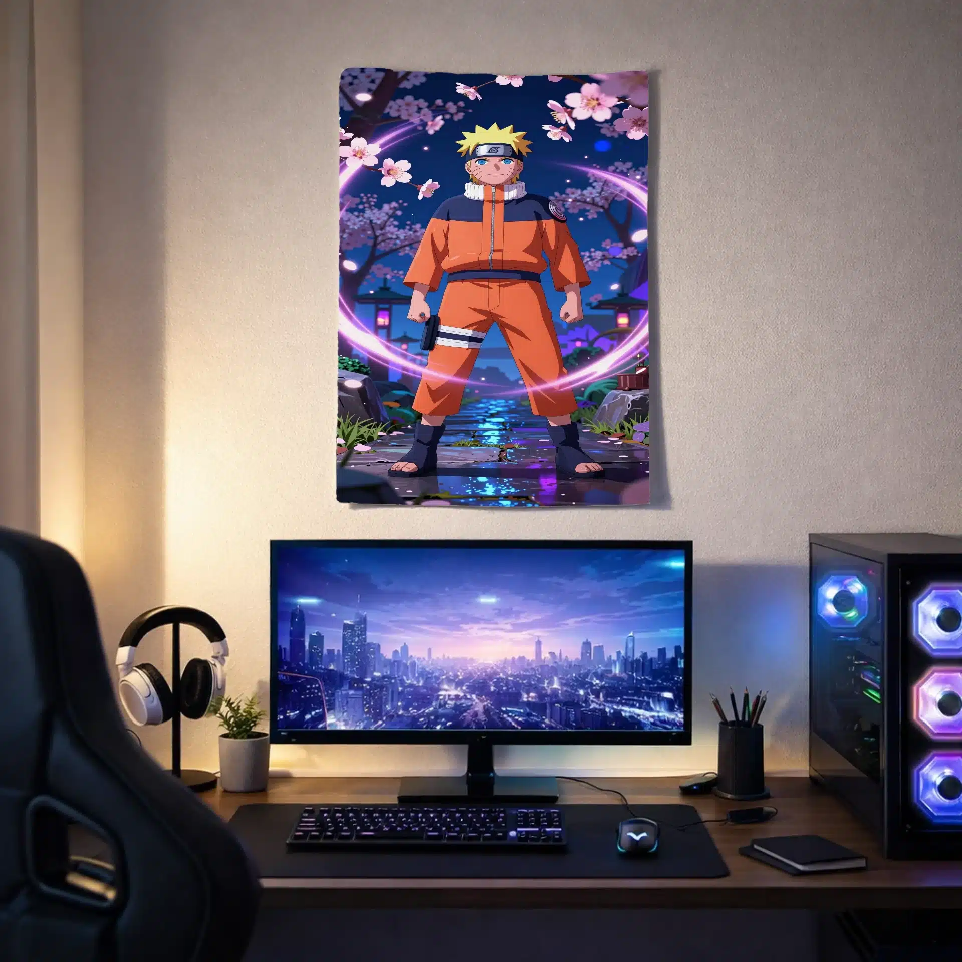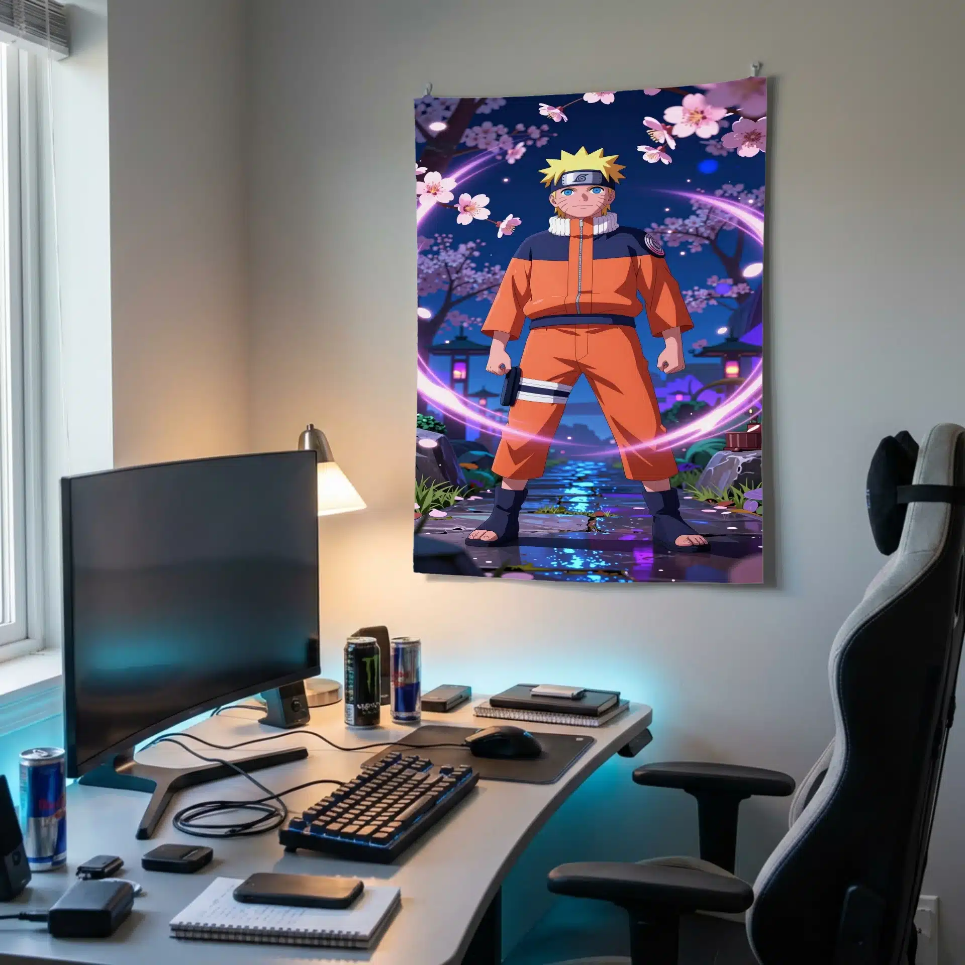 در این بکدراپ خیرهکننده، ناروتو اوزوماکی با اعتماد به نفس در باغی پر از نورهای نئون و شکوفههای گیلاس درخشان ایستاده است. این صحنه ترکیبی منحصر به فرد از دنیای نینجاهای سنتی و عناصر فانتزی نئونی را به نمایش میگذارد و روحیه نمادین ناروتو را در لحظهای پرجنبوجوش و رویایی به تصویر میکشد.